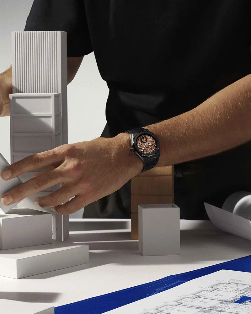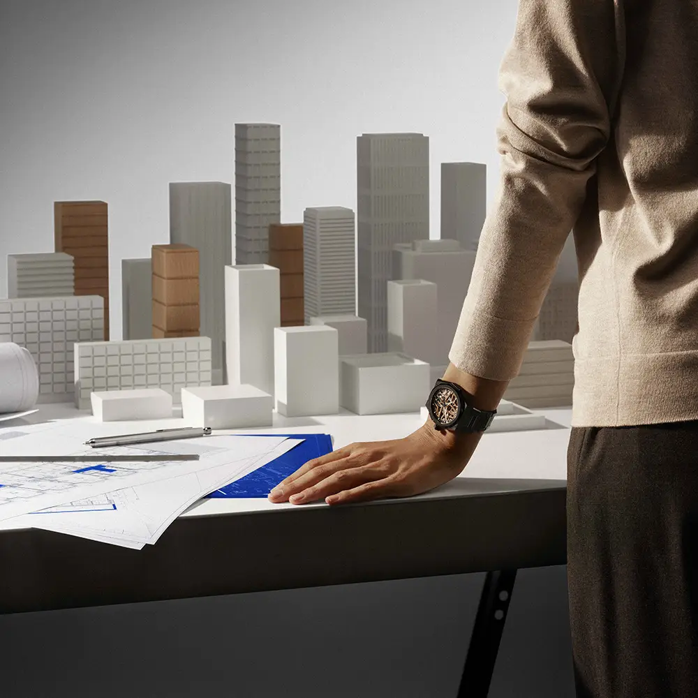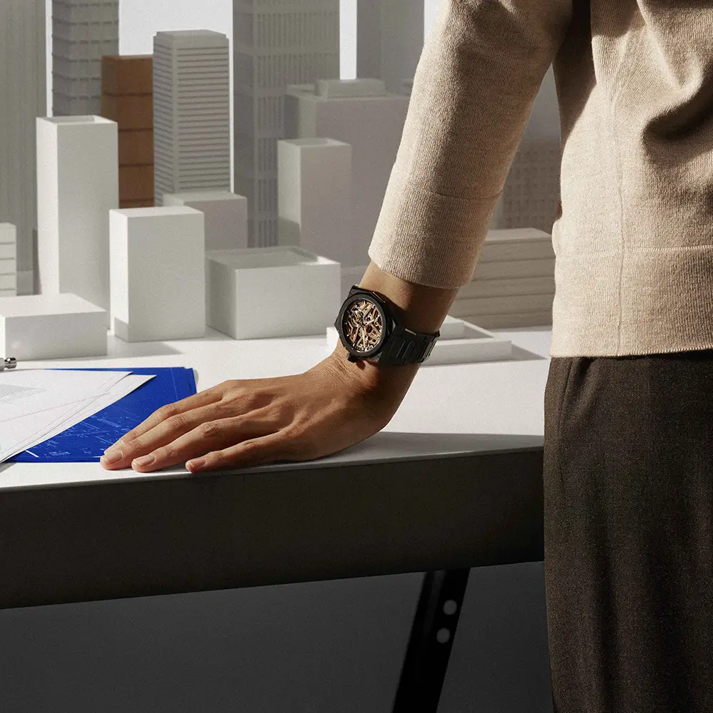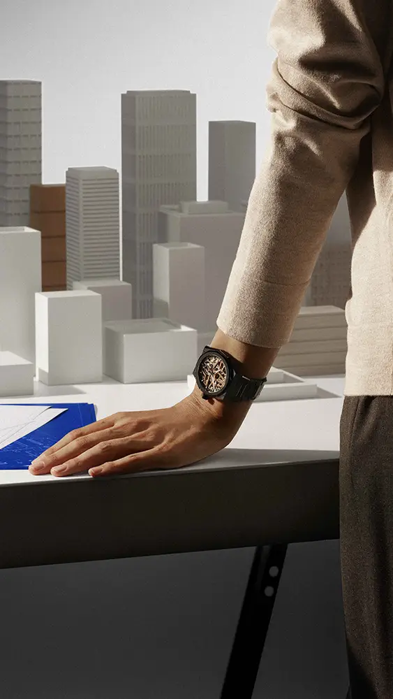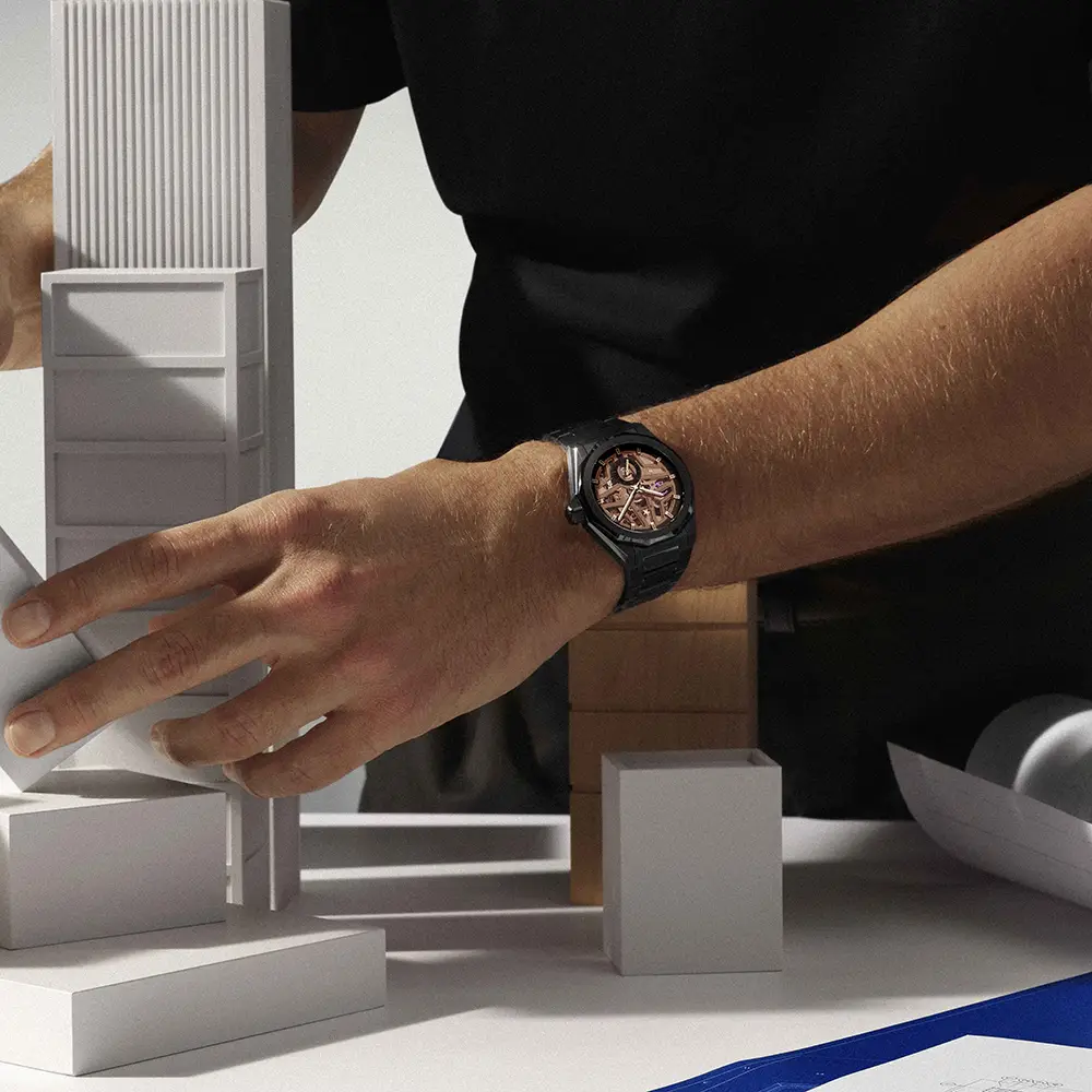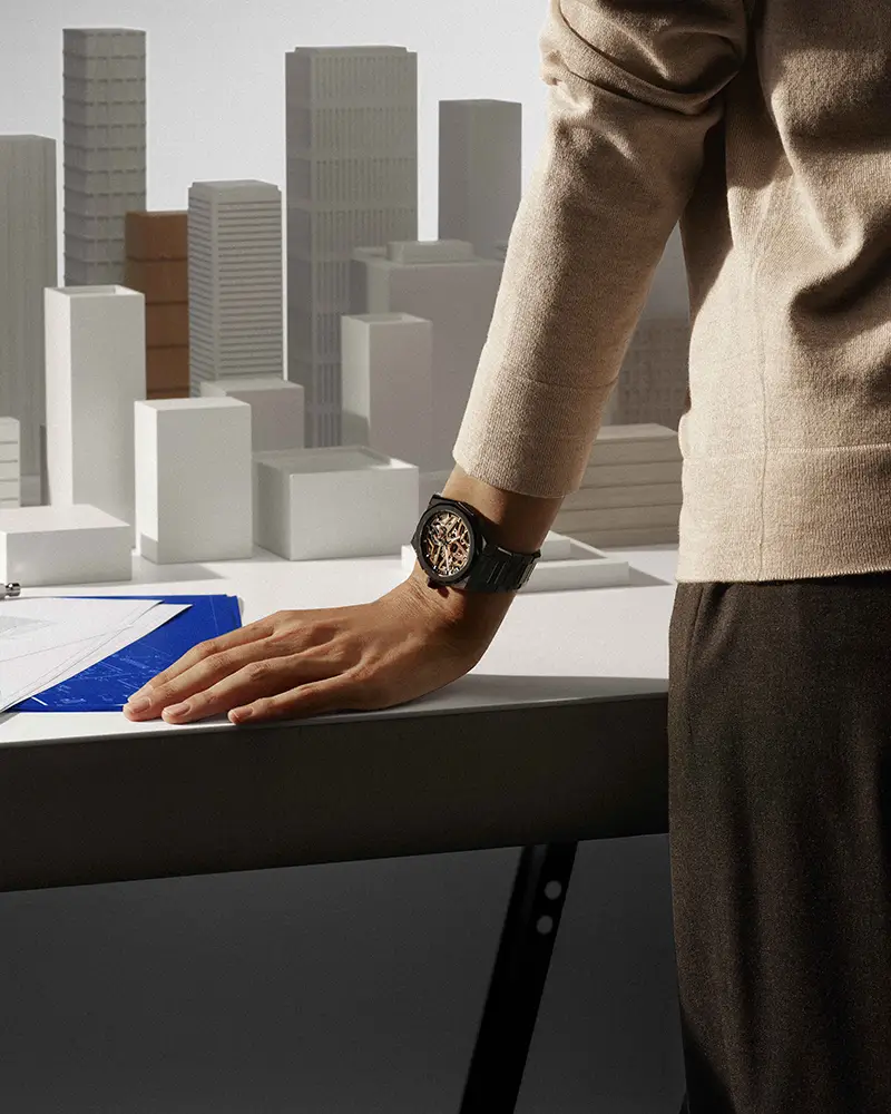 Con un diseño moderno y versátil, esta nueva edición cuenta con un brazalete integrado de cerámica negra que prolonga la elegante geometría de la caja, creando una silueta arquitectónica perfecta. También se incluye una correa de caucho con motivo negro, fácilmente intercambiable gracias al intuitivo mecanismo de cambio rápido de correa sin necesidad de herramientas, un guiño a la adaptabilidad de la vida urbana contemporánea.