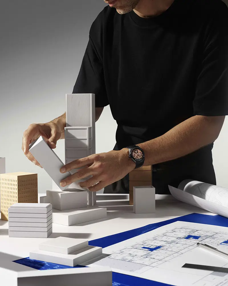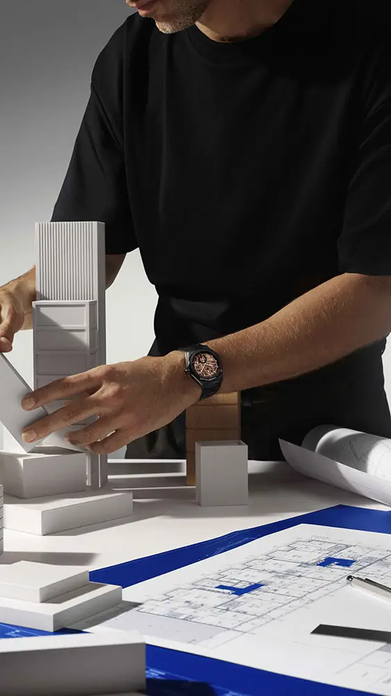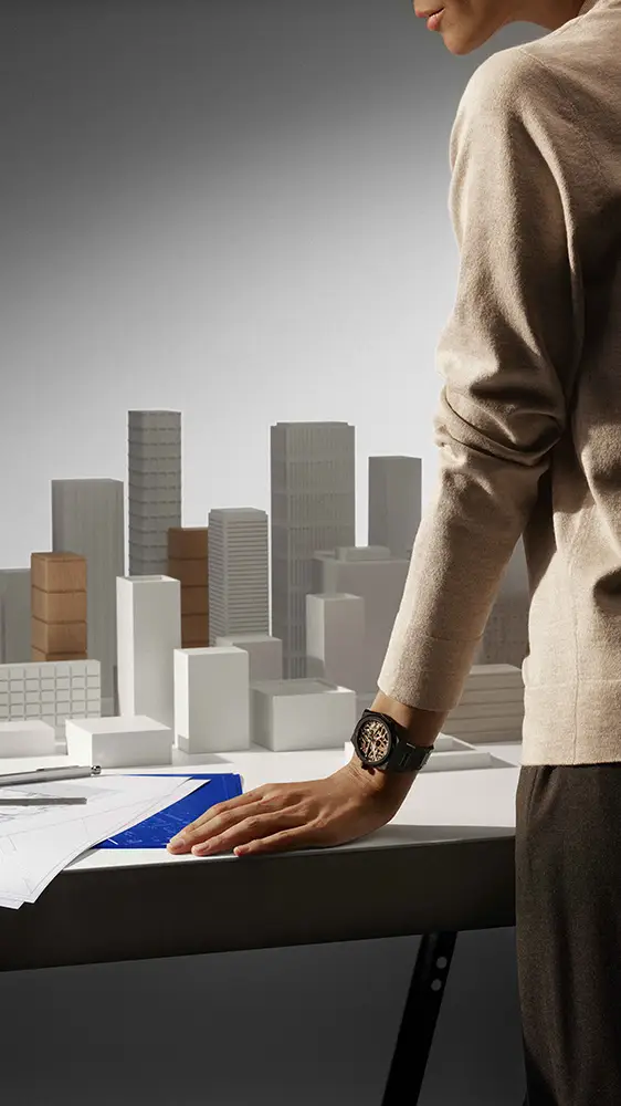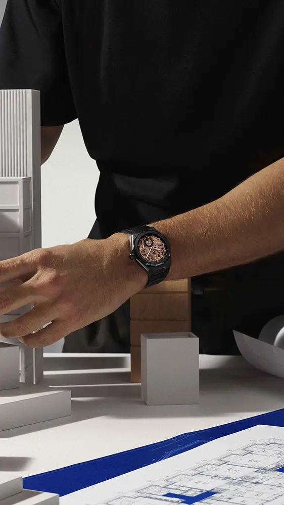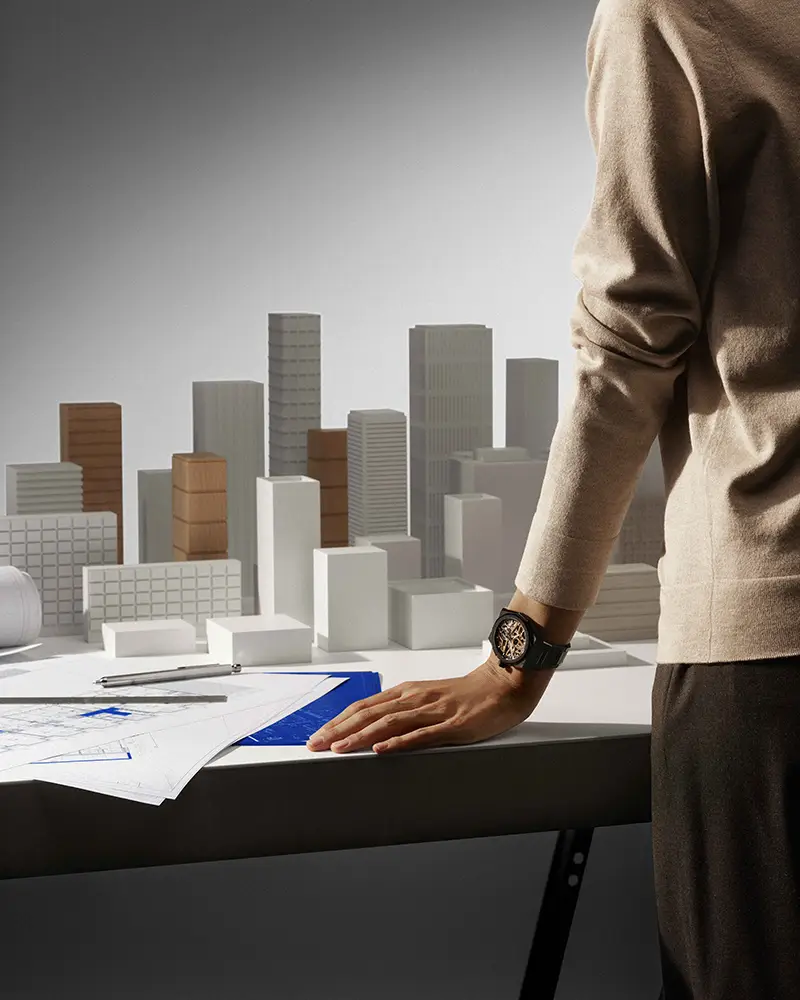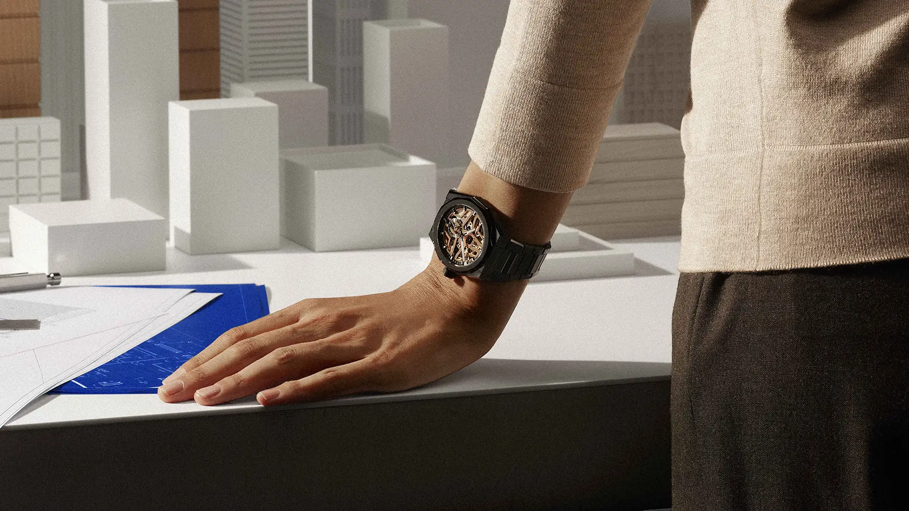 Con un diseño moderno y versátil, esta nueva edición cuenta con un brazalete integrado de cerámica negra que prolonga la elegante geometría de la caja, creando una silueta arquitectónica perfecta. También se incluye una correa de caucho con motivo negro, fácilmente intercambiable gracias al intuitivo mecanismo de cambio rápido de correa sin necesidad de herramientas, un guiño a la adaptabilidad de la vida urbana contemporánea.