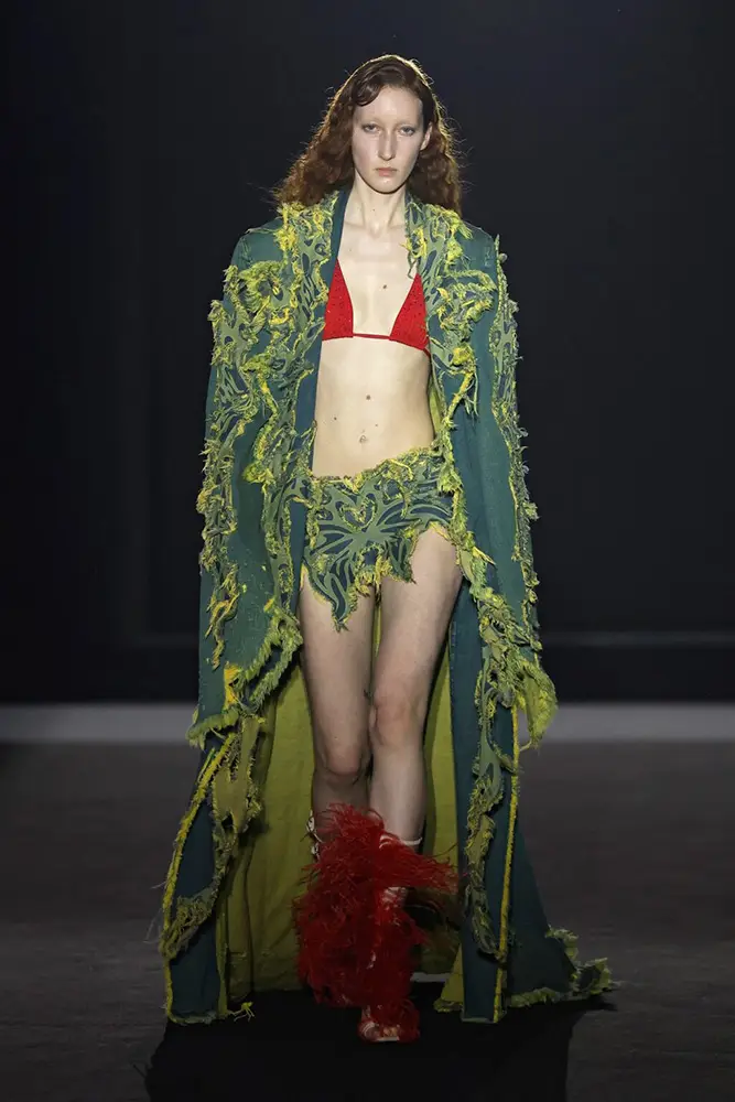 A través de volúmenes estructurados, tejidos innovadores y acabados de alta precisión, la colección de María Escoté se erige como una declaración de identidad que celebra el empoderamiento personal y la fuerza que todos llevamos dentro. Gracias a un meticuloso ejercicio de trabajo manual, la colección destaca por la utilización de drapeados en diversas texturas y formas. Este hilo conductor entre las prendas funciona como una reinterpretación contemporánea de la capa de Superman, evocando la idea de protección y poder a través de la moda.