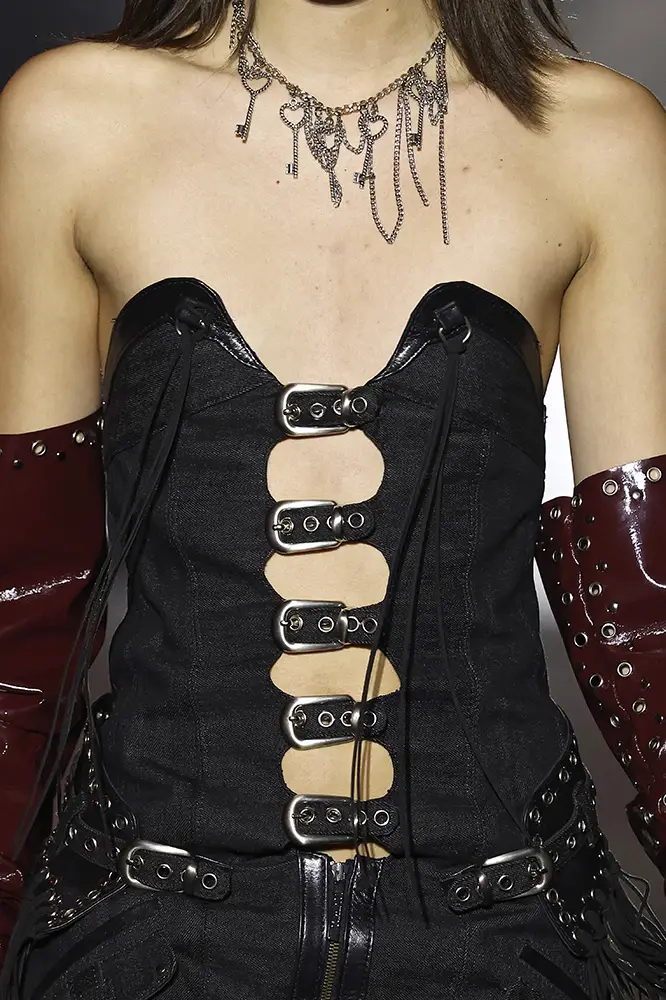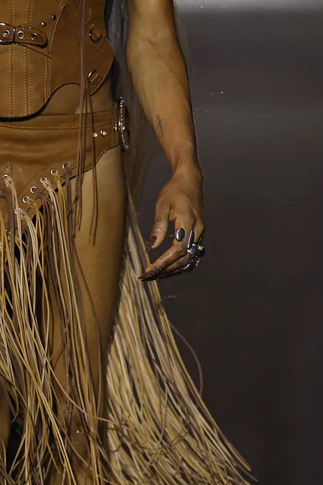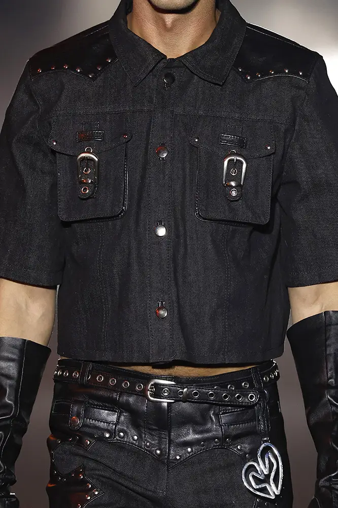 La línea masculina, diseñada en colaboración con CCELESTICA, se inspira en el estilo de los cowboys, subvirtiendo la rudeza y proyectando una visión moderna de la masculinidad. Destacan elementos como pantalones de ‘chap’ usados con ‘jockstrap’ y pequeños detalles que aluden a la estética homoerótica de los vaqueros.