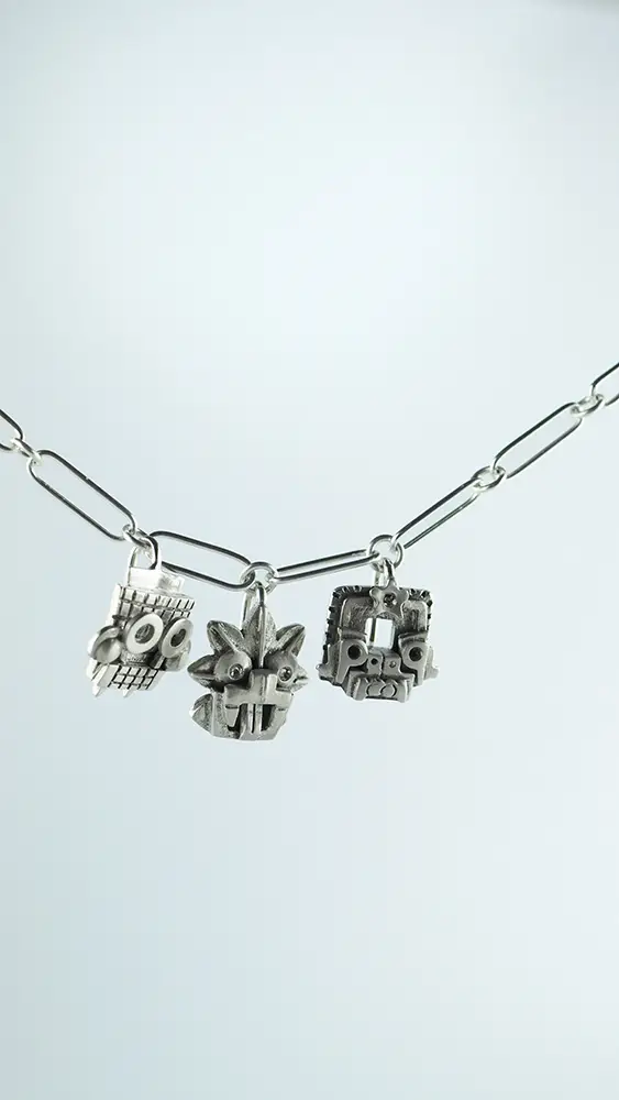 Amuletos reinterpreta figuras y deidades de la cultura de Teotihuacán en forma de joyas contemporáneas. Collares que parecen salidos de un museo, pero pensados para acompañar el presente. Pequeñas piezas arqueológicas que se llevan puestas como talismanes.