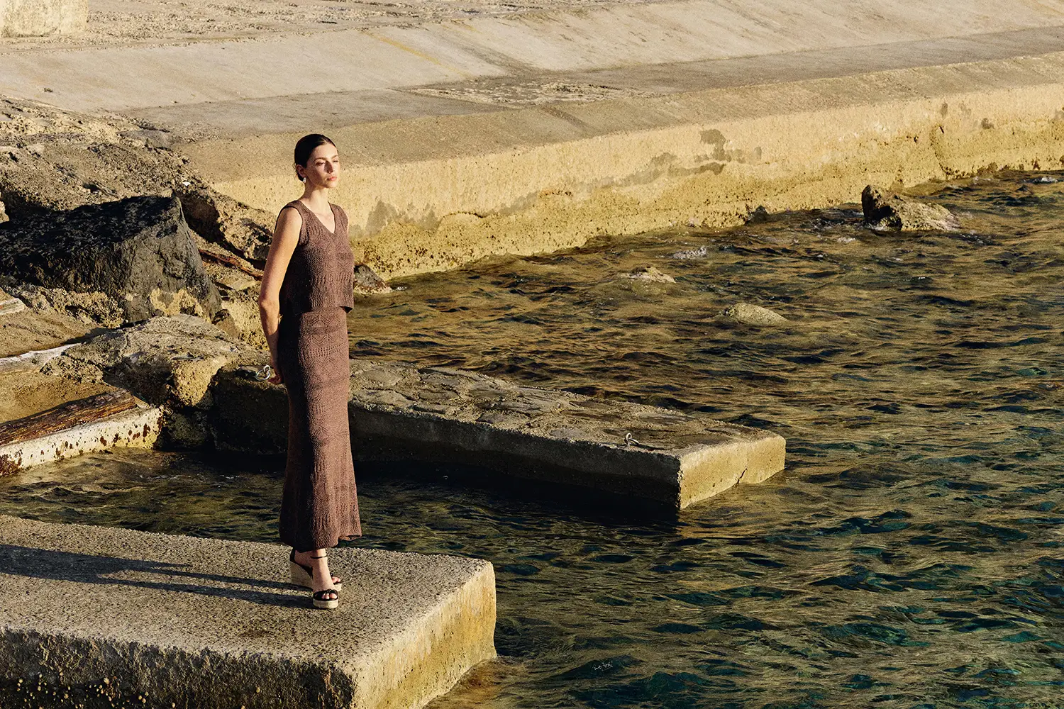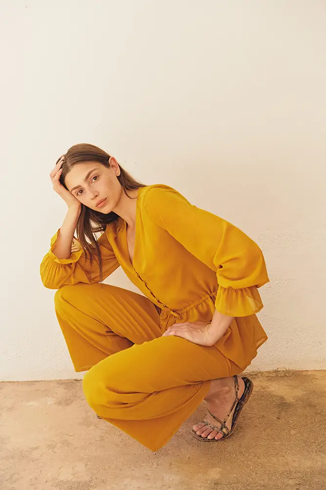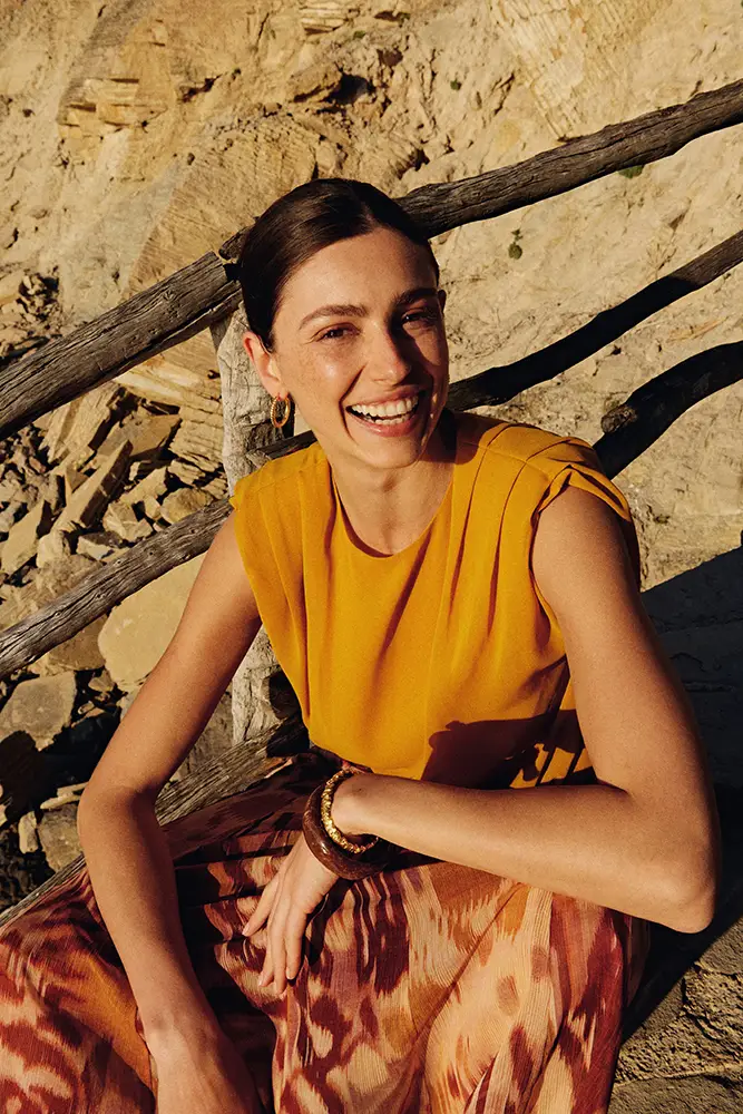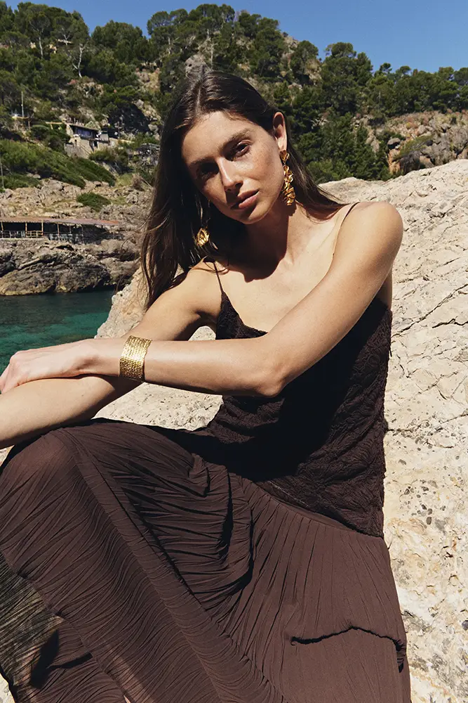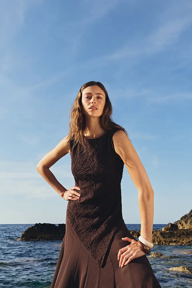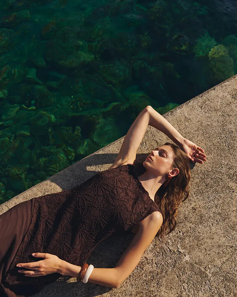 Una colección inspirada en esos paisajes donde la tierra y el agua conviven en armonía; diseños que nacen del contraste entre lo árido y lo fértil, lo estructurado y lo vaporoso, lo sencillo y lo exuberante. Las siluetas fluidas, los tejidos naturales y una paleta cálida y terrosa conforman una propuesta que abraza el espíritu del resort mediterráneo.