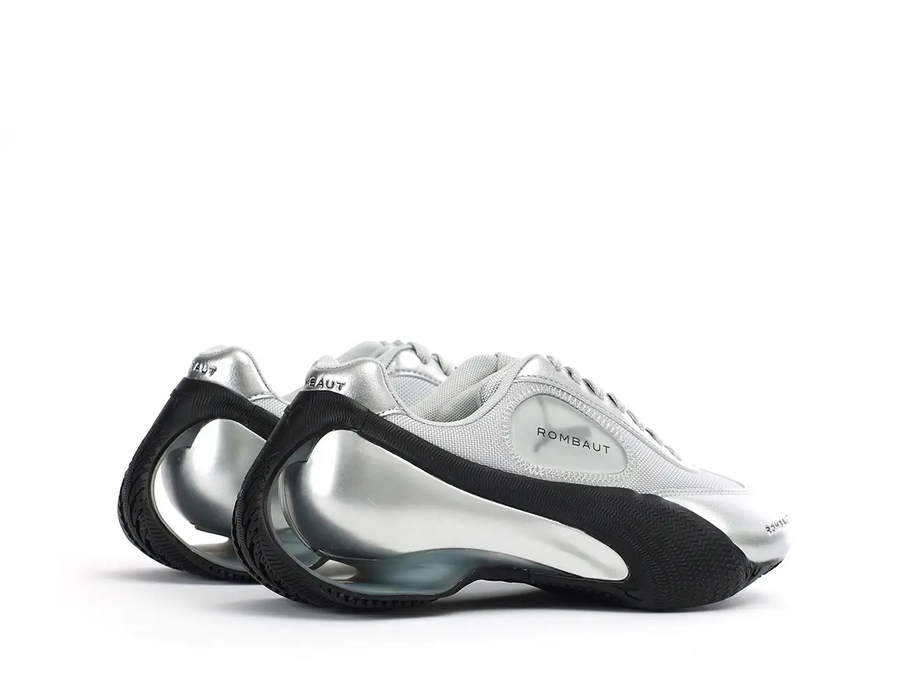 Fiel al estilo de ROMBAUT, las Speedcat se presentan con una actualización retro futurista. Confeccionadas con malla técnica plateada y piel sintética, su diseño incorpora el característico detalle de burbujas celulares de ROMBAUT, creando una silueta orgánica y fluida que refleja la visión de la marca: la armonía entre naturaleza y tecnología.