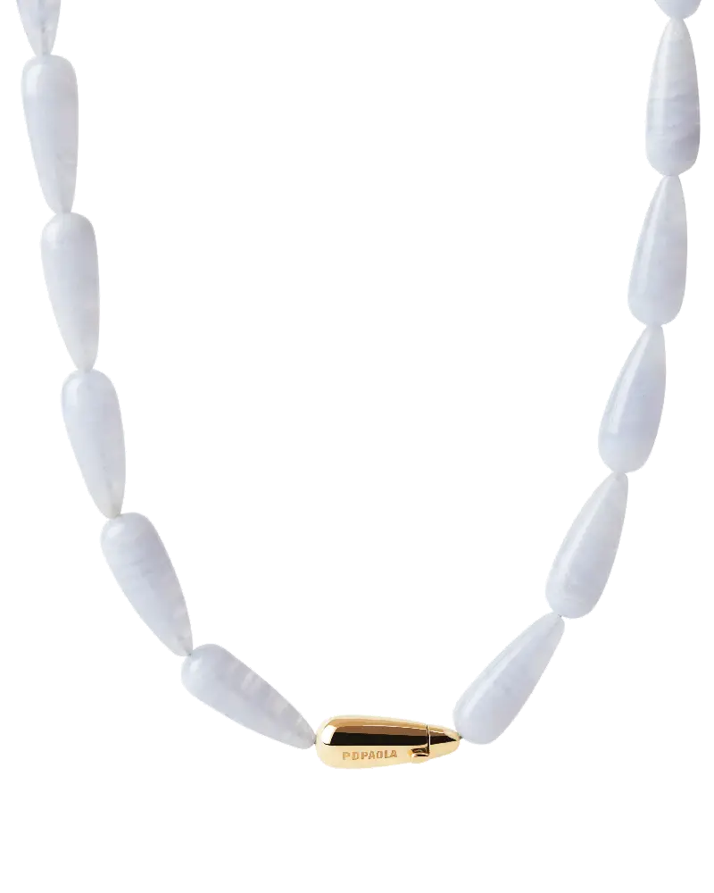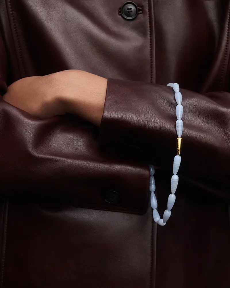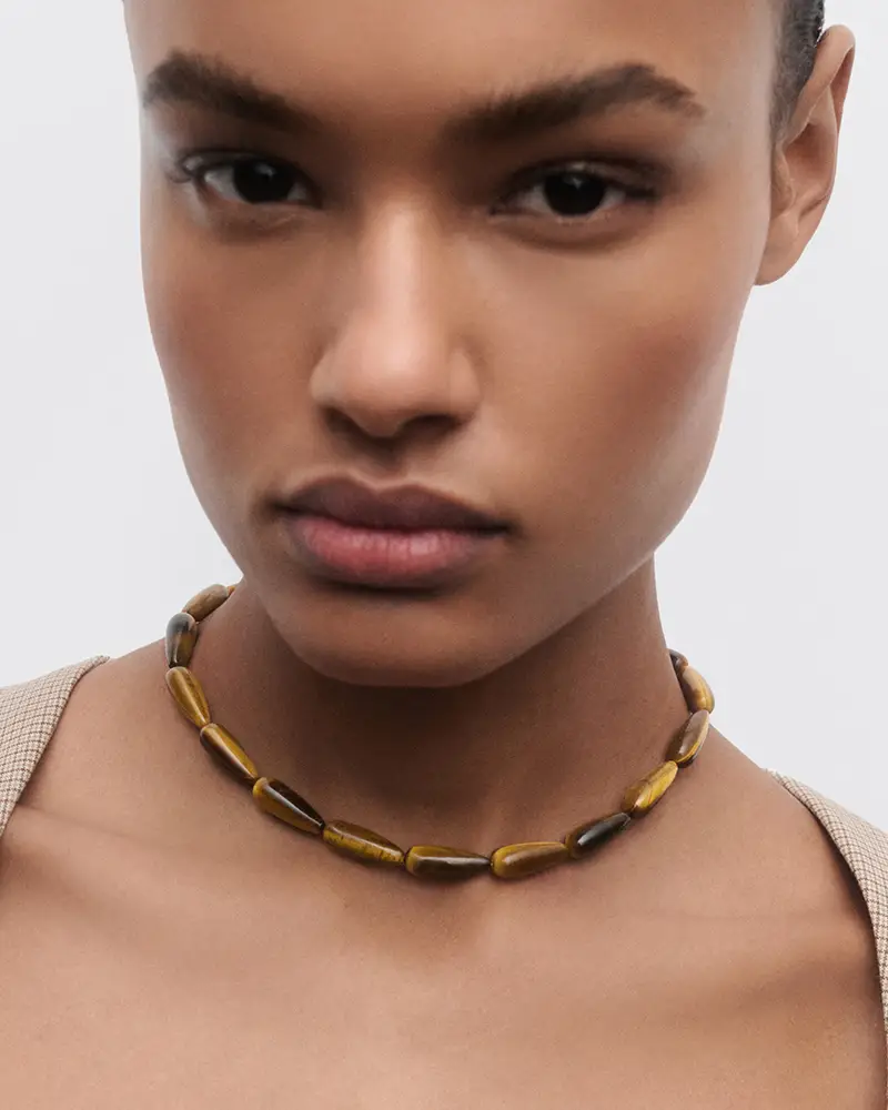 Los collares, creados en plata con un baño de oro de 18K, incorporan gemas naturales talladas con la icónica forma de gota de la marca. Una selección de tonos atemporales se reinterpreta a través del universo PDPAOLA, transformando cada pieza en una expresión de la naturaleza: Ojo de Tigre como símbolo de fuerza, Ágata Azul como invitación a la calma, Sodalita como despertador de la intuición y Aventurina Verde como apertura a nuevas oportunidades.
