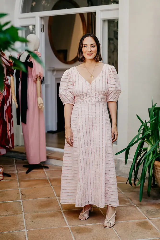 Los vestidos, confeccionados en tejidos como algodón bordado, tafeta fluida con detalles de contraste y georgette ligero, combinan comodidad y sofisticación, evocando la creatividad y el dinamismo de la ciudad.