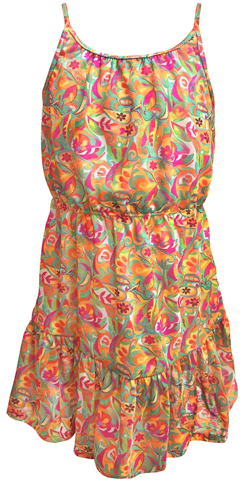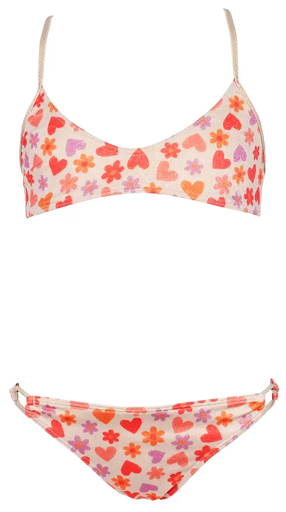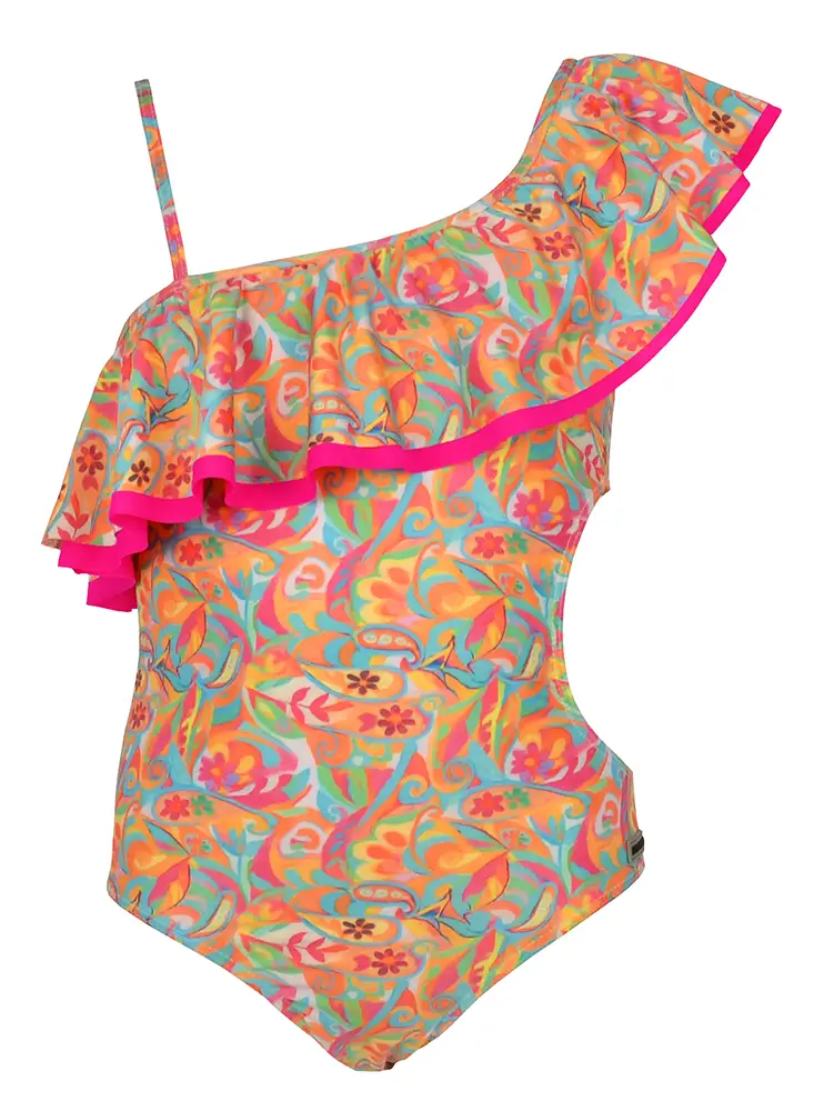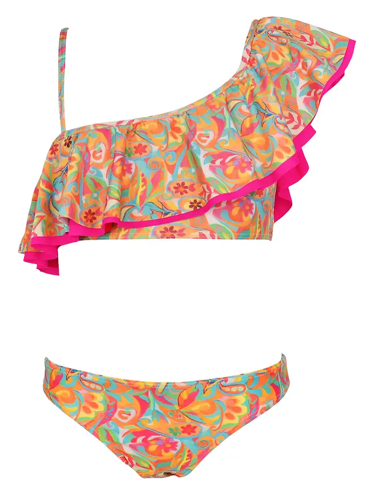 Los volantes añaden movimiento y un aire delicado, creando siluetas frescas y encantadoras. Para completar el look, la colección incluye prendas de ropa a juego, ideales para pasar de la playa al paseo sin renunciar al estilo; además de kaftanes ligeros que aportan comodidad y protección bajo el sol. Como detalle final, los scrunchies estampados a juego permiten coordinar cada conjunto de pies a cabeza. Una colección versátil, divertida y llena de encanto, diseñada para crear looks perfectos que acompañen a los niños en cada aventura de verano.