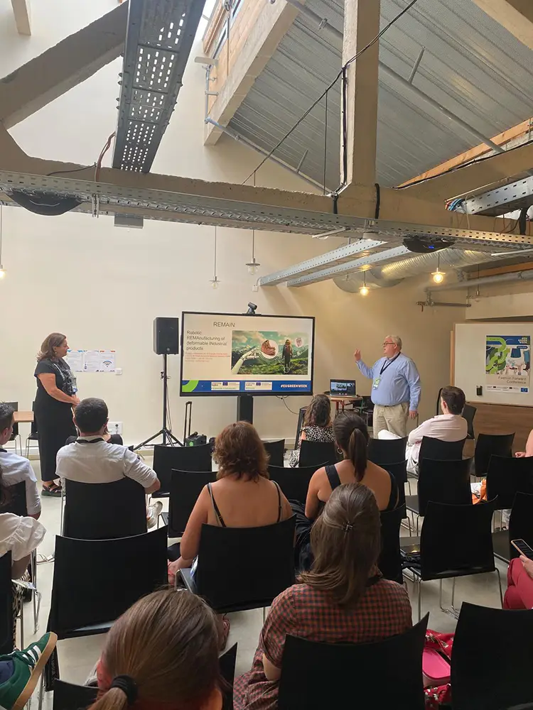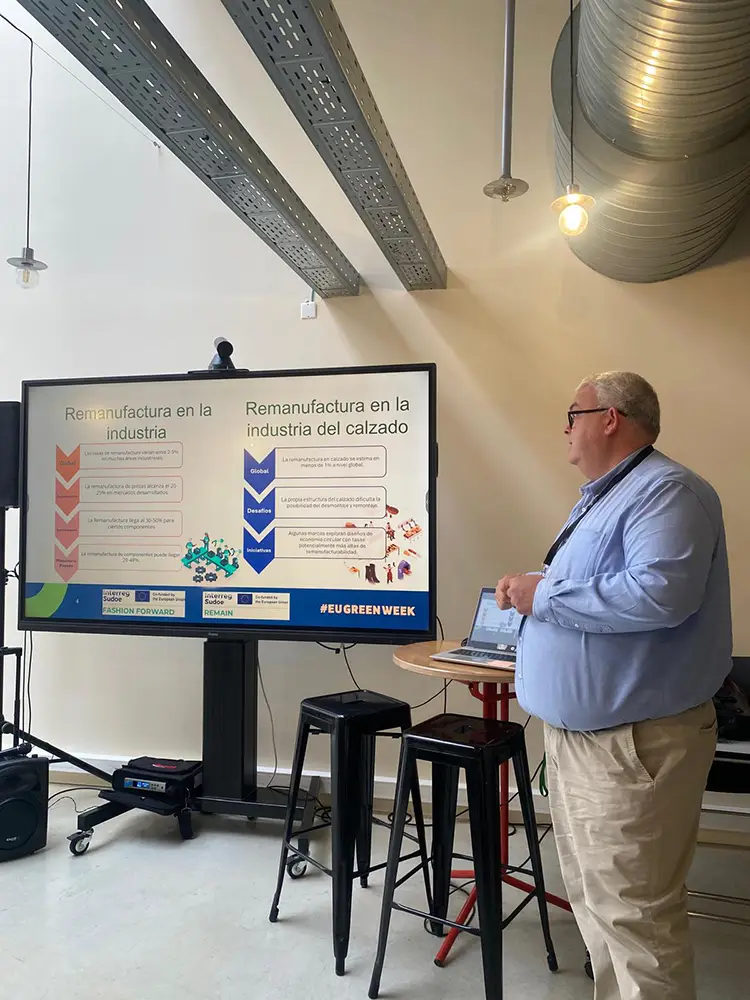 La representación del proyecto REMAIN corrió a cargo del responsable del Área de Fabricación Avanzada del centro tecnológico INESCOP y coordinador del proyecto, José Francisco Gómez, quien ofreció una ponencia detallada sobre los desafíos actuales de la industria del calzado y las oportunidades que ofrece la robótica como apoyo para facilitar la remanufactura, herramienta clave en la transición hacia una economía circular.
