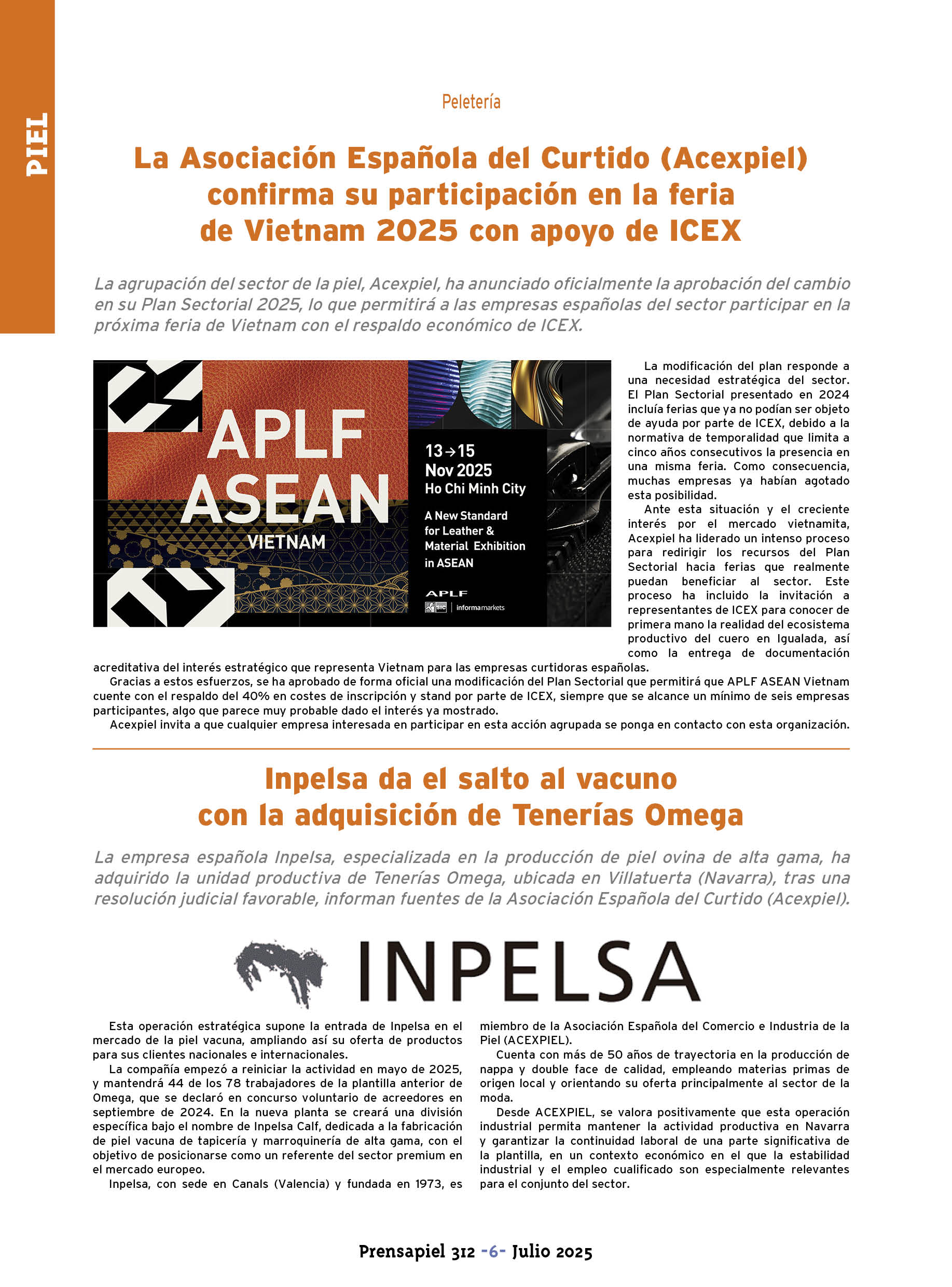 - La Asociación Española del Curtido (Acexpiel) confirma su participación en la feria de Vietnam 2025 con apoyo de ICEX.