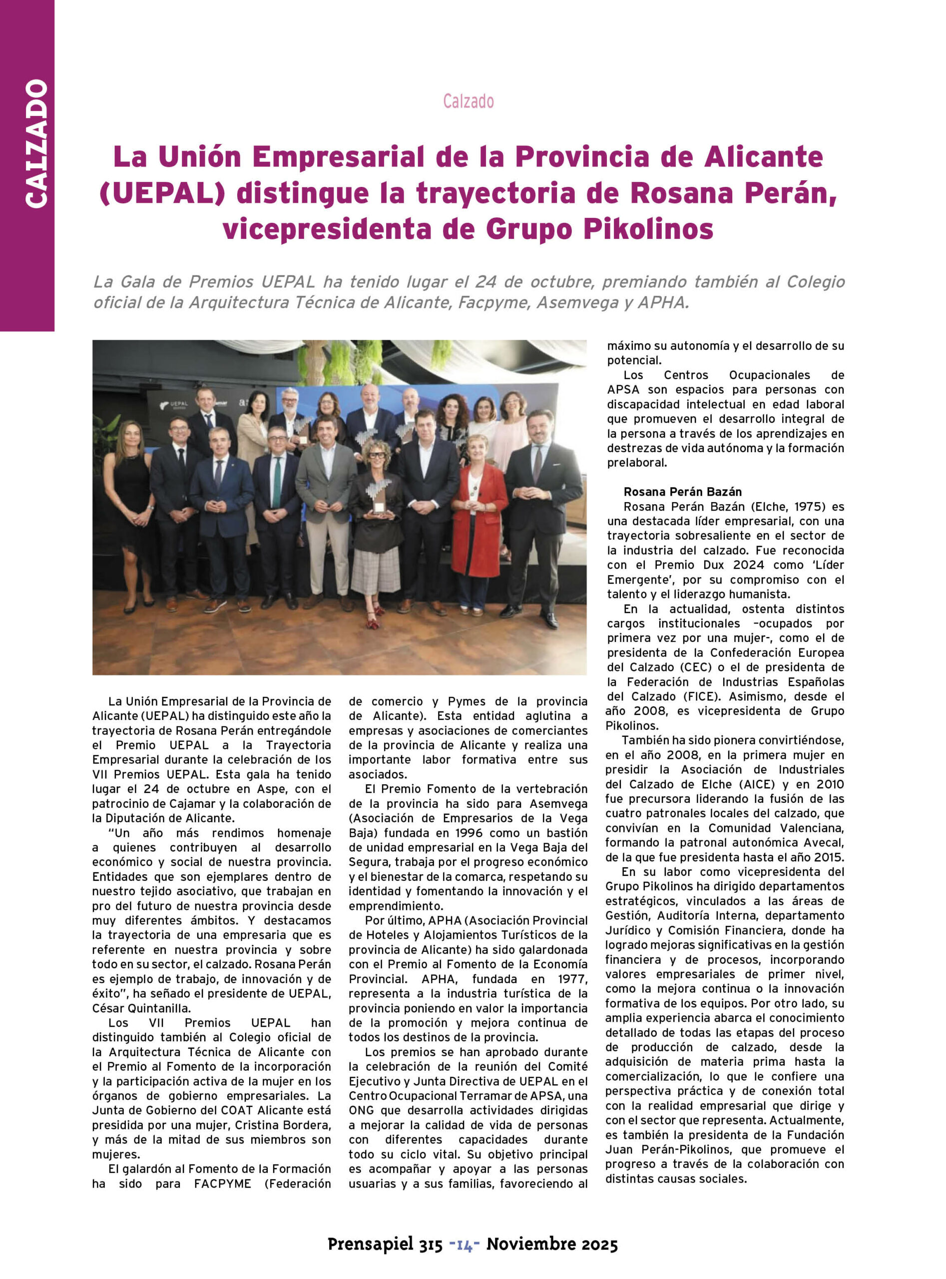 - La Unión Empresarial de la Provincia de Alicante (UEPAL) distingue la trayectoria de Rosana Perán, vicepresidenta de Grupo Pikolinos.