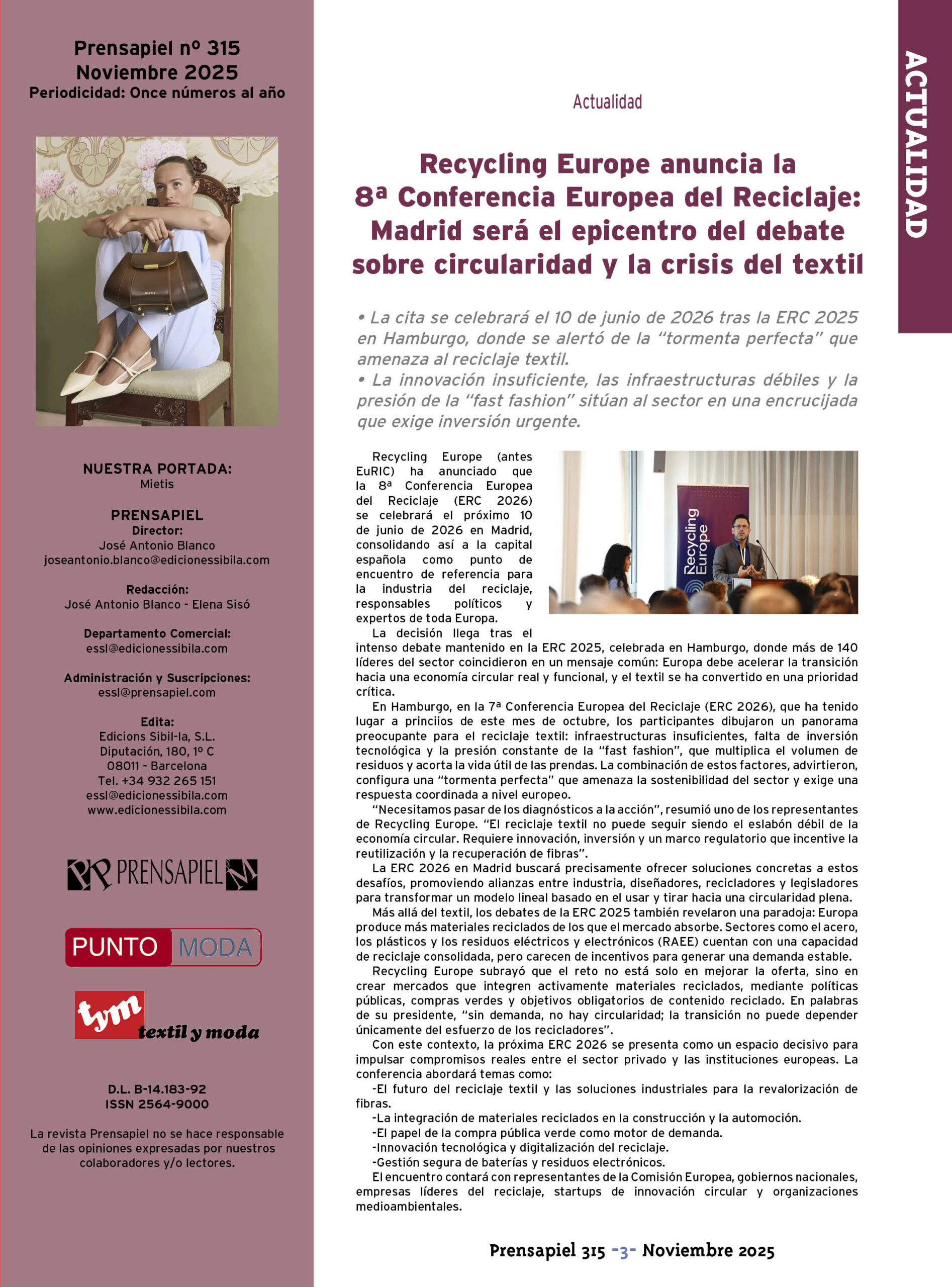 - Recycling Europe anuncia la 8ª Conferencia Europea del Reciclaje: Madrid será el epicentro del debate sobre circularidad y la crisis del textil.