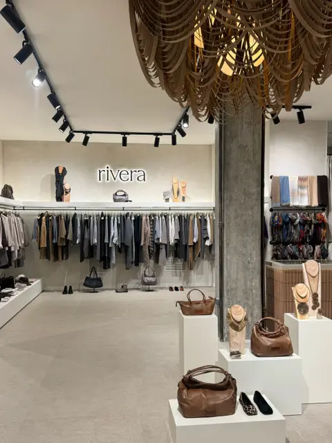 En contraste con esta base neutra, el espacio incorpora tres elementos que introducen sofisticación y contemporaneidad sin perder la esencia artesanal: un mostrador central de barro artesanal en tonos oscuros, pieza escultórica que rompe la neutralidad con elegancia; una gran lámpara central realizada a medida, elaborada con tiras textiles creadas a partir de retales de las propias colecciones Rivera, un homenaje a la producción artesanal y a la circularidad del diseño; por último, detalles en negro en expositores e iluminación, que aportan equilibrio visual y un toque urbano y actual.