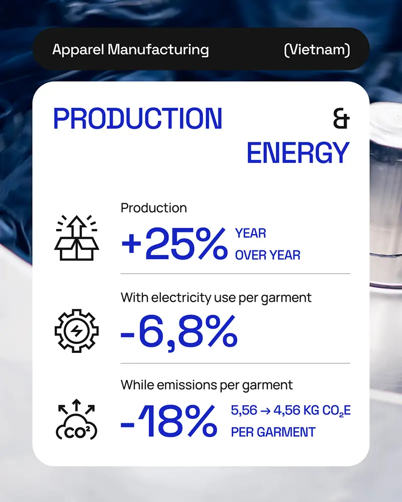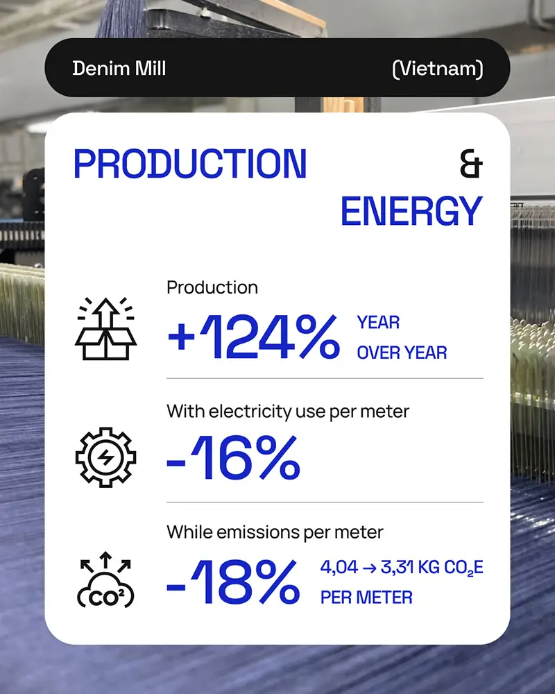 En el apartado energético, los avances son igualmente notables: pese a que la producción textil aumentó un 25%, las emisiones se redujeron en un 18% gracias a la instalación de techos solares y a la optimización de procesos. Solo en la planta de confección, el consumo eléctrico por prenda bajó de 4,307 kWh en 2023 a 4,014 kWh en 2024.