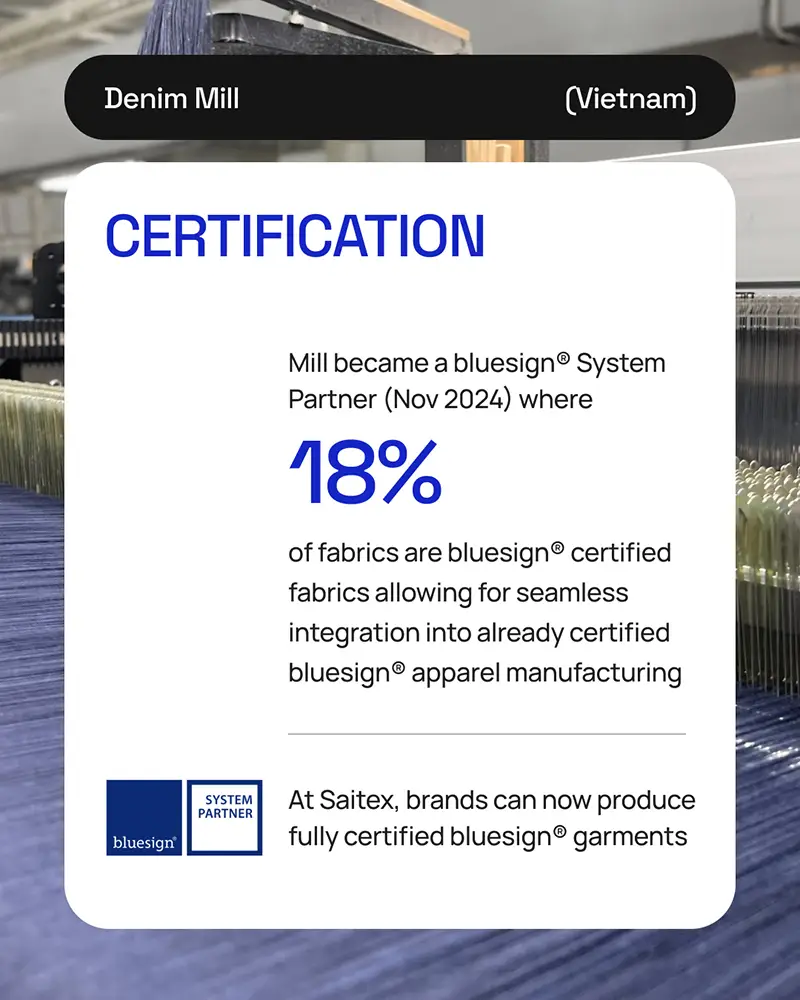 El informe revela que Saitex se ha consolidado como un referente en la producción de tejidos certificados. En 2024, un 18% de las telas producidas en su molino alcanzaron el estándar Gold de Cradle to Cradle Certified®, mientras que otro 18% fue reconocido con la certificación bluesign®, lo que garantiza procesos limpios y libres de sustancias nocivas.