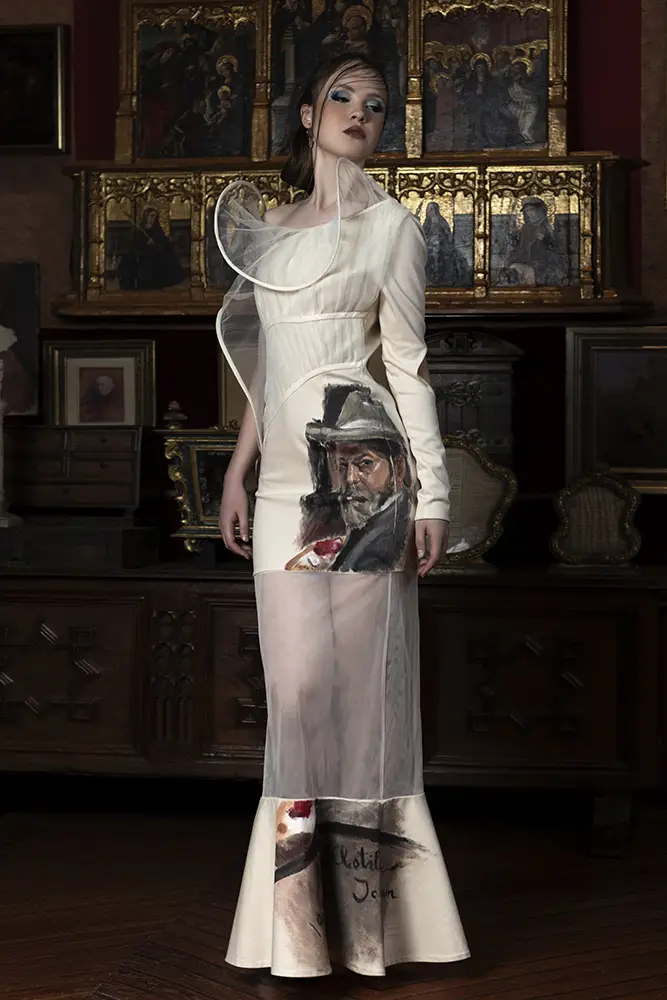 Elaborados con tejidos reciclados de lino y algodón, proporcionados por Tejidos Royo, los trajes han sido pintados a mano con materiales ecológicos de Abacus. Cada pieza está inspirada en una etapa de la vida del artista —formación, consolidación, culminación y etapa final—, y toma como referencia obras icónicas seleccionadas por el historiador David Gutiérrez. Los diseños se completan con complementos realizados en cuero de pescado reciclado, recogido en playas del Mediterráneo, subrayando la conexión entre sostenibilidad, creatividad y compromiso ambiental.