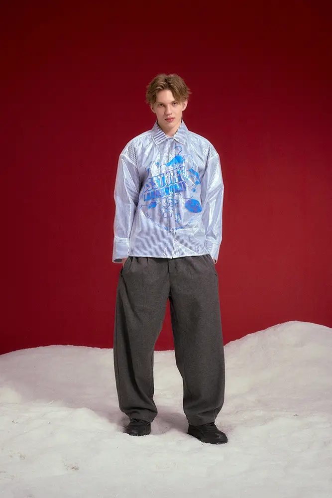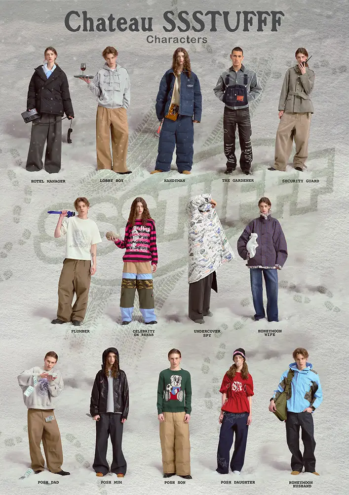 Nuevas siluetas y construcciones emergen en esta colección, como el “Spy Coat”, homenaje al Undercover Spy que llega al Château SSSTUFFF y cuyo caso da un giro oscuro. Esta prenda destaca por su diseño reversible: un lado con estampado de periódico, el otro en negro liso, e incorpora dos recortes a modo de mirillas que evocan el imaginario icónico del espionaje. Junto al Spy Coat, se presenta una chaqueta de ante con marcas de neumáticos grabadas a láser. Prendas identificativas de personaje ayudan a desentrañar la historia, mientras que otras piezas, con detalles del Château SSSTUFFF, refuerzan la conexión de la colección con la narrativa.