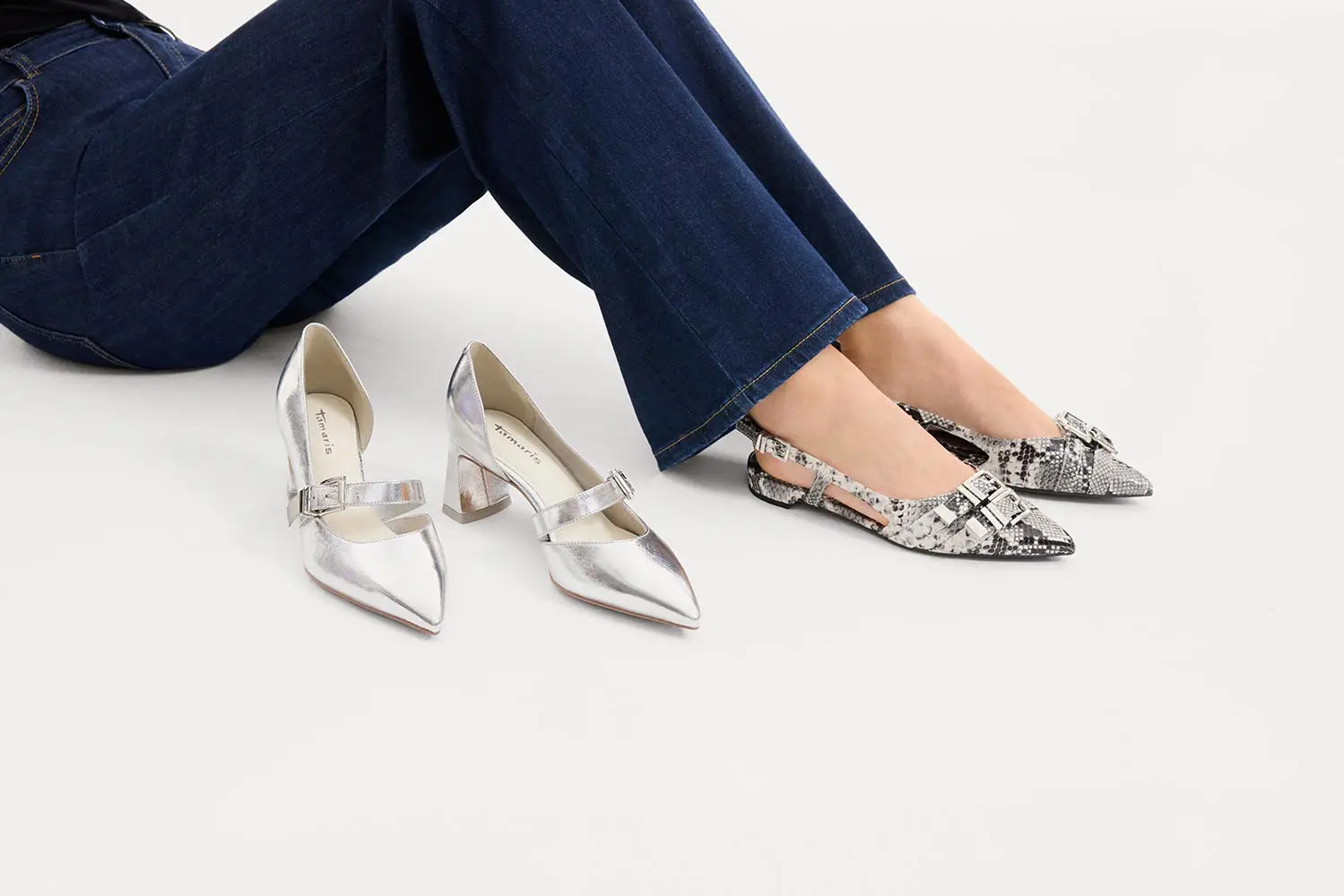 En febrero, los zapatos se convierten en declaraciones de poder. Tamaris presenta bailarinas, pumps y mocasines con texturas de serpiente, hebillas llamativas y tachuelas metálicas. Los materiales metálicos, el rafia y el cuero en tonos sobrios como negro, blanco roto y plata marcan una estética elegante pero audaz.