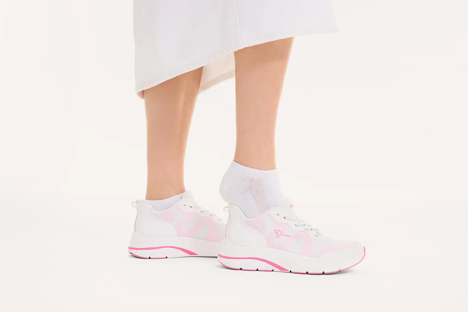 Llega la ligereza: zapatillas atléticas y flexibles en tonos pastel como rosa, lila o azul claro, con detalles técnicos como suelas de goma EVA, plantillas OrthoLite® y tejidos transpirables. Diseñadas para el movimiento diario, con estilo y frescura.