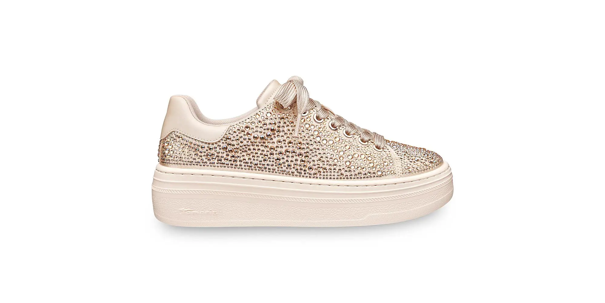 El glamour brilla en cada paso. Zapatos con acabado satinado, adornos de cristal y detalles metálicos aportan un toque festivo a cualquier día.