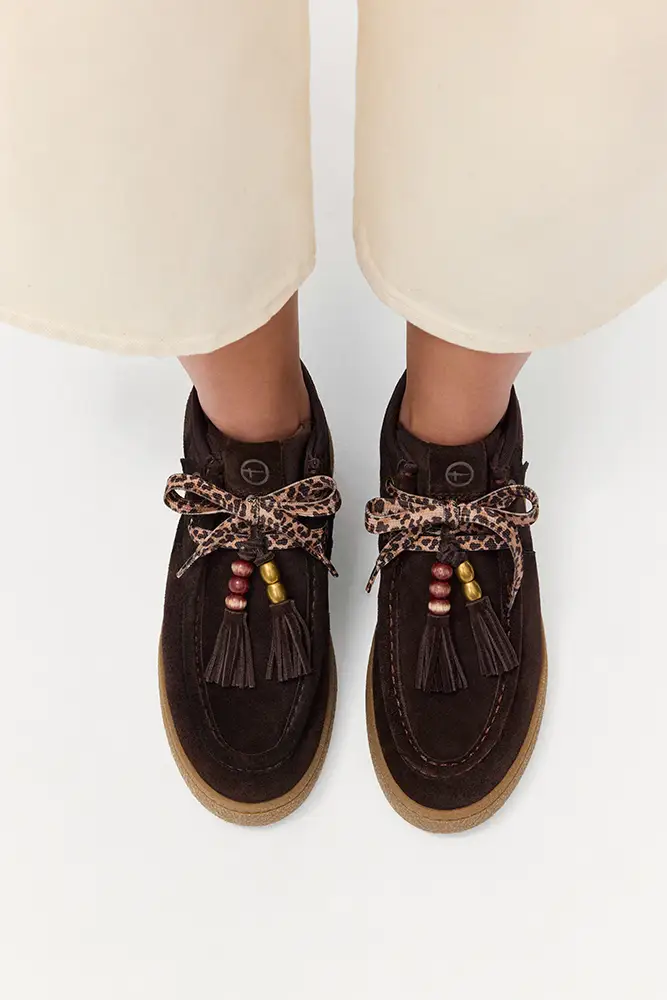 Las suelas tipo crepé, con guiños retro o reinterpretaciones urbanas, funcionan como eje estilístico. A ello se suman detalles artesanales —borlas decorativas, cordones contrastados, acentos de pelo y bordados en forma de “T”— que elevan el carácter de cada pieza y confieren un aire premium.