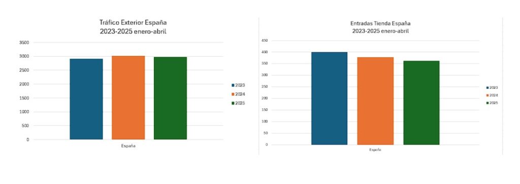 A nivel nacional, los centros comerciales han registrado una ligera caída del -1% en tráfico exterior y un descenso mayor del -4% en entradas en tienda en comparación con el mismo periodo de 2024. Si se amplía la mirada hacia el 2023, se confirma un crecimiento acumulado del +2,4% en tráfico exterior, lo que evidencia un entorno comercial que mantiene su capacidad de atracción, aunque aún enfrenta retos en la conversión de visitantes en compradores.