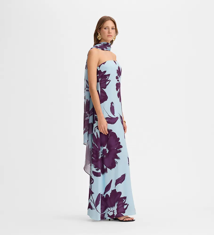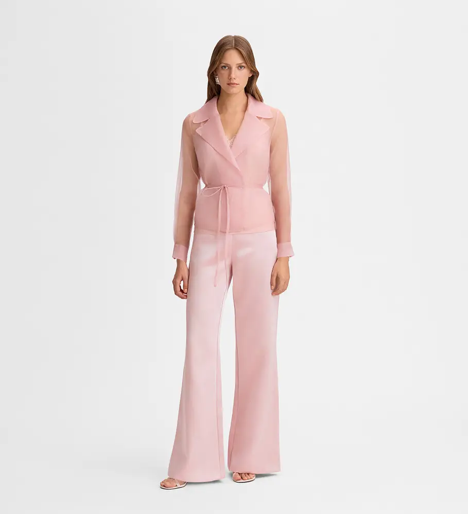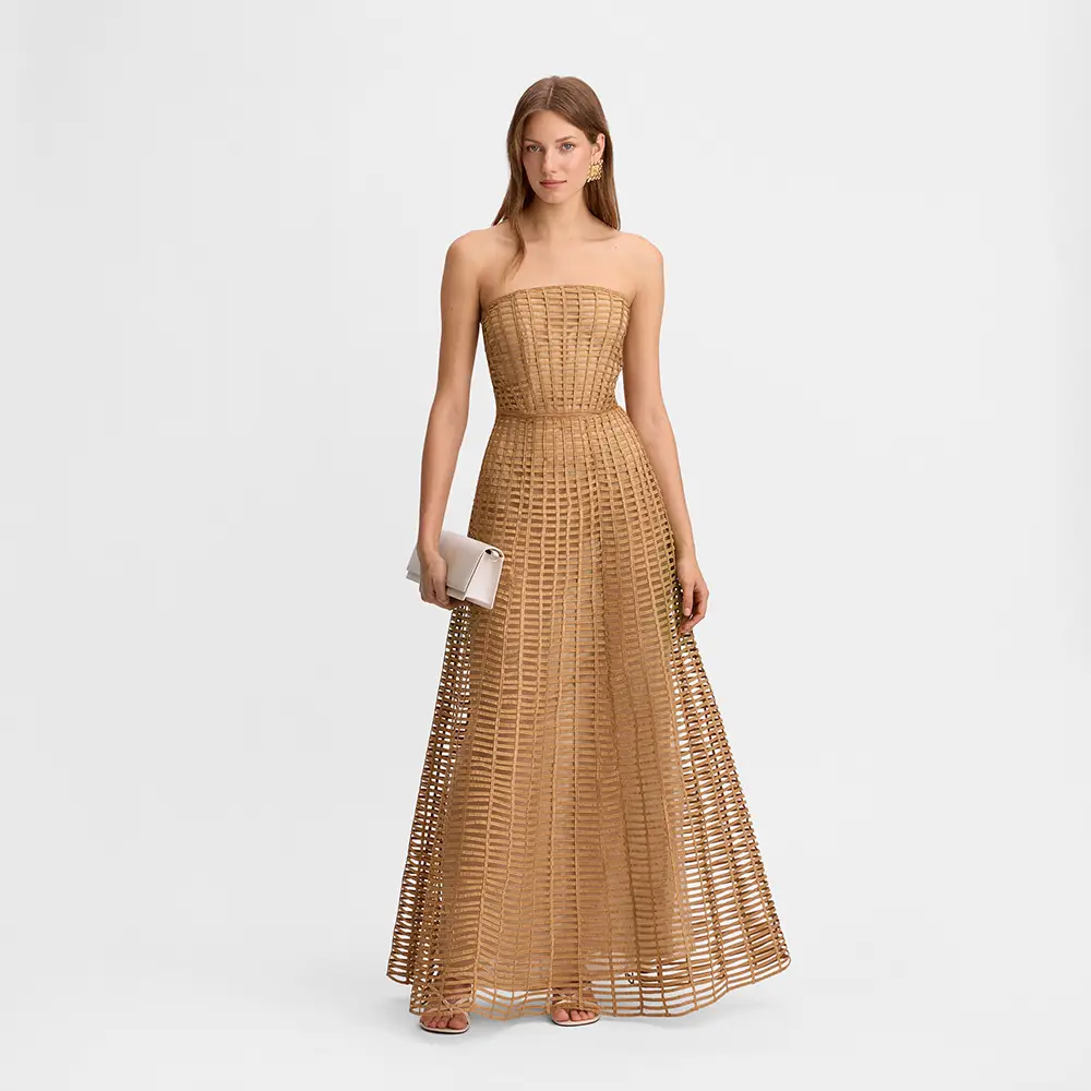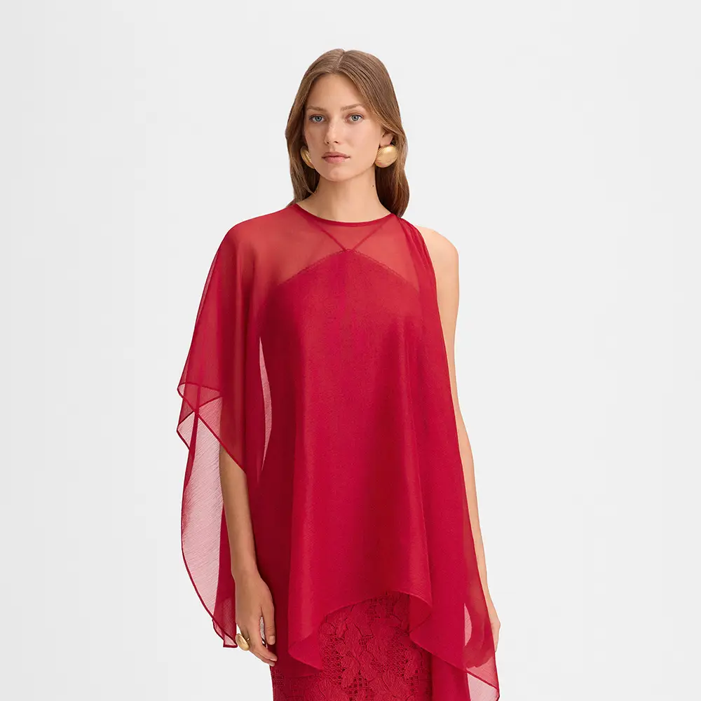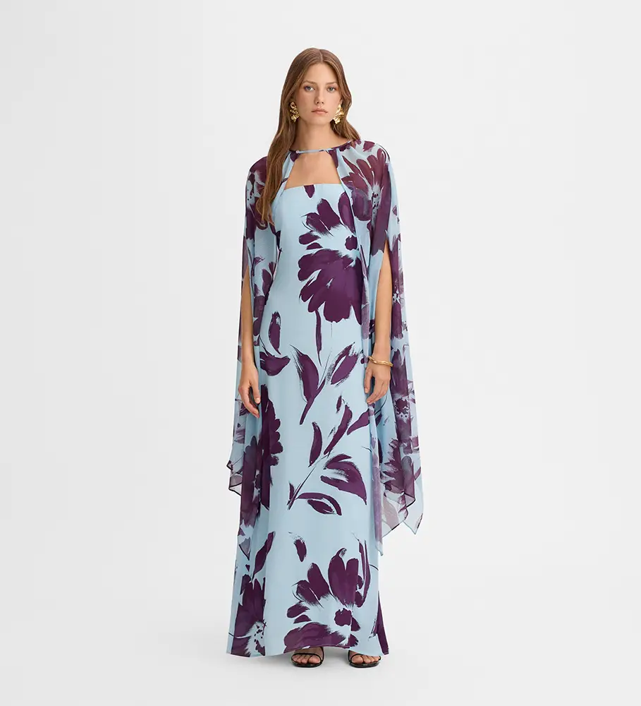 Entre las claves de la colección destaca el corte columna, con vestidos largos, rectos y fluidos que alargan la figura y aportan una presencia serena y contundente. Los tejidos satinados y las gasas, cortados al bies, caen de forma natural sobre las curvas, creando un efecto de movimiento continuo y un brillo sutil al caminar. Los escotes drapeados, como el halter y el cowl, regresan como símbolos de una elegancia sin esfuerzo, mientras que las transparencias se trabajan desde una perspectiva escultórica, superponiendo capas de gasa y organza para construir siluetas especiales.