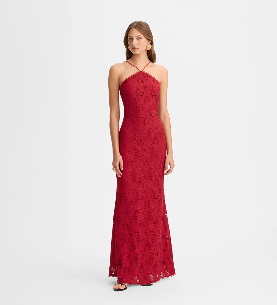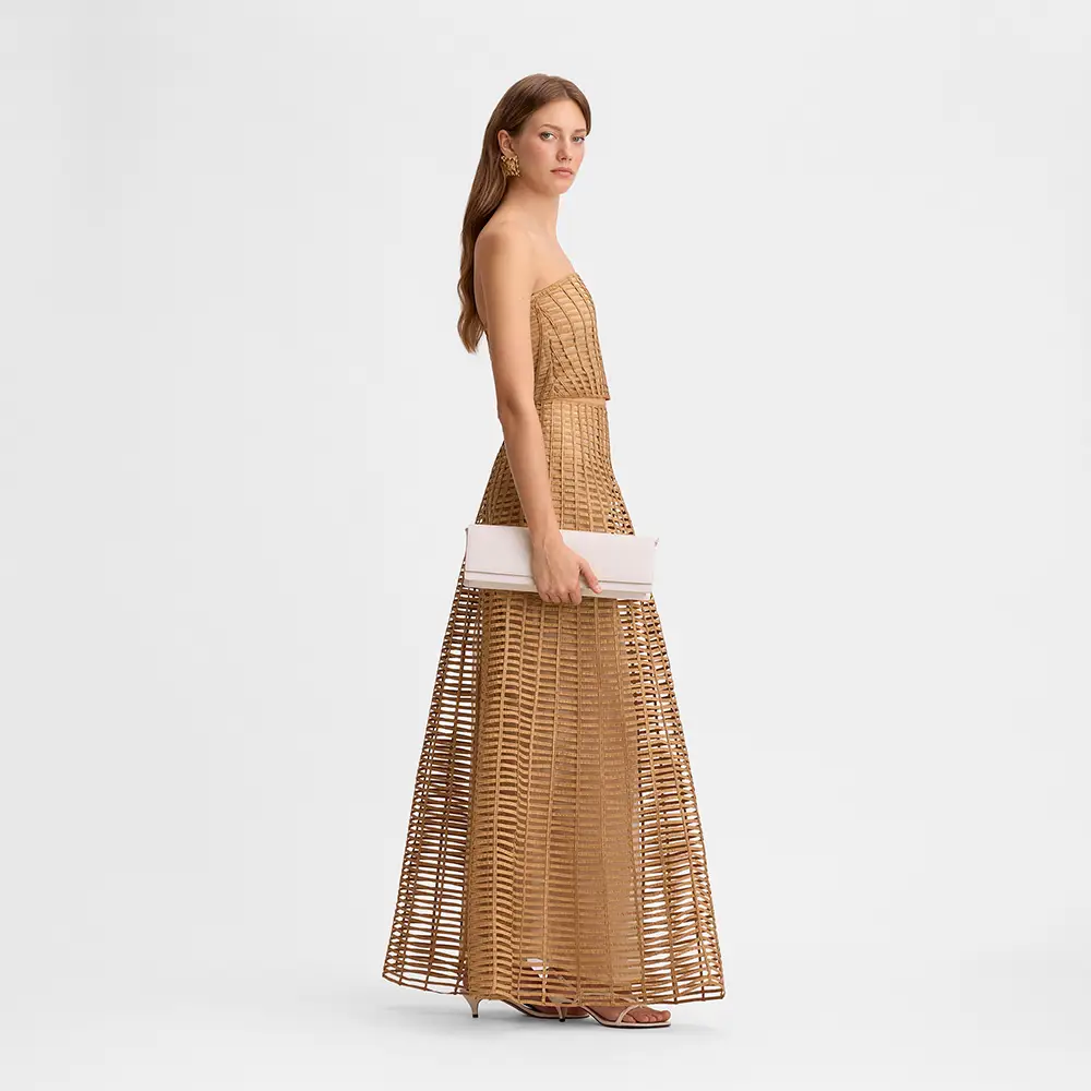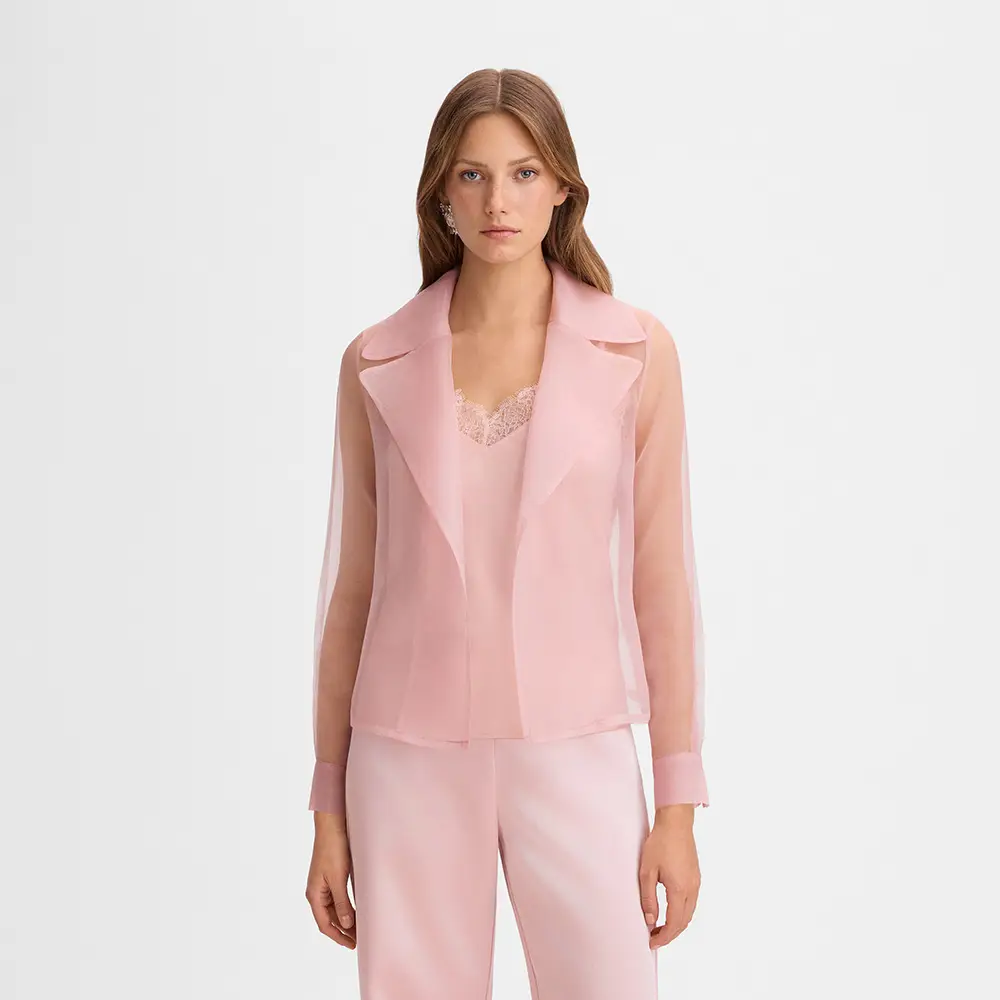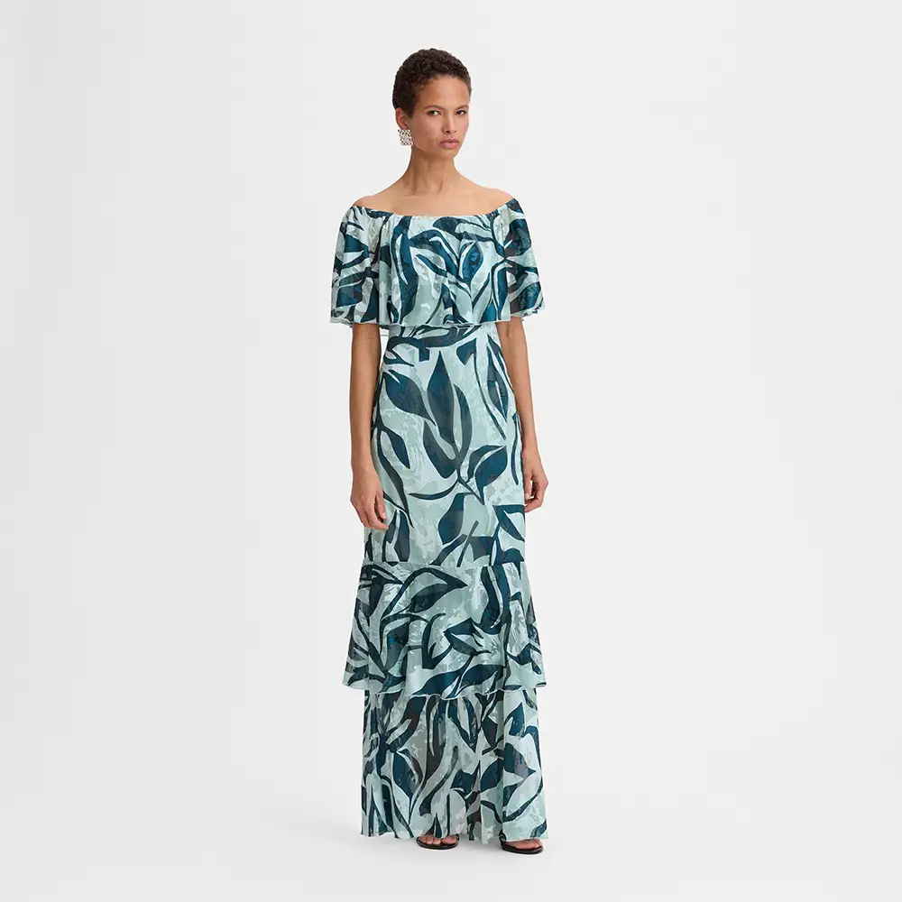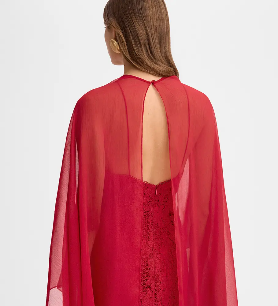 Entre las claves de la colección destaca el corte columna, con vestidos largos, rectos y fluidos que alargan la figura y aportan una presencia serena y contundente. Los tejidos satinados y las gasas, cortados al bies, caen de forma natural sobre las curvas, creando un efecto de movimiento continuo y un brillo sutil al caminar. Los escotes drapeados, como el halter y el cowl, regresan como símbolos de una elegancia sin esfuerzo, mientras que las transparencias se trabajan desde una perspectiva escultórica, superponiendo capas de gasa y organza para construir siluetas especiales.