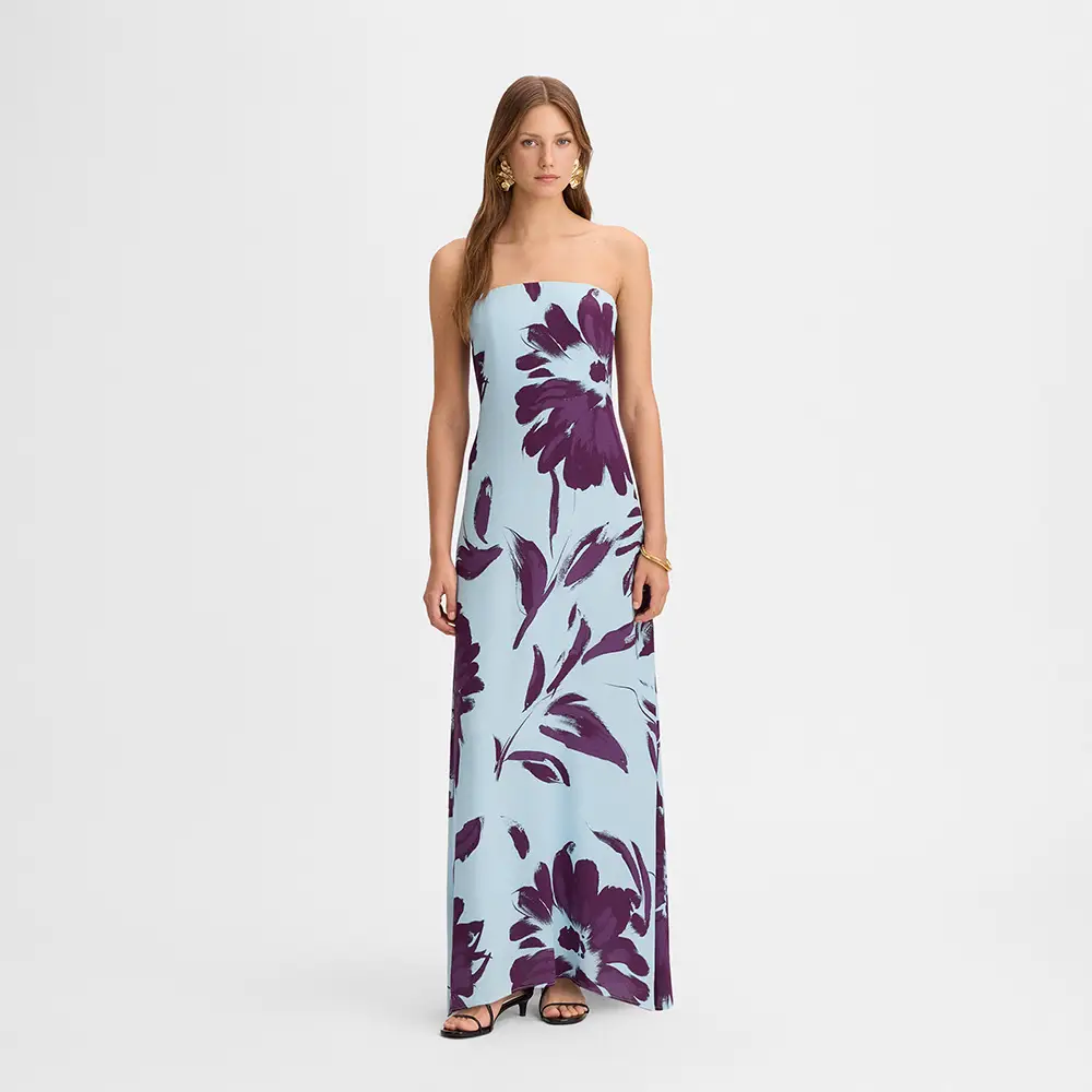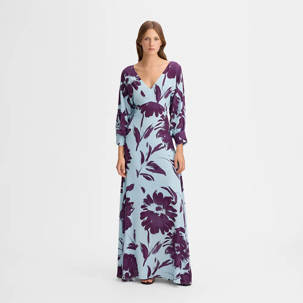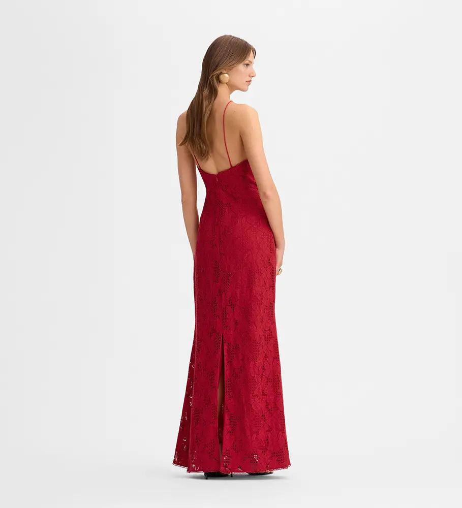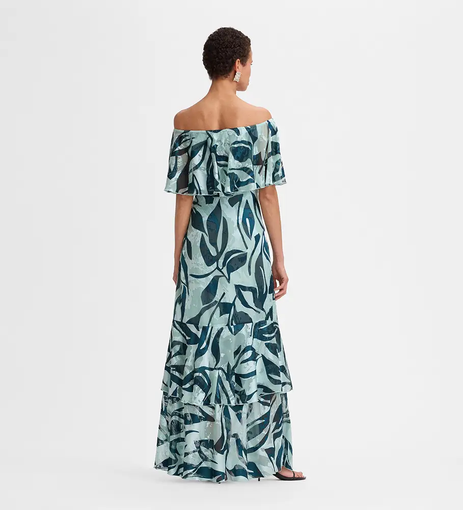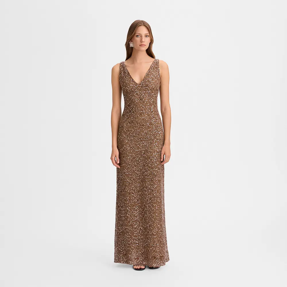 Entre las claves de la colección destaca el corte columna, con vestidos largos, rectos y fluidos que alargan la figura y aportan una presencia serena y contundente. Los tejidos satinados y las gasas, cortados al bies, caen de forma natural sobre las curvas, creando un efecto de movimiento continuo y un brillo sutil al caminar. Los escotes drapeados, como el halter y el cowl, regresan como símbolos de una elegancia sin esfuerzo, mientras que las transparencias se trabajan desde una perspectiva escultórica, superponiendo capas de gasa y organza para construir siluetas especiales.