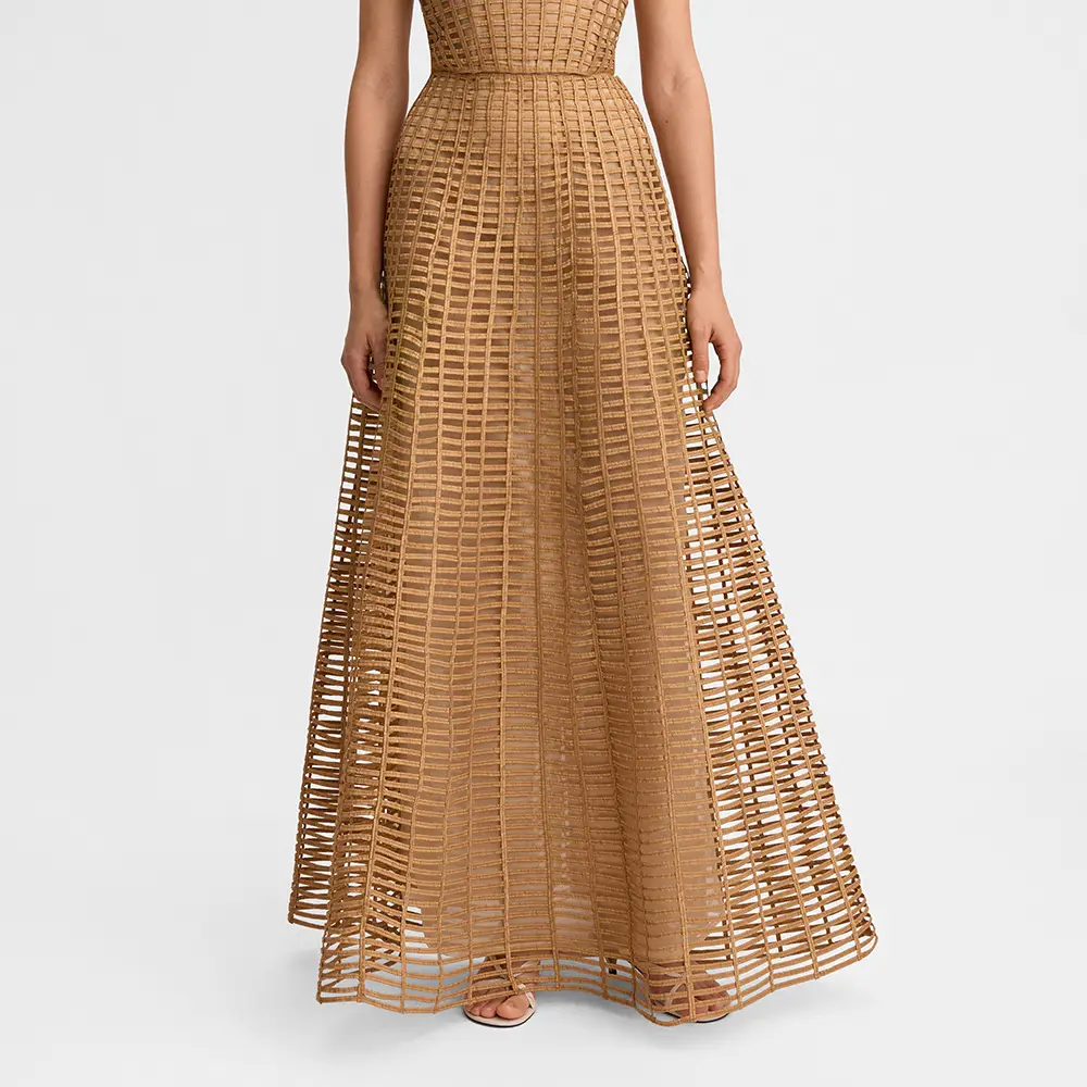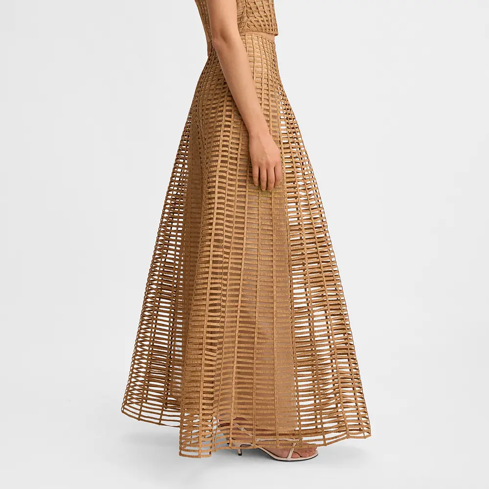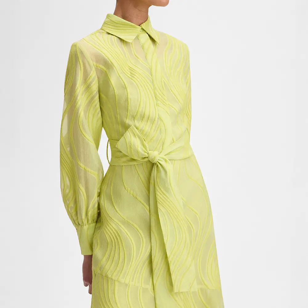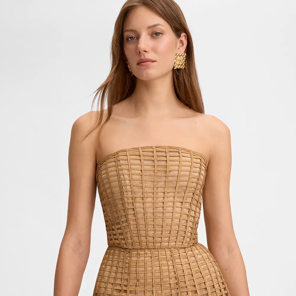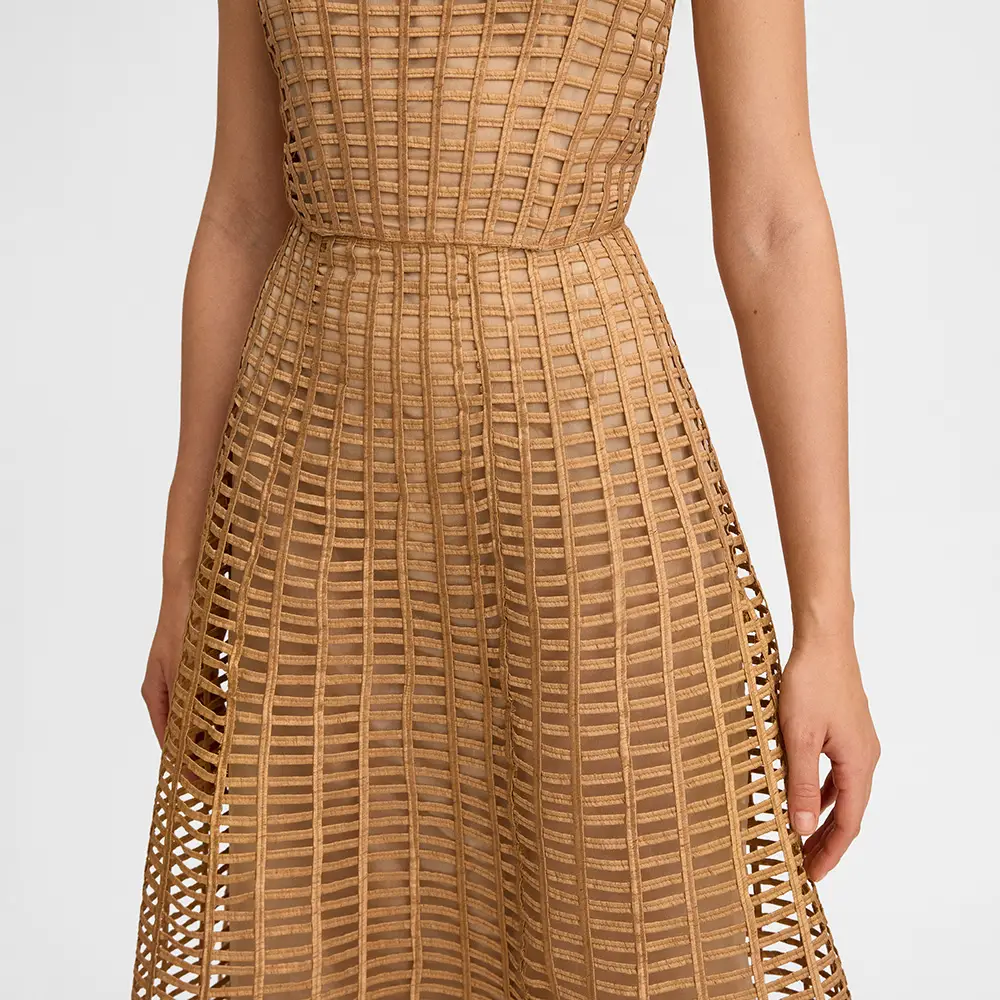 Como es habitual en la firma, el punto de partida es el tejido. La colección despliega un amplio abanico de texturas y técnicas textiles desarrolladas en exclusiva por y para SIMORRA: bordados radiales, devorados, trenzados artesanales y troquelados láser con formas geométricas inspiradas en la naturaleza. A estos se suman jacquards y fil coupéscreados internamente, así como gasas etéreas, satenes cortados al bies, organzas y tafetanes que envuelven el cuerpo con naturalidad y que, gracias a su construcción, generan movimiento y profundidad visual.