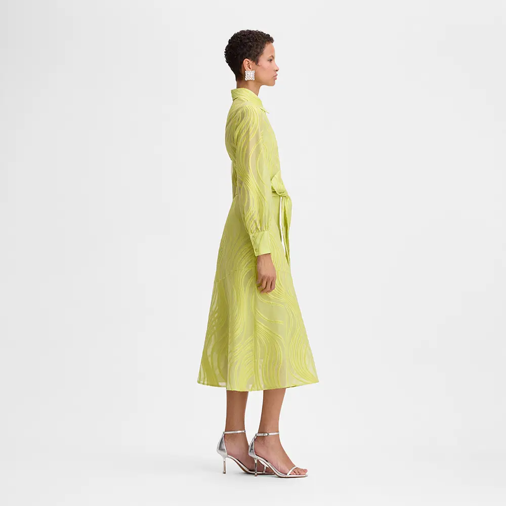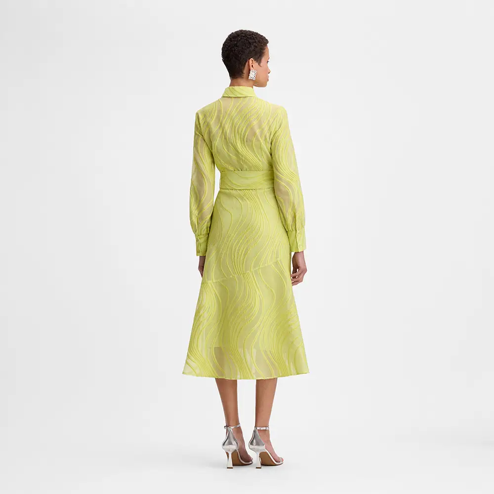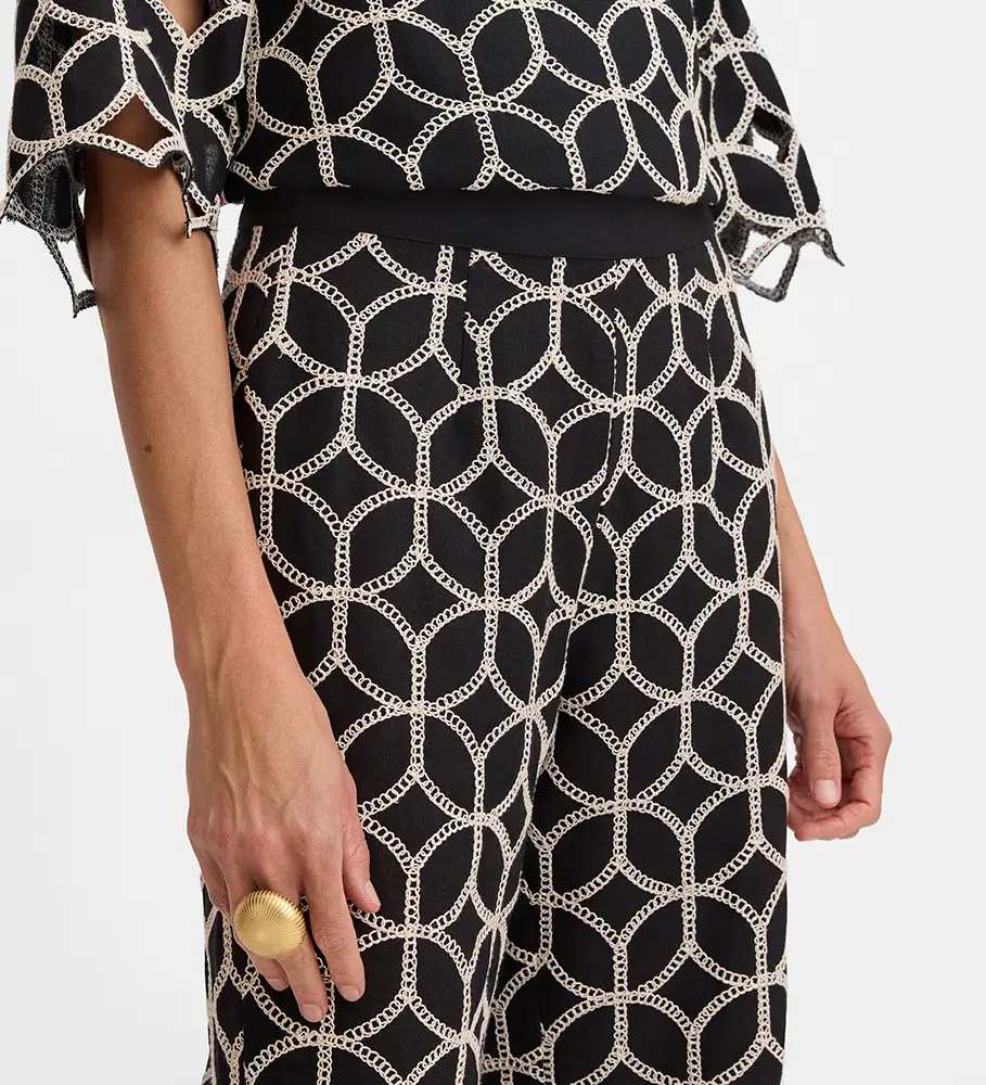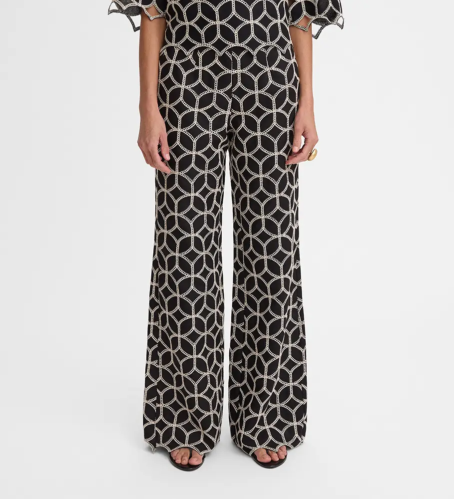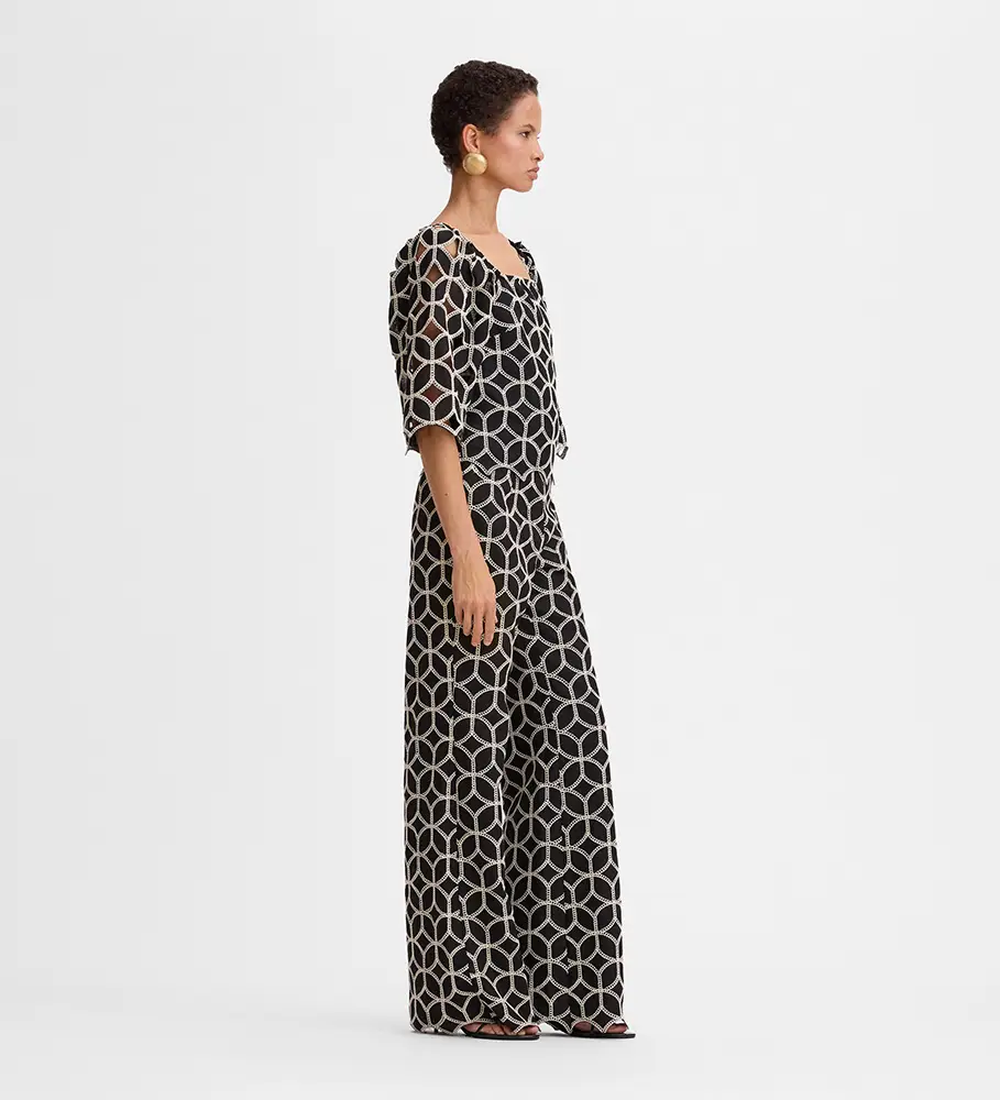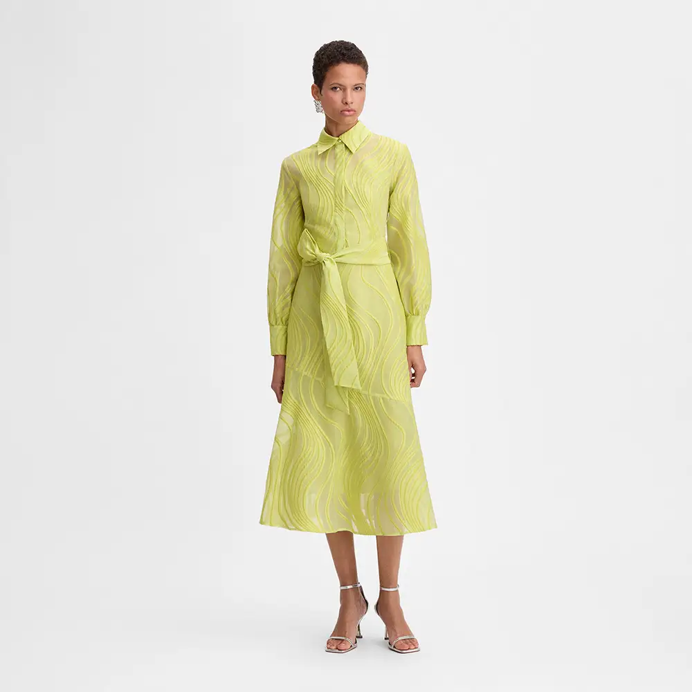 Como es habitual en la firma, el punto de partida es el tejido. La colección despliega un amplio abanico de texturas y técnicas textiles desarrolladas en exclusiva por y para SIMORRA: bordados radiales, devorados, trenzados artesanales y troquelados láser con formas geométricas inspiradas en la naturaleza. A estos se suman jacquards y fil coupéscreados internamente, así como gasas etéreas, satenes cortados al bies, organzas y tafetanes que envuelven el cuerpo con naturalidad y que, gracias a su construcción, generan movimiento y profundidad visual.