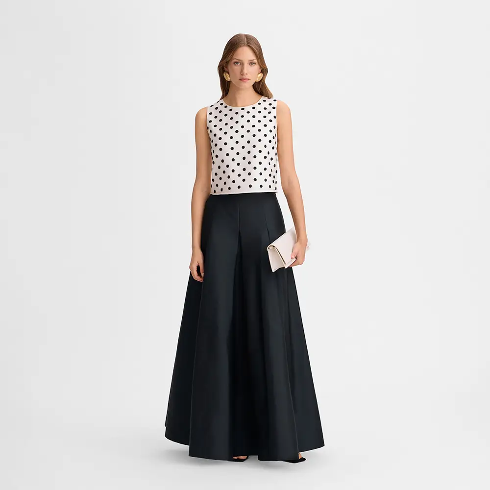 La paleta cromática oscila entre tonos vibrantes y colores neutros. Estos últimos se trabajan en looks monocromáticos y propuestas de sastrería depurada, pensadas para quienes buscan una elegancia más minimalista pero igualmente poderosa. Esta dualidad cromática encuentra su reflejo en las siluetas, que juegan constantemente entre dos polos: por un lado, líneas “líquidas” que se funden con el cuerpo; por otro, volúmenes más dramáticos que reclaman atención y aportan carácter a las piezas.