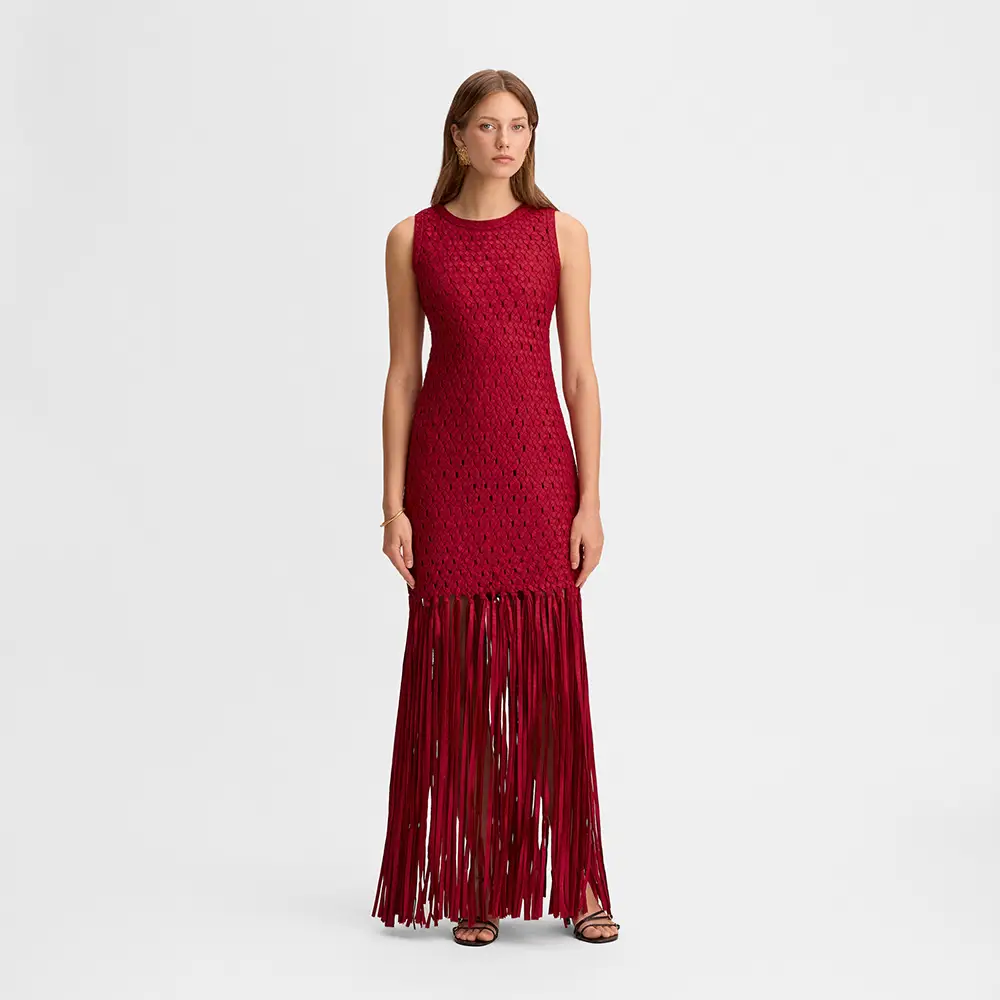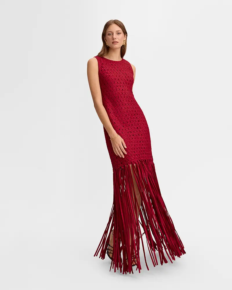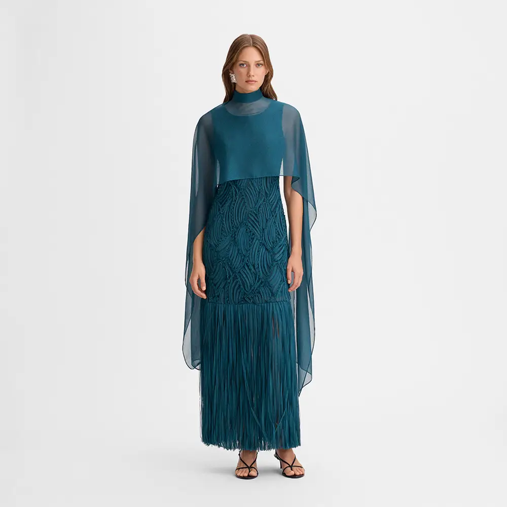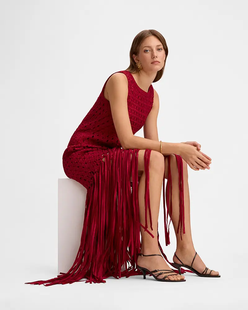 Los flecos y las plumas añaden también dinamismo y teatralidad a la colección, especialmente en vestidos tipo columna que cobran vida con cada paso. Detalles pensados para acompañar el movimiento del cuerpo y reforzar la dimensión sensorial de las prendas, convirtiendo cada look en una experiencia visual.