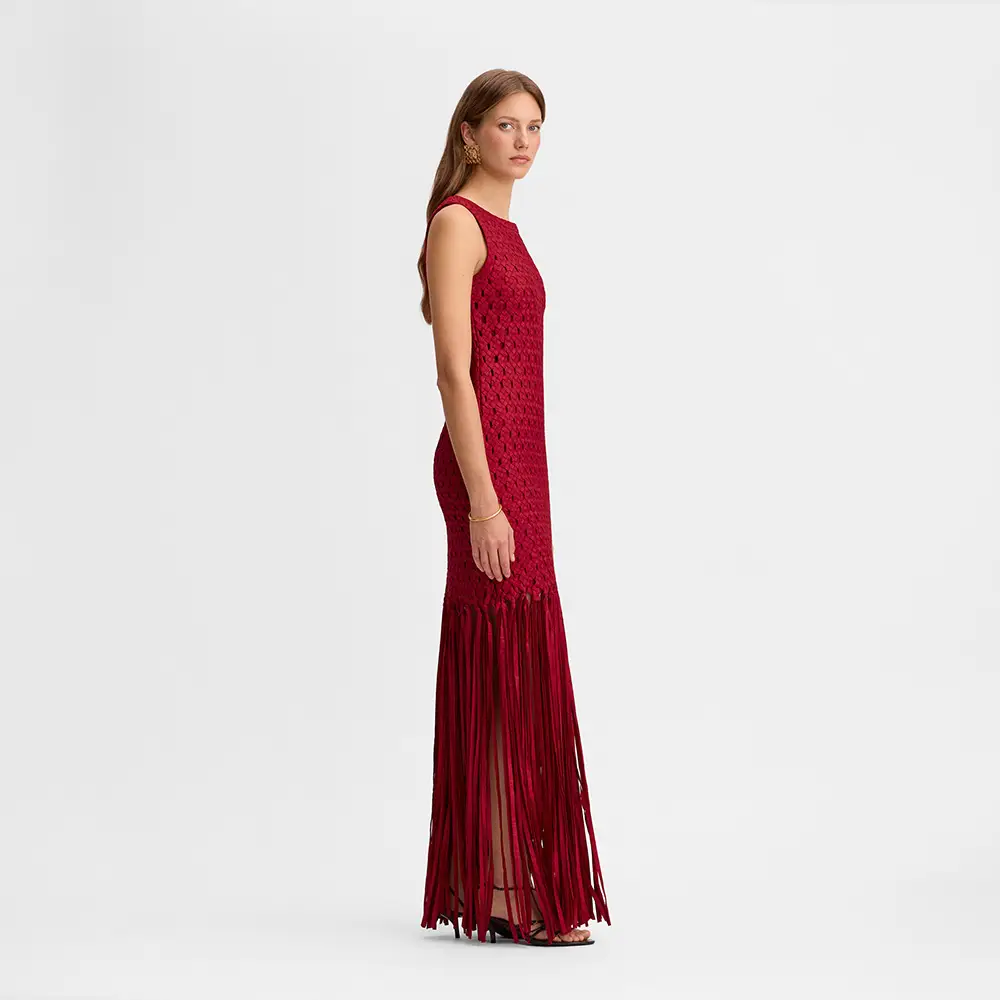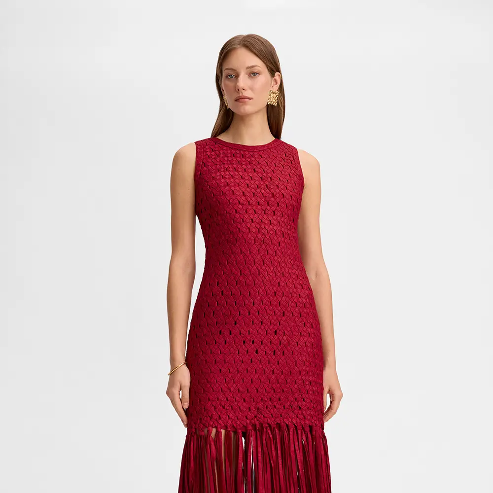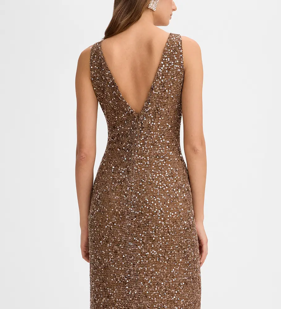 Los flecos y las plumas añaden también dinamismo y teatralidad a la colección, especialmente en vestidos tipo columna que cobran vida con cada paso. Detalles pensados para acompañar el movimiento del cuerpo y reforzar la dimensión sensorial de las prendas, convirtiendo cada look en una experiencia visual.