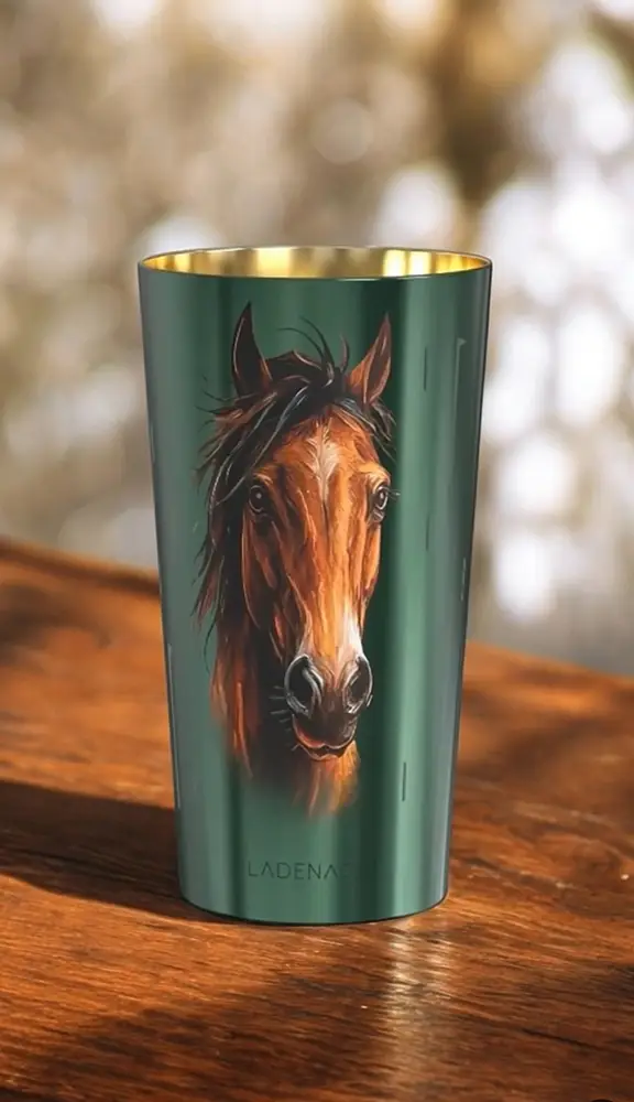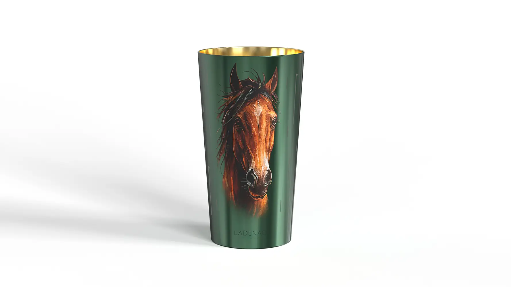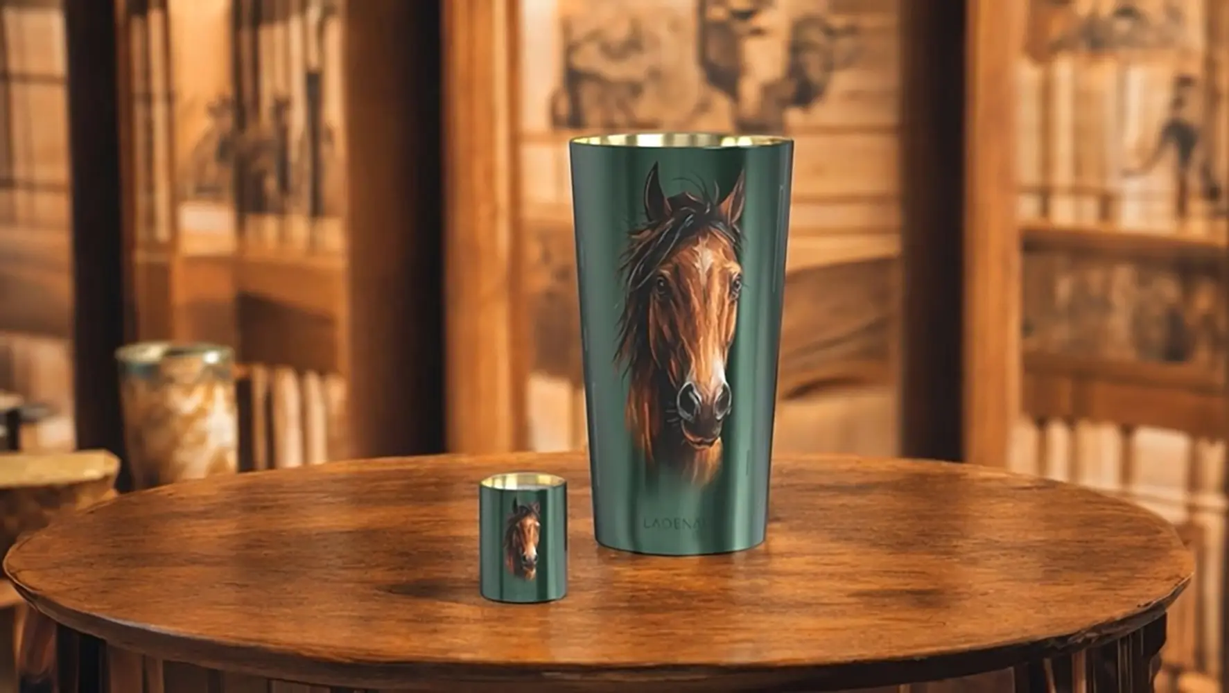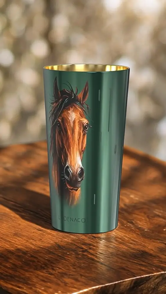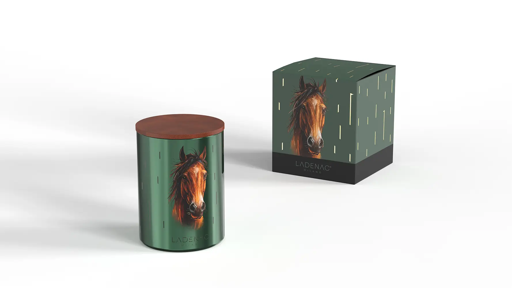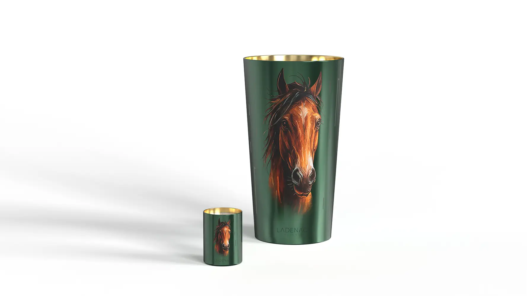 El arte del diseño. El recipiente, diseñado en un verde profundo, rinde homenaje a la vegetación exuberante del continente africano. El caballo, majestuoso y pintado a mano, parece emerger de las llanuras doradas. El interior dorado del vaso evoca los reflejos del sol poniente sobre las extensiones africanas. Gracias a una precisa técnica láser, la silueta del caballo se insinúa con la luz de la llama, apareciendo lentamente como un espíritu que cobra vida, en un diálogo íntimo entre fuego, perfume y materia. La pieza se completa con una tapa de cuero, un detalle noble que refuerza su carácter artesanal y su estética sofisticada.