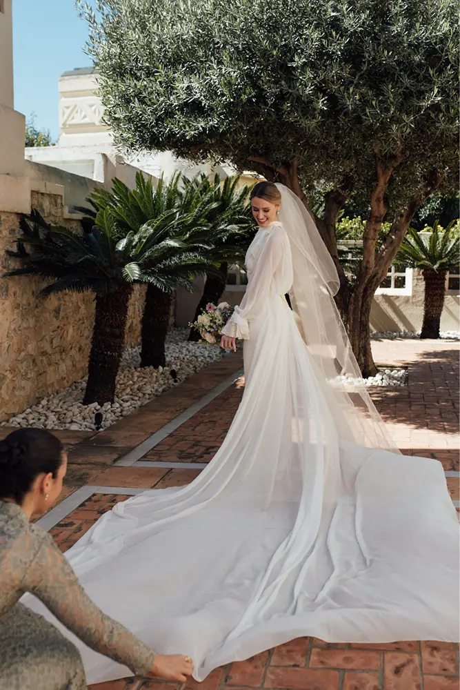 La naturaleza cambiante de la primavera también condiciona el diseño. Y lo hace de forma que la versatilidad se convierte en una aliada fundamental, donde las “capas sutiles o piezas que se puedan retirar, como mangas ligeras o sobrevestidos”, según explica, se convierten en soluciones que permiten adaptar el vestido a las distintas horas del día y a los cambios de temperatura sin perder coherencia estética y sumándonos a la tendencia de los vestidos desmontables por los que, cada vez, la novia millennial apuesta más.