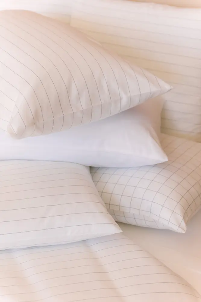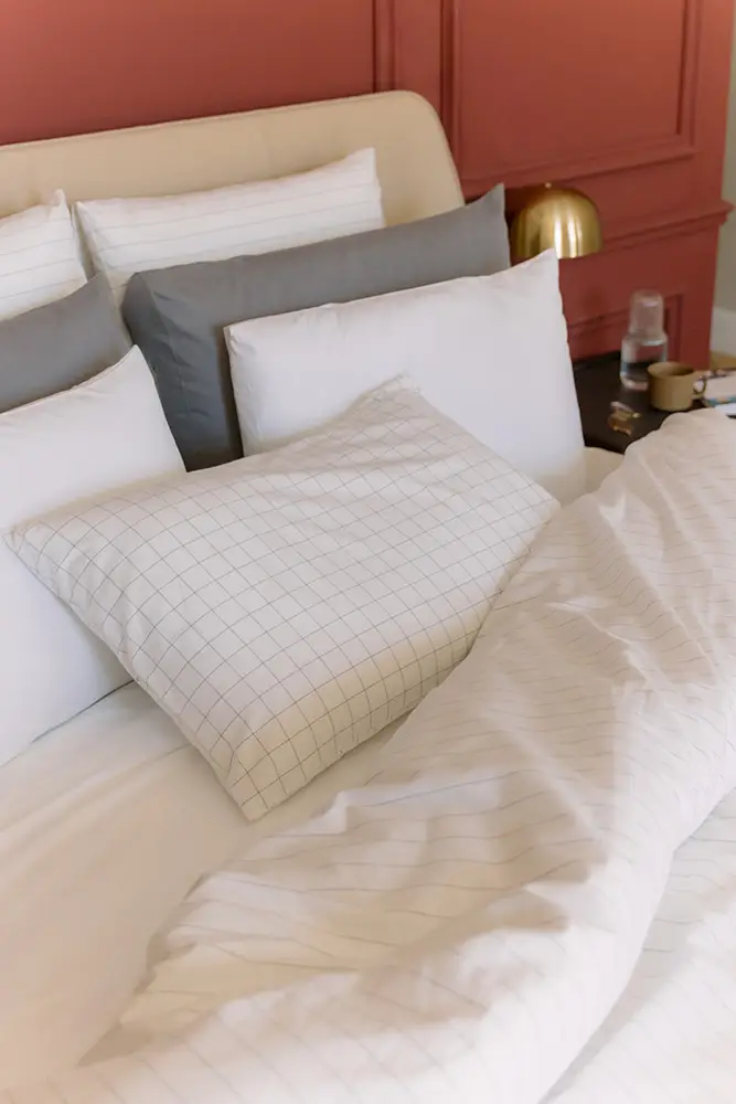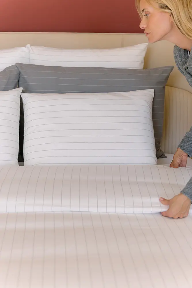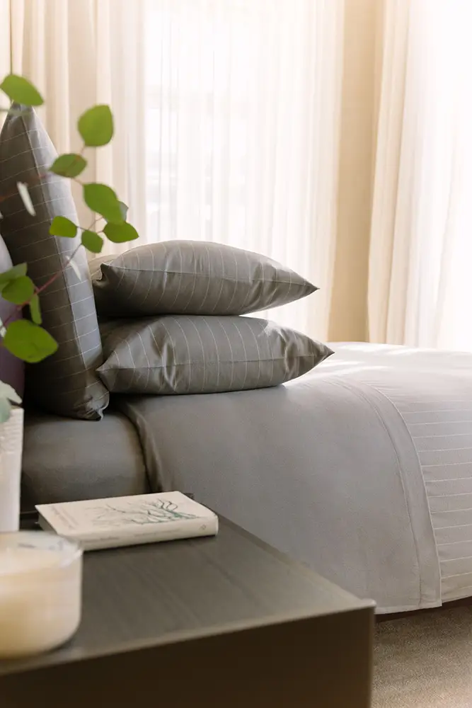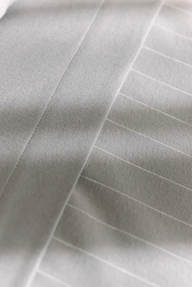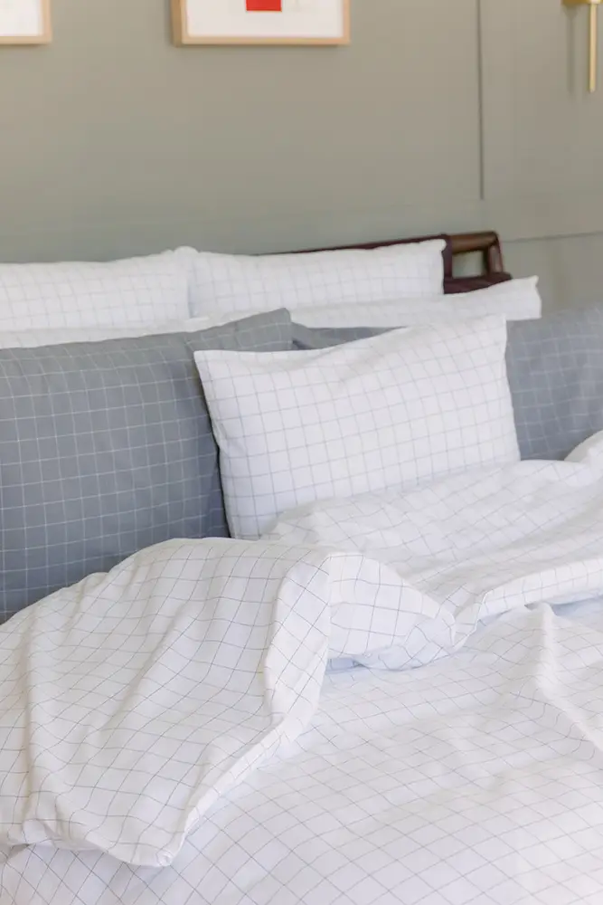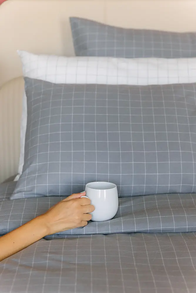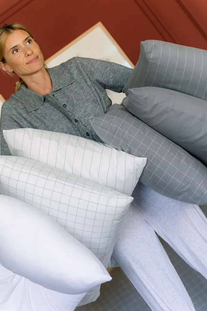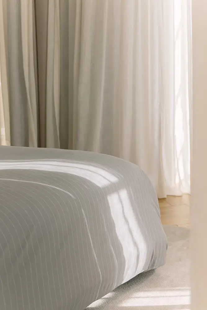 La colección presenta patrones minimalistas de rayas y cuadros, disponibles en blanco y gris, combinando un diseño atemporal con la estética acogedora del invierno. Incluye funda nórdica, sábana encimera, sábana ajustable y fundas de almohada. Esta mezcla de rayas, cuadros y piezas lisas permite infinitas combinaciones, creando conjuntos armoniosos y versátiles que se adaptan a diferentes estilos de dormitorio. Cada funda nórdica incluye botones translúcidos discretamente ocultos, que garantizan un acabado elegante.