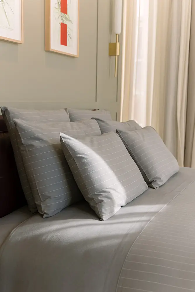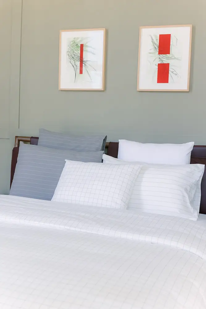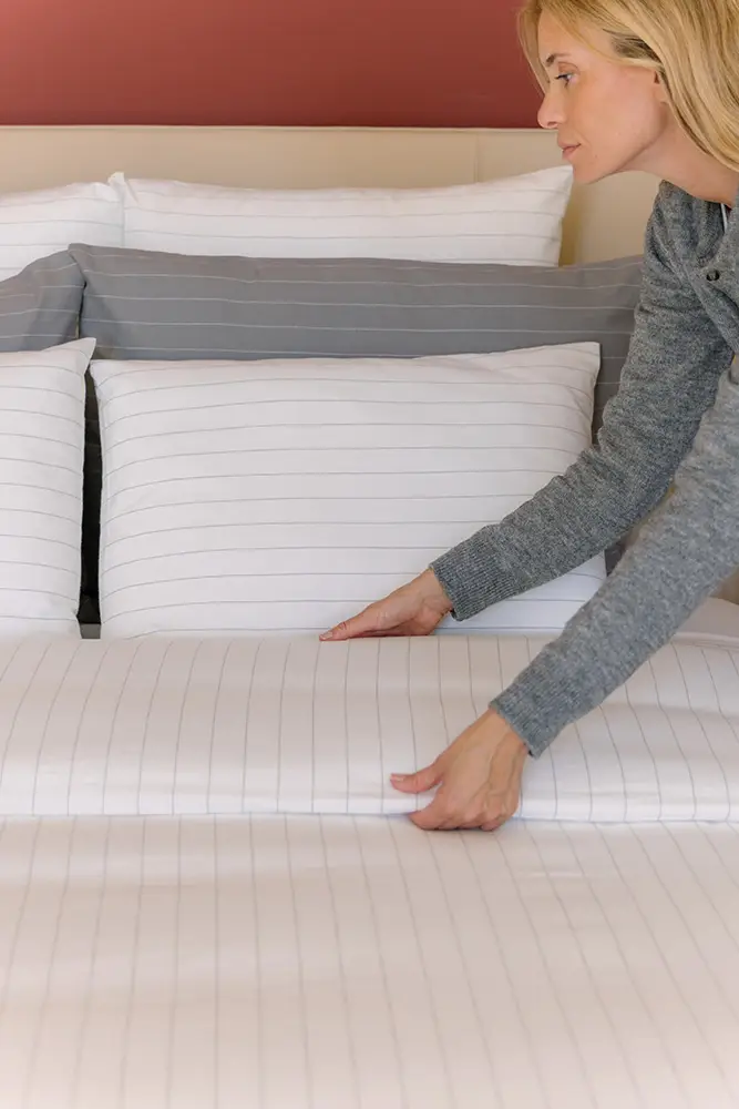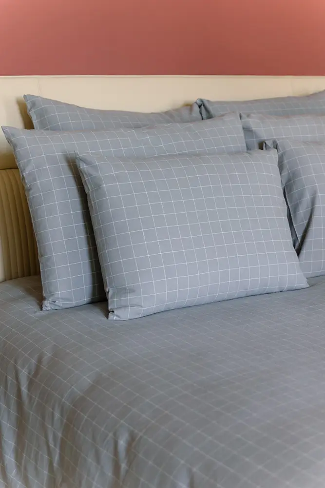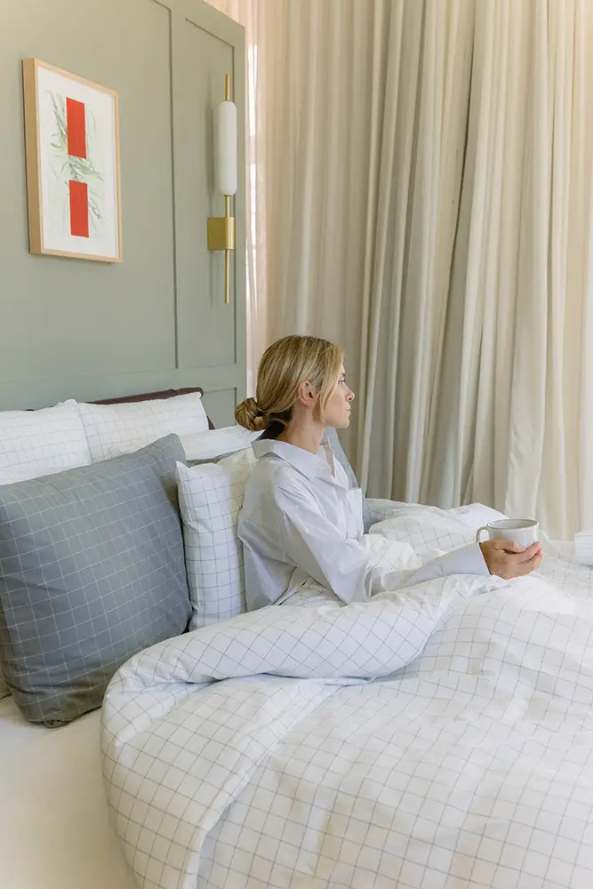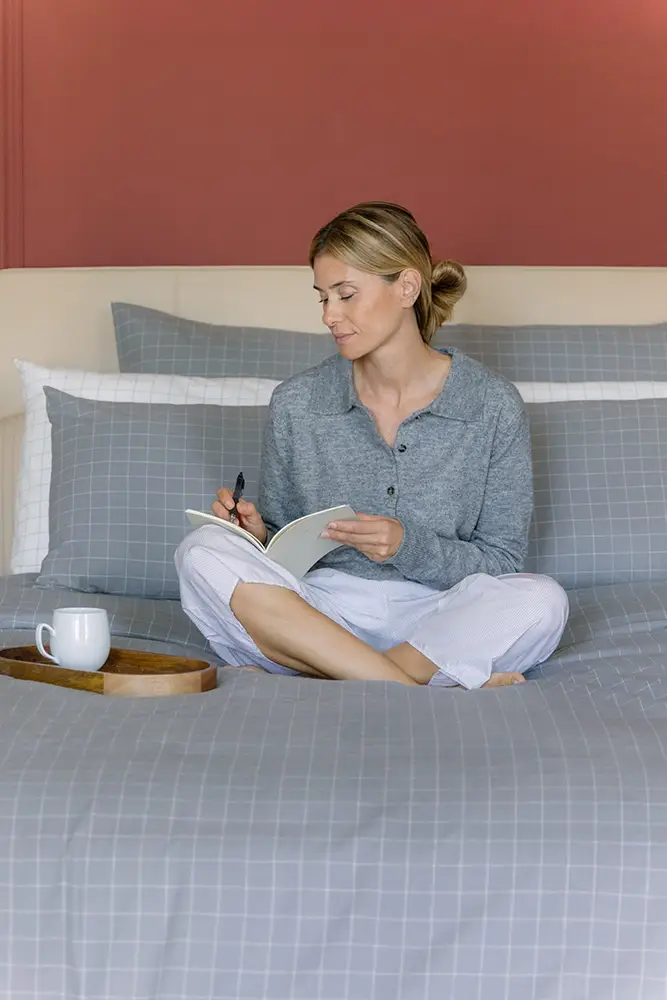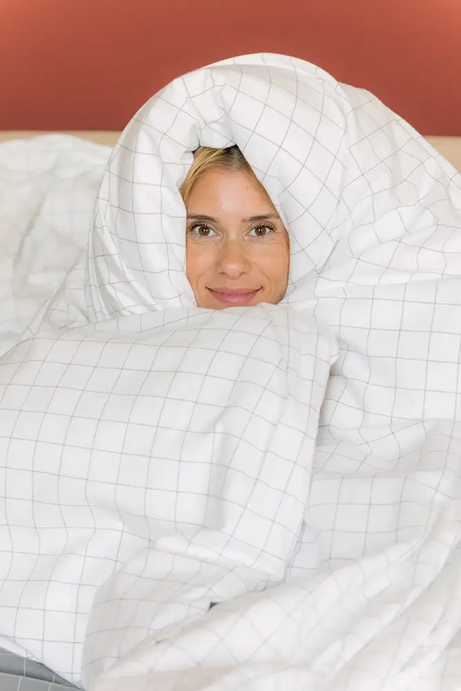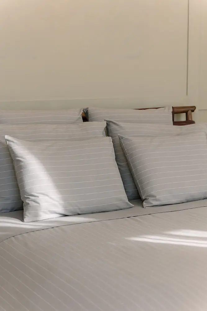 La colección presenta patrones minimalistas de rayas y cuadros, disponibles en blanco y gris, combinando un diseño atemporal con la estética acogedora del invierno. Incluye funda nórdica, sábana encimera, sábana ajustable y fundas de almohada. Esta mezcla de rayas, cuadros y piezas lisas permite infinitas combinaciones, creando conjuntos armoniosos y versátiles que se adaptan a diferentes estilos de dormitorio. Cada funda nórdica incluye botones translúcidos discretamente ocultos, que garantizan un acabado elegante.
