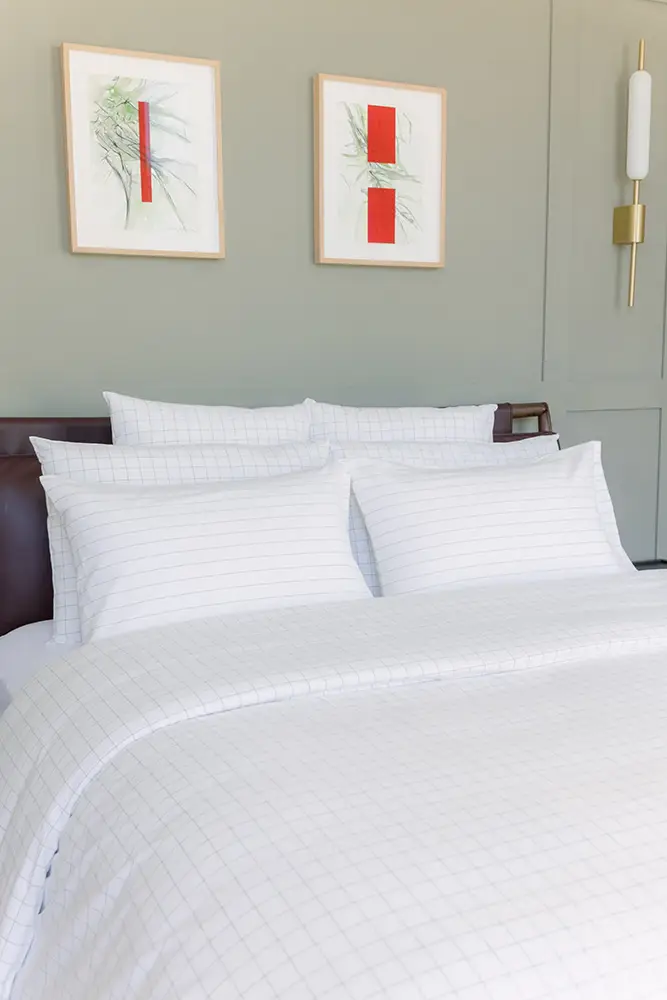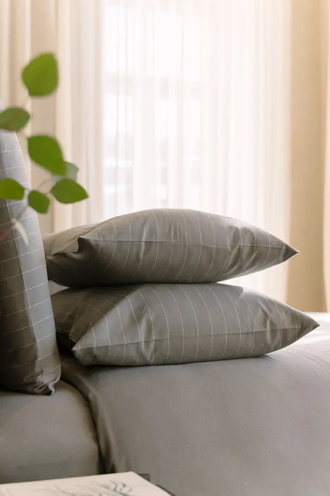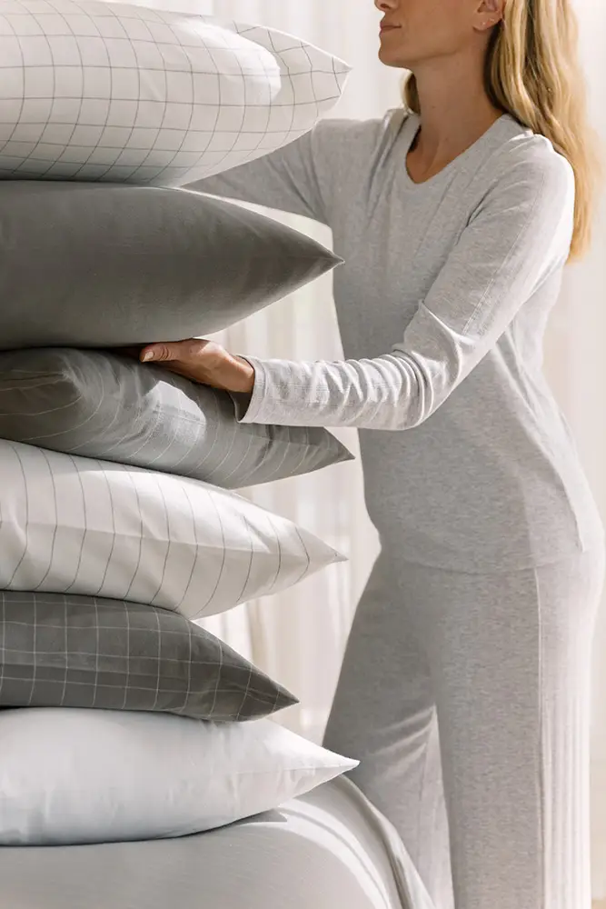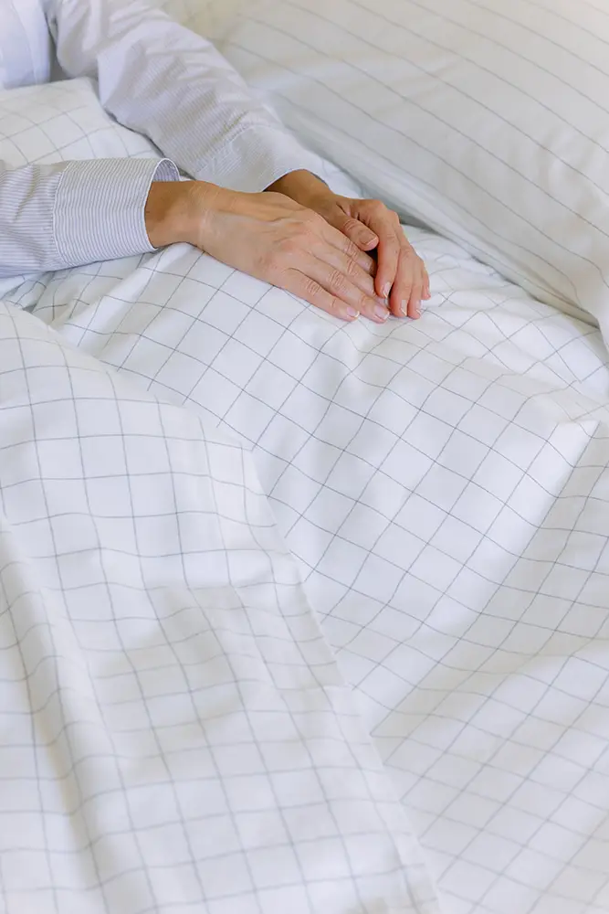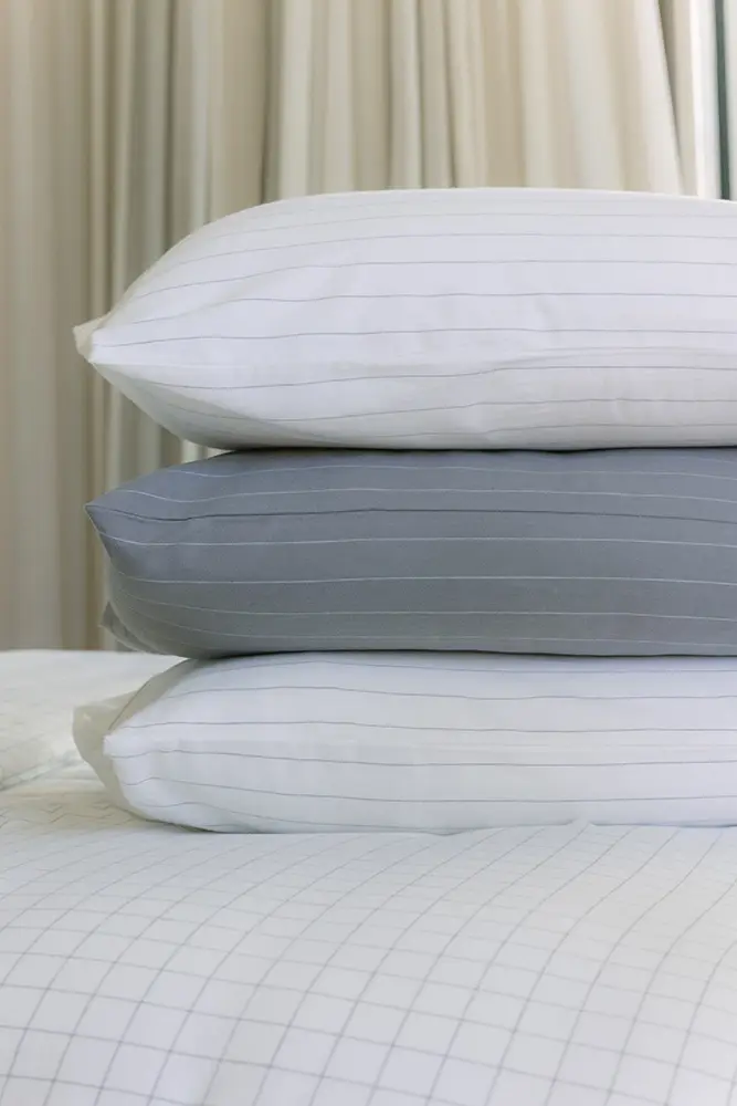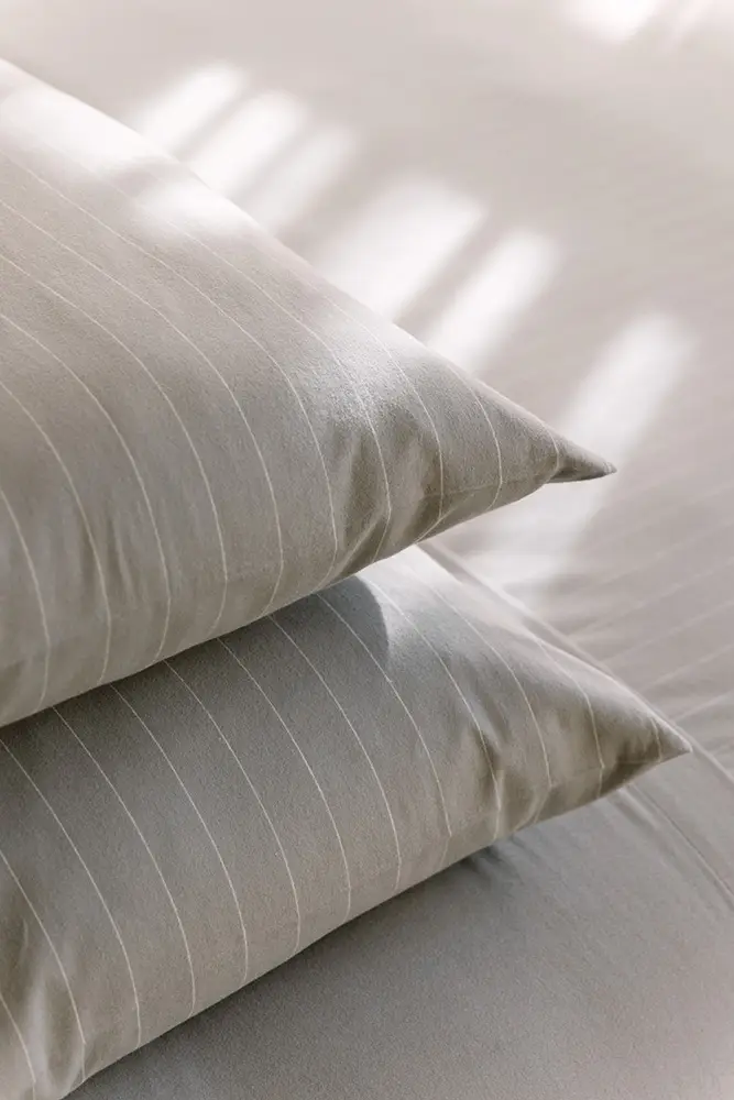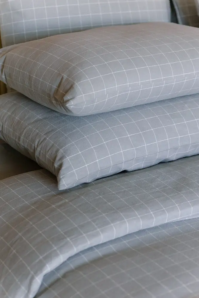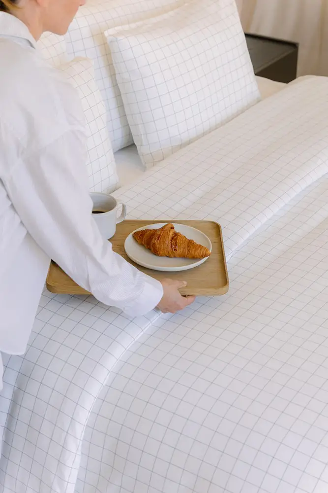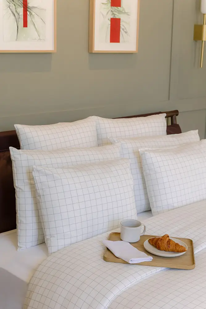 La colección presenta patrones minimalistas de rayas y cuadros, disponibles en blanco y gris, combinando un diseño atemporal con la estética acogedora del invierno. Incluye funda nórdica, sábana encimera, sábana ajustable y fundas de almohada. Esta mezcla de rayas, cuadros y piezas lisas permite infinitas combinaciones, creando conjuntos armoniosos y versátiles que se adaptan a diferentes estilos de dormitorio. Cada funda nórdica incluye botones translúcidos discretamente ocultos, que garantizan un acabado elegante.
