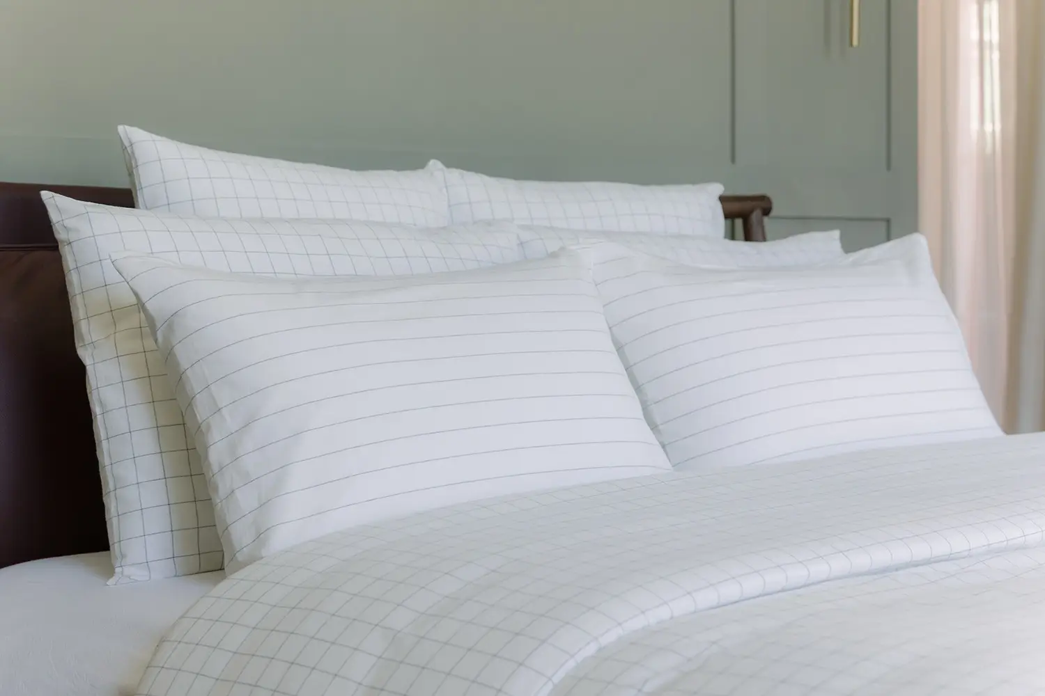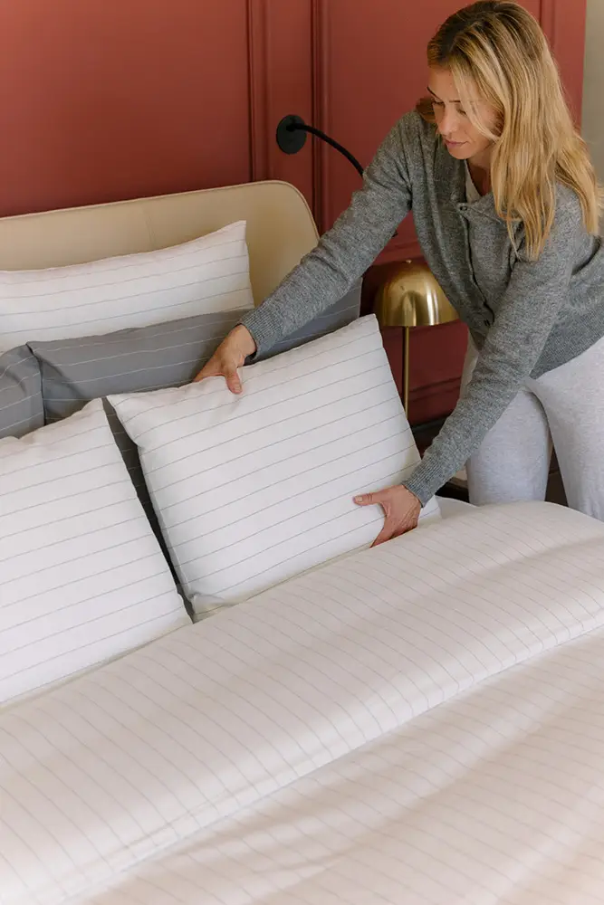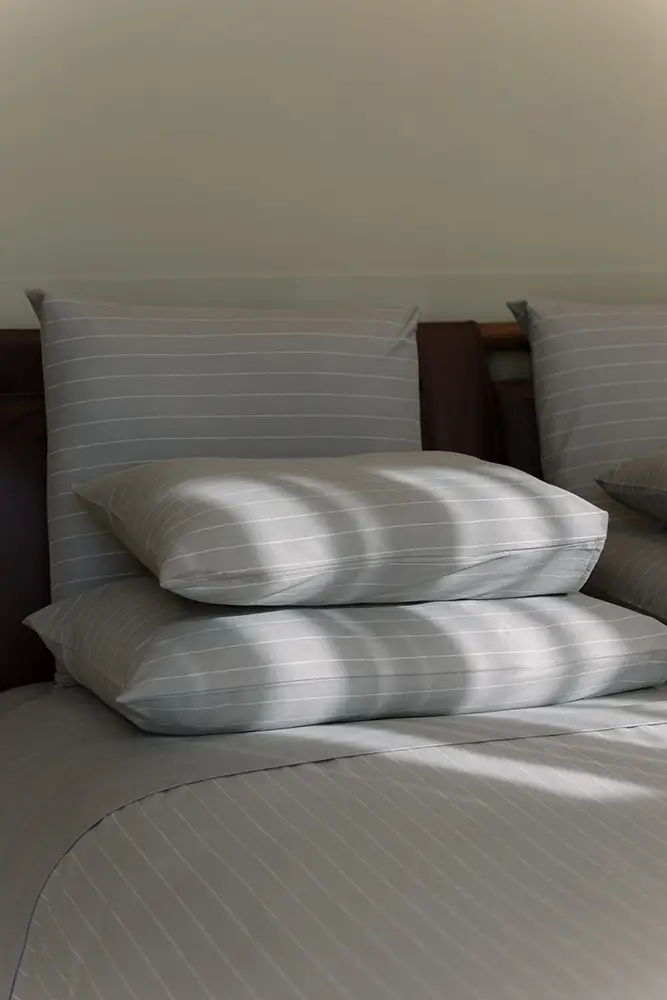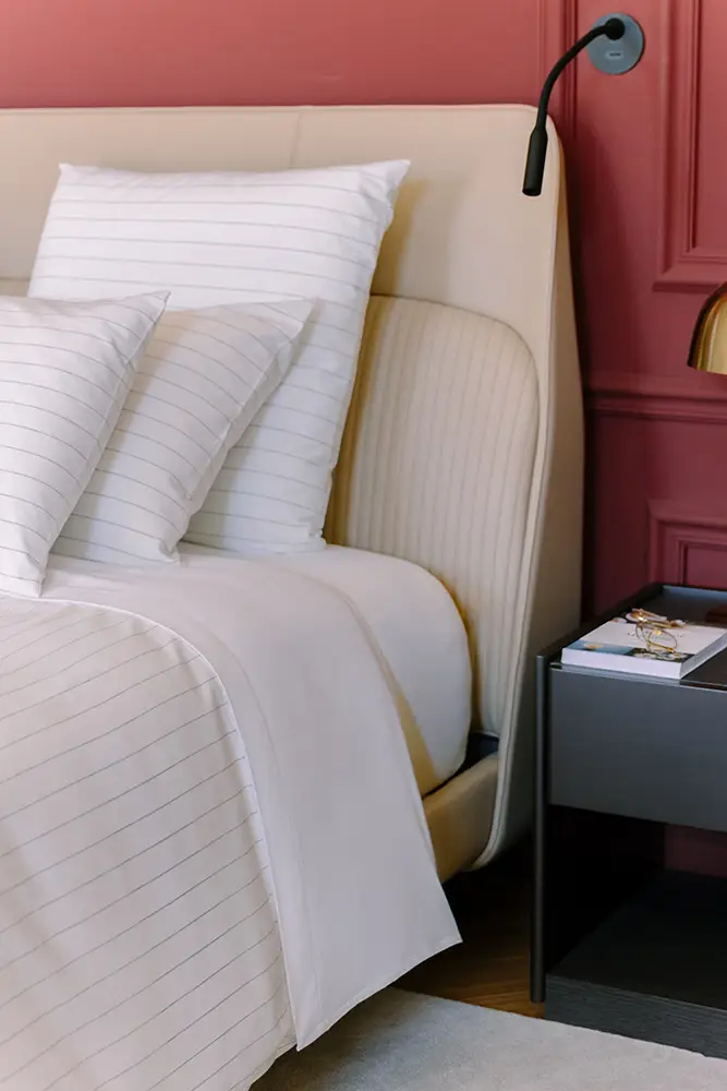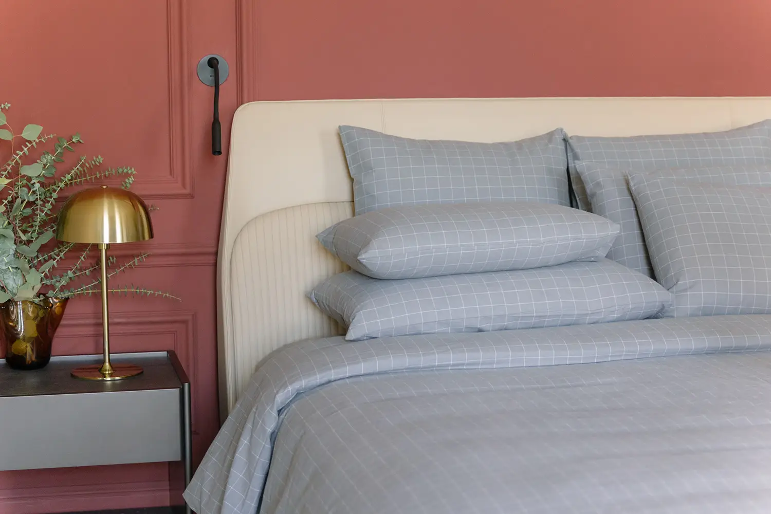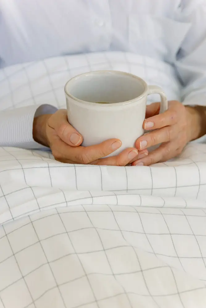 La colección presenta patrones minimalistas de rayas y cuadros, disponibles en blanco y gris, combinando un diseño atemporal con la estética acogedora del invierno. Incluye funda nórdica, sábana encimera, sábana ajustable y fundas de almohada. Esta mezcla de rayas, cuadros y piezas lisas permite infinitas combinaciones, creando conjuntos armoniosos y versátiles que se adaptan a diferentes estilos de dormitorio. Cada funda nórdica incluye botones translúcidos discretamente ocultos, que garantizan un acabado elegante.