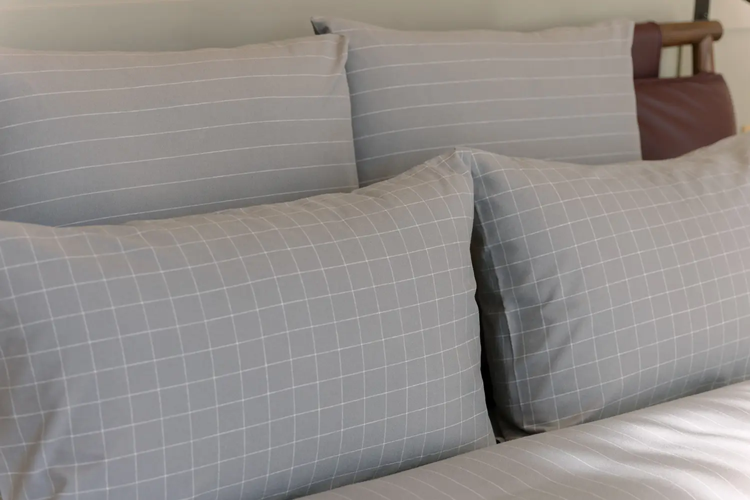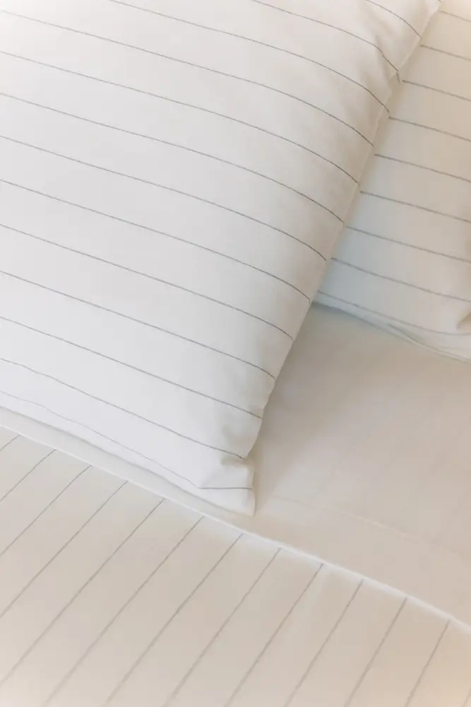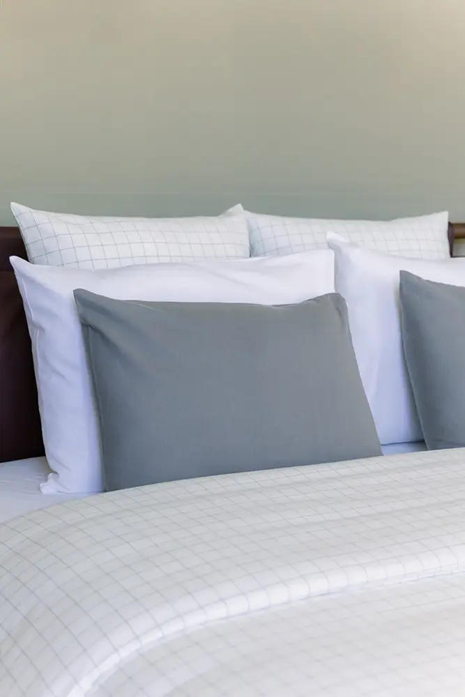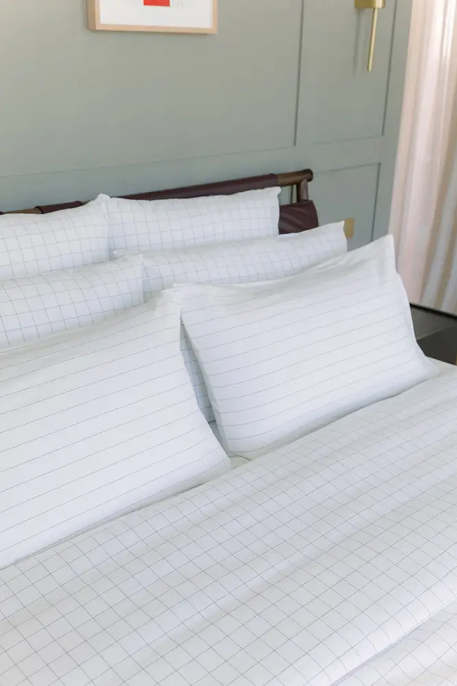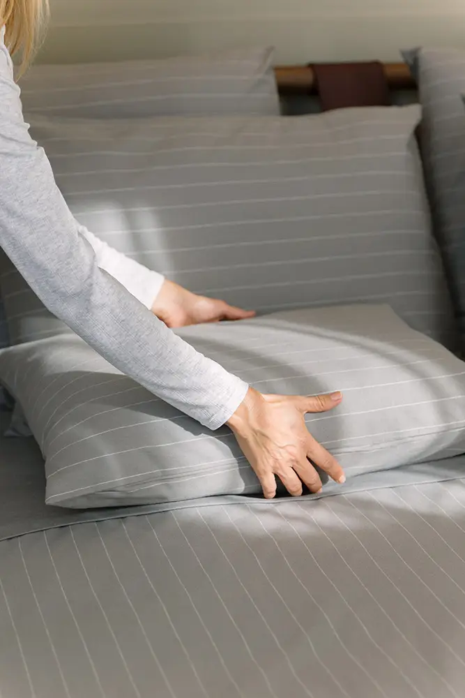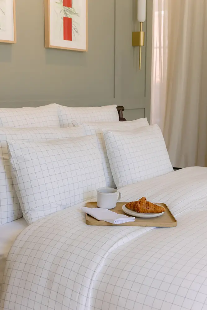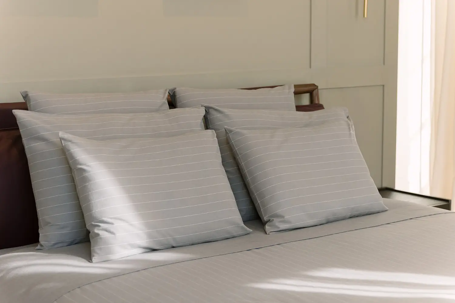 La colección presenta patrones minimalistas de rayas y cuadros, disponibles en blanco y gris, combinando un diseño atemporal con la estética acogedora del invierno. Incluye funda nórdica, sábana encimera, sábana ajustable y fundas de almohada. Esta mezcla de rayas, cuadros y piezas lisas permite infinitas combinaciones, creando conjuntos armoniosos y versátiles que se adaptan a diferentes estilos de dormitorio. Cada funda nórdica incluye botones translúcidos discretamente ocultos, que garantizan un acabado elegante.