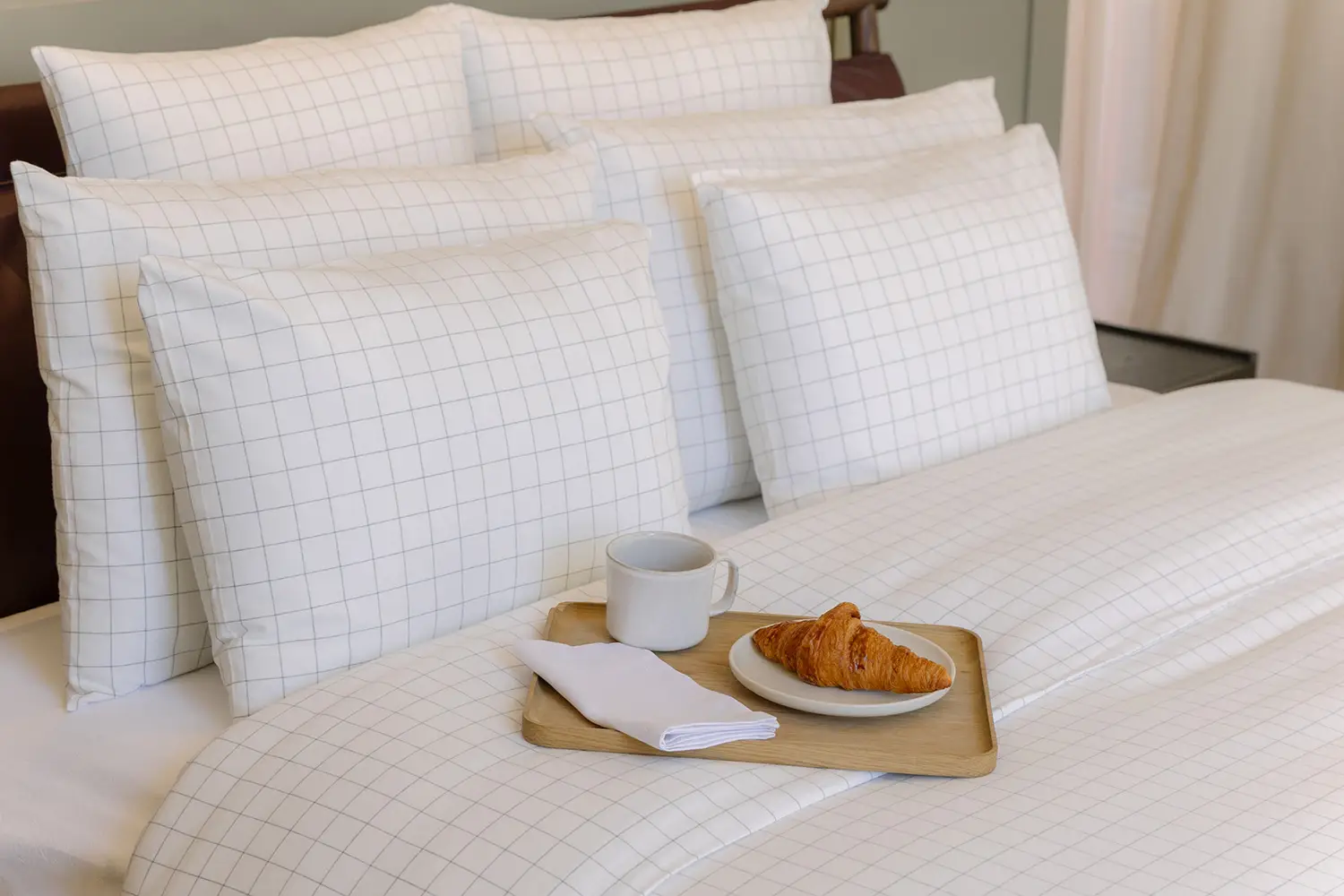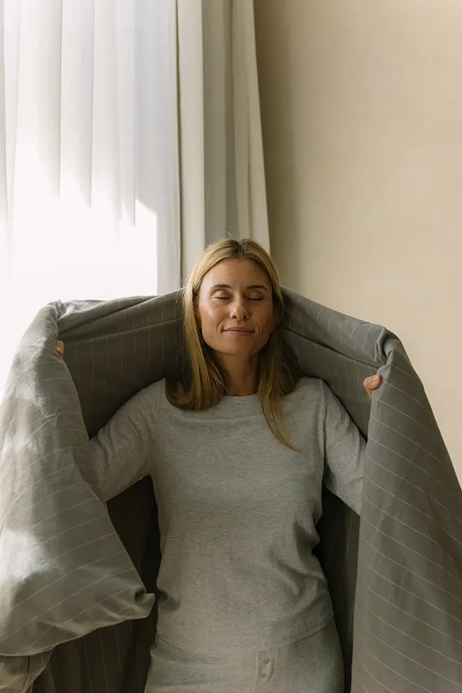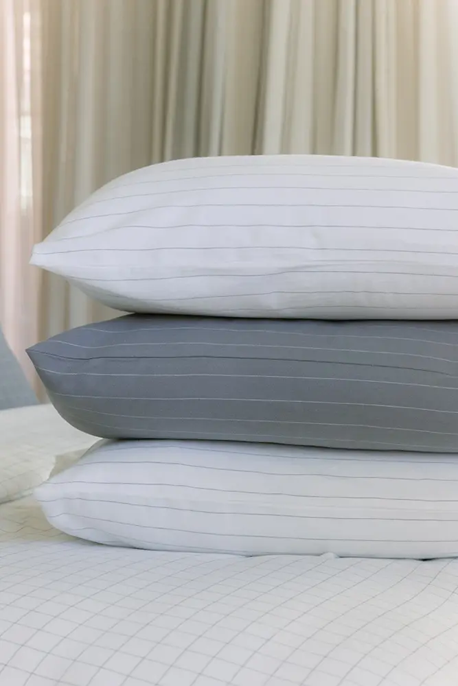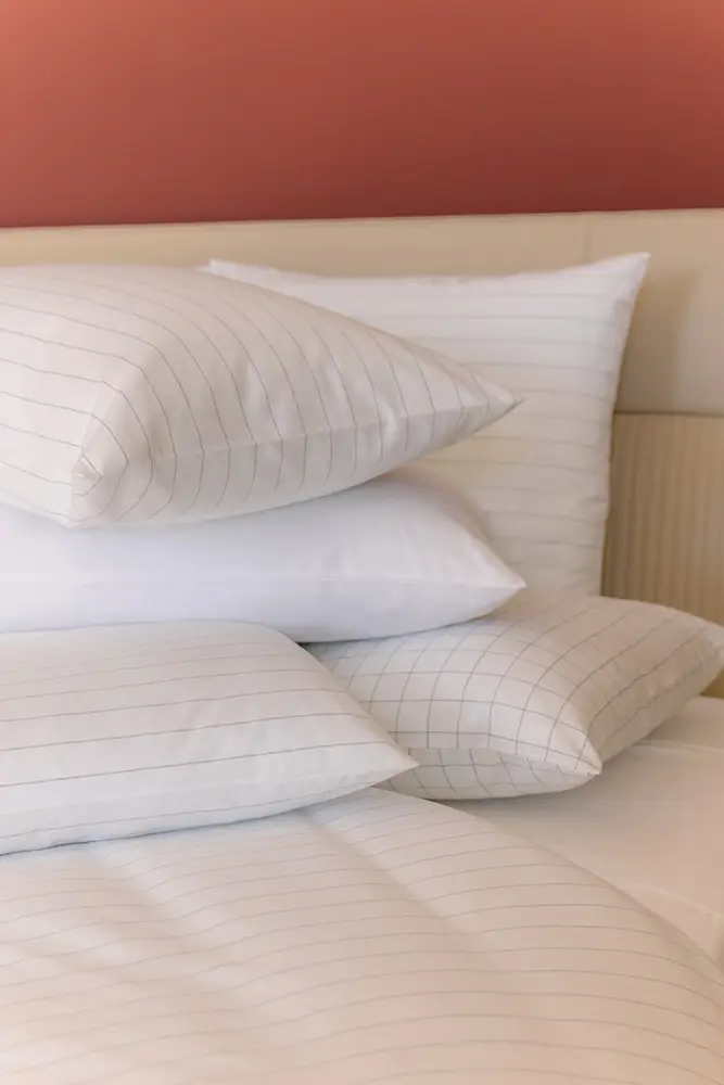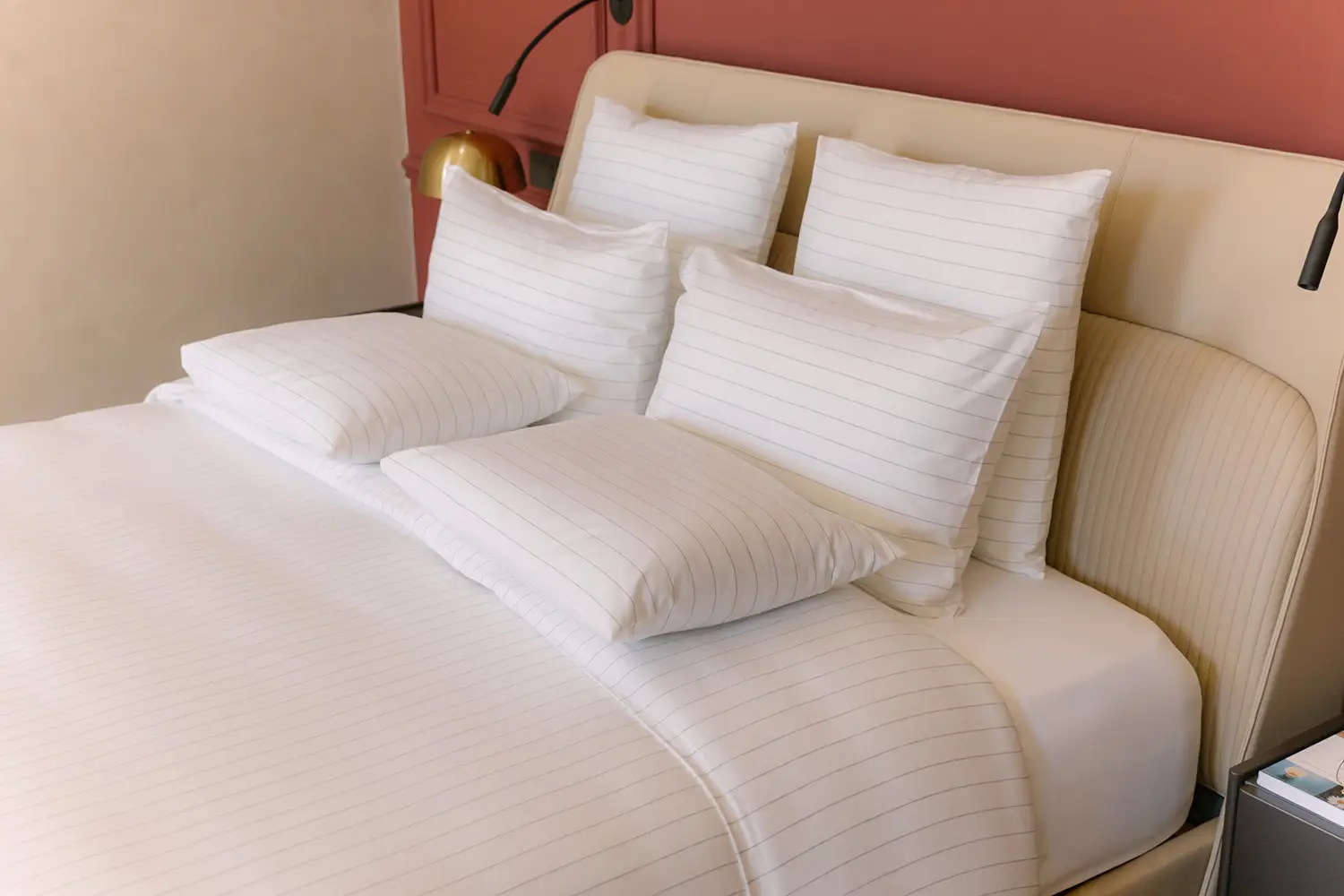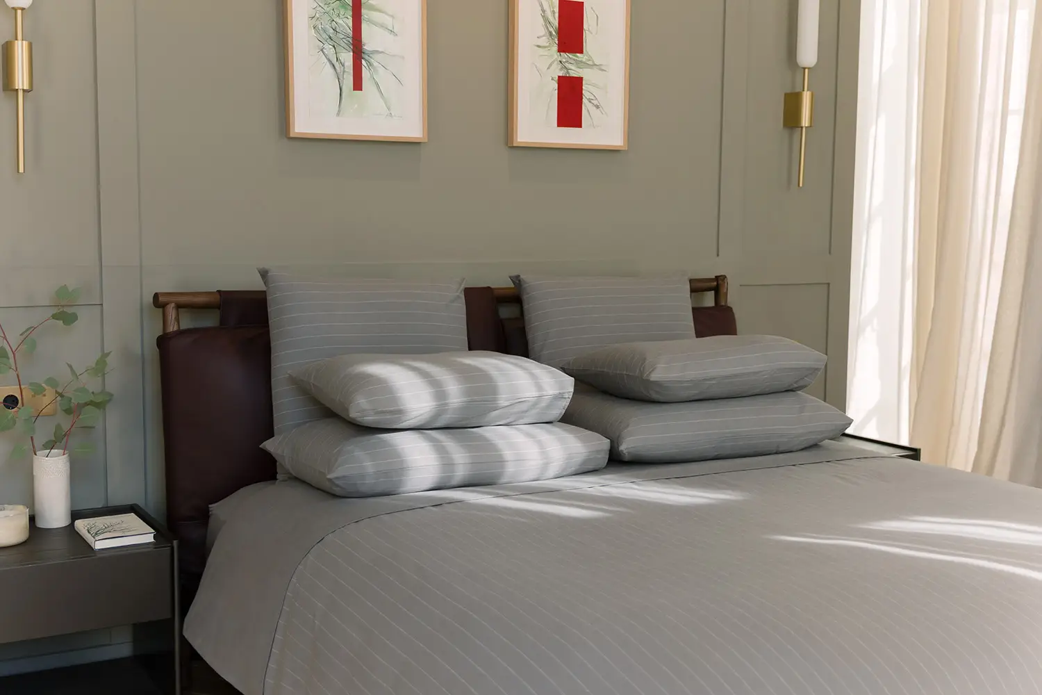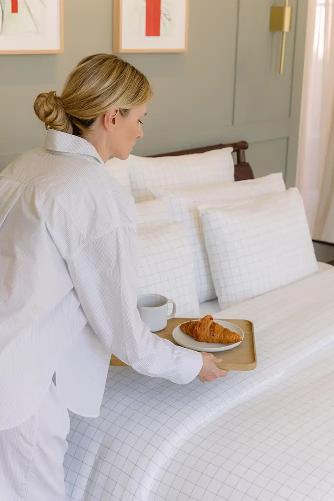 La colección presenta patrones minimalistas de rayas y cuadros, disponibles en blanco y gris, combinando un diseño atemporal con la estética acogedora del invierno. Incluye funda nórdica, sábana encimera, sábana ajustable y fundas de almohada. Esta mezcla de rayas, cuadros y piezas lisas permite infinitas combinaciones, creando conjuntos armoniosos y versátiles que se adaptan a diferentes estilos de dormitorio. Cada funda nórdica incluye botones translúcidos discretamente ocultos, que garantizan un acabado elegante.