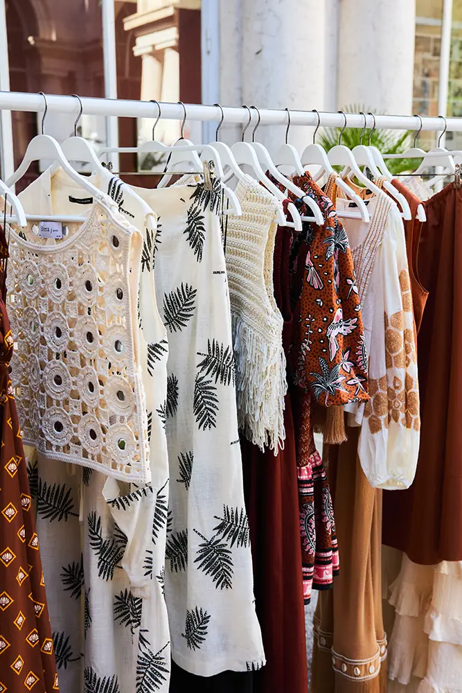 El contraste entre lo etéreo y lo terrenal se manifiesta en la combinación de texturas y acabados: bordados artesanales, tejidos livianos y estructuras definidas crean un juego de opuestos que conviven con naturalidad. Las rayas, los encajes y los volantes refuerzan una estética que transita entre la serenidad y la energía vibrante, entre la fluidez de las brisas marinas y la intensidad de los paisajes áridos.