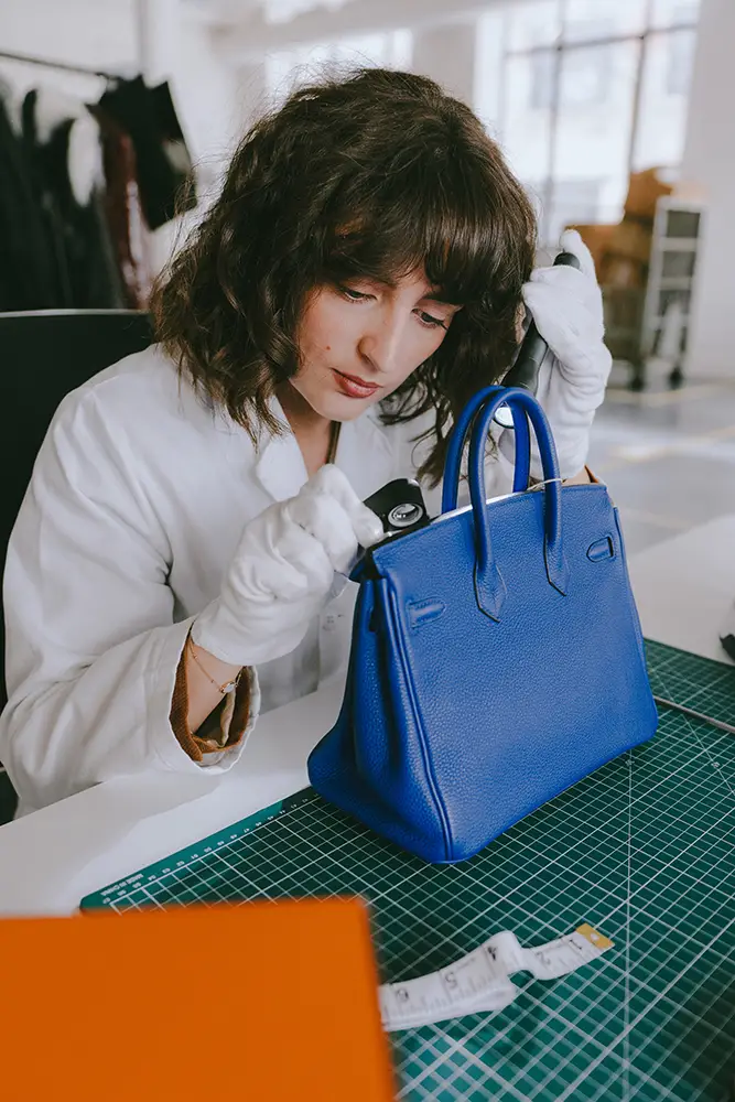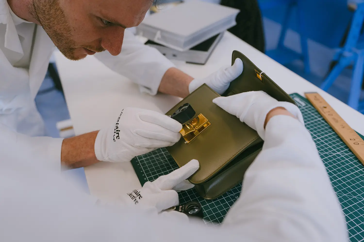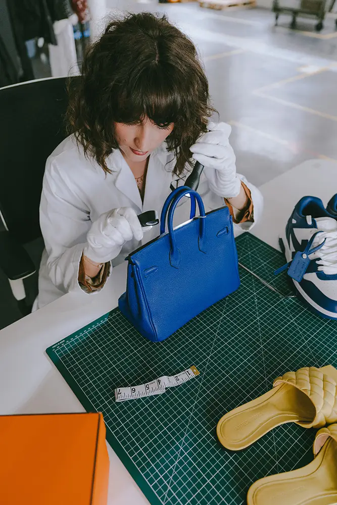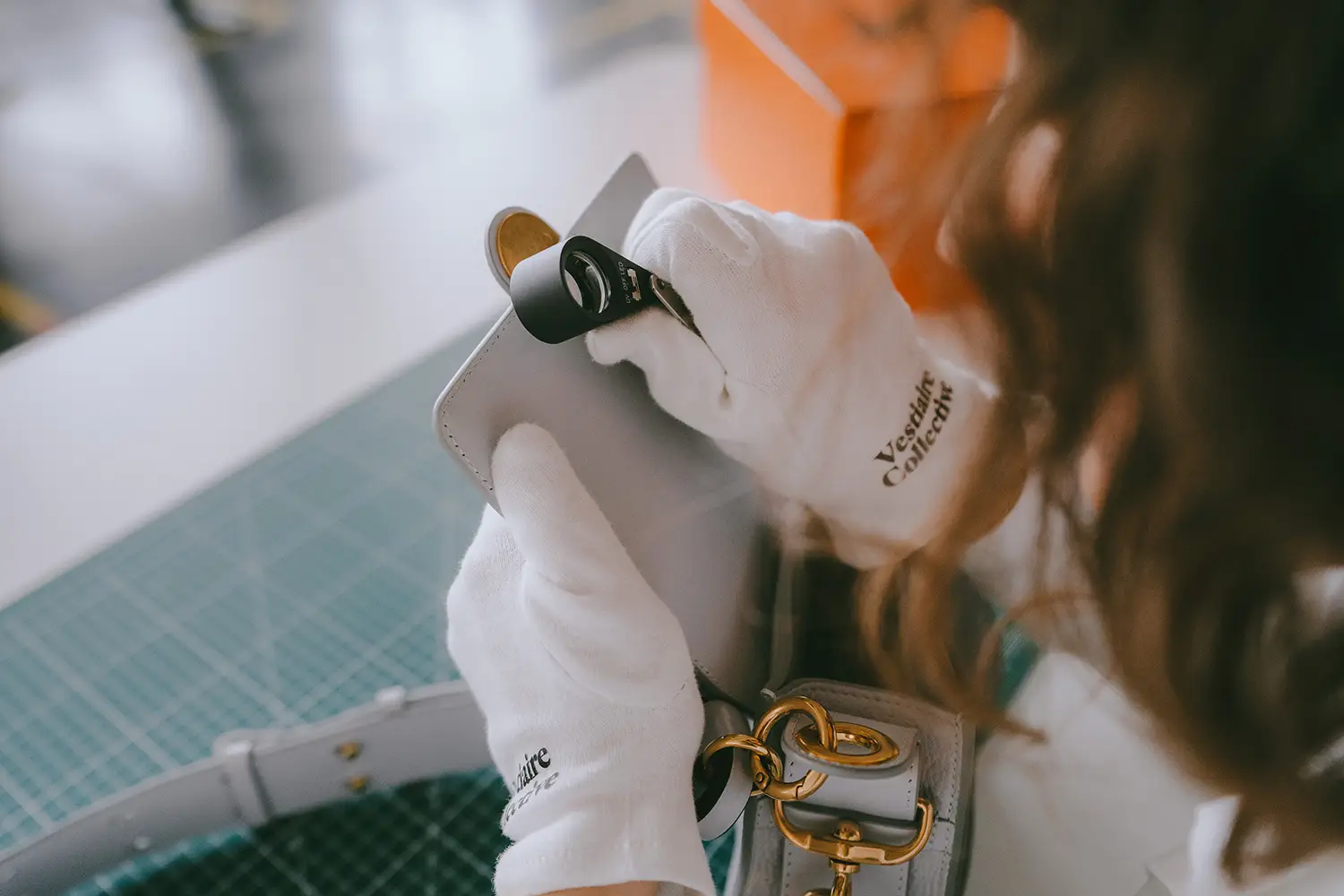 - Autentificación física: cada artículo que se aprueba durante el proceso de comprobación digital y pasa a autentificación física se examina en persona de la mano de especialistas formados. Estos expertos reciben su formación en la academia interna de la lucha contra la falsificación de Vestiaire Collective, donde se valen de herramientas y tecnologías que les proporciona la marca para validar la autenticidad del material, la confección y el diseño.