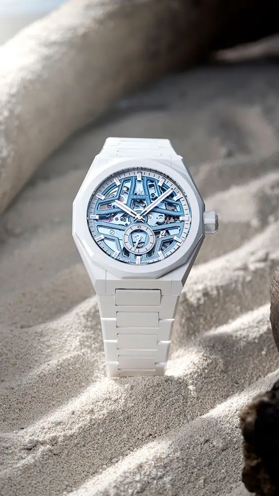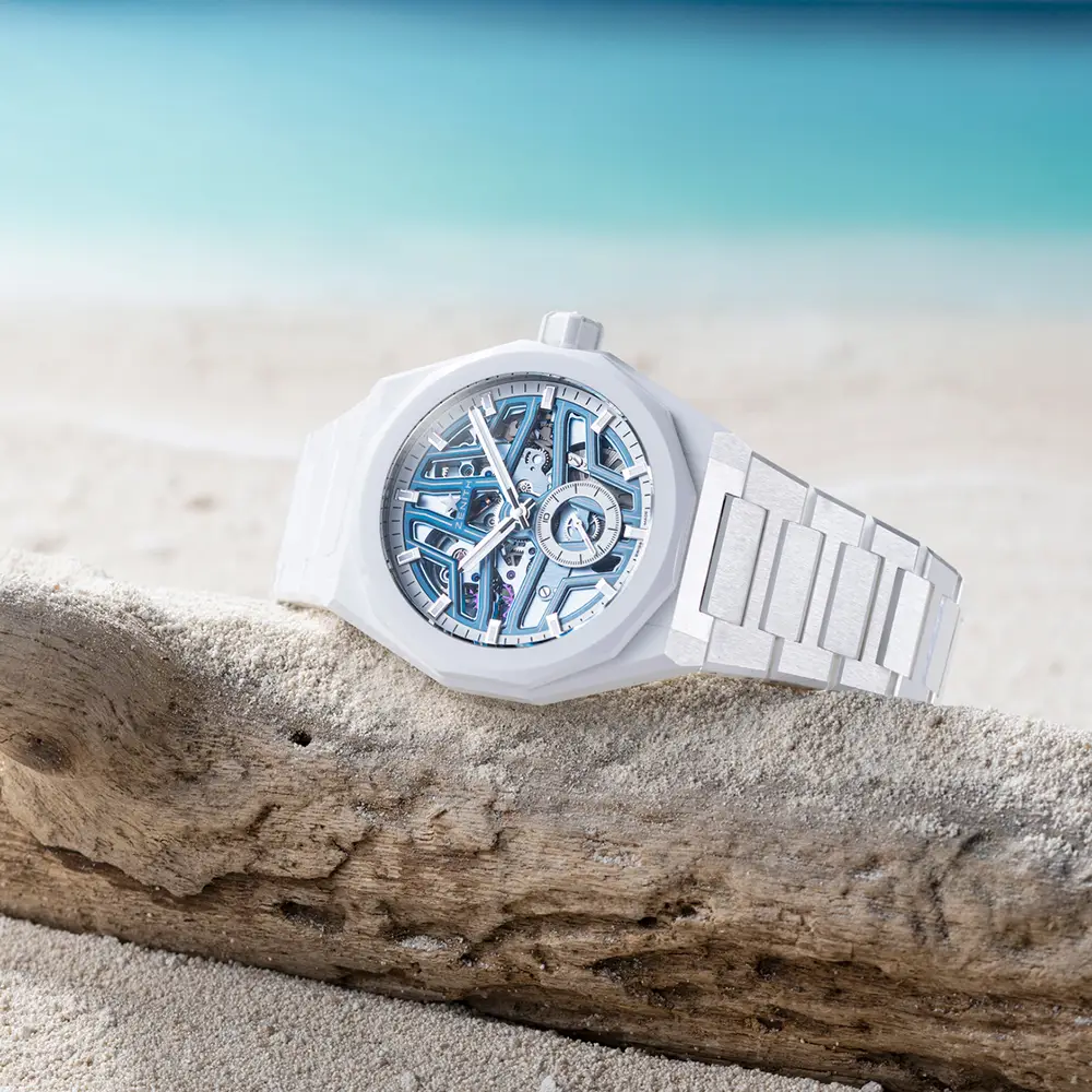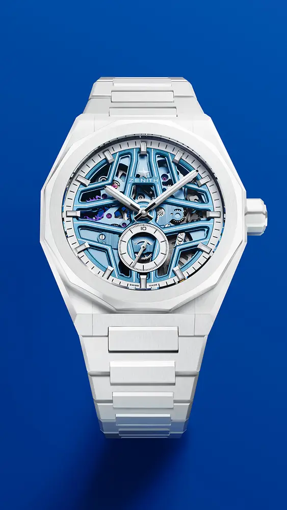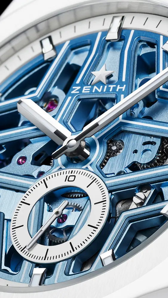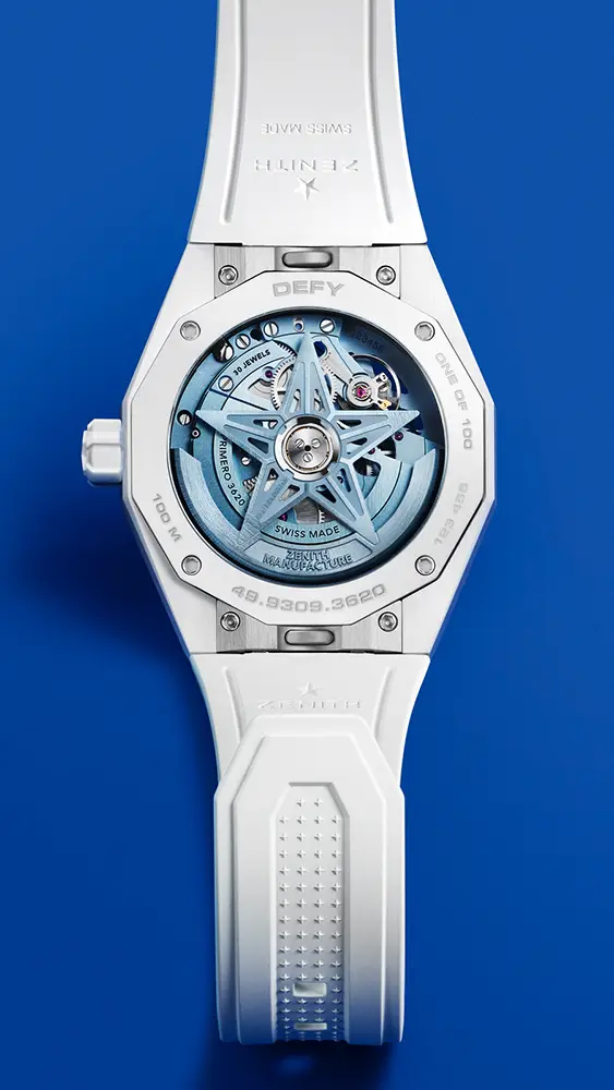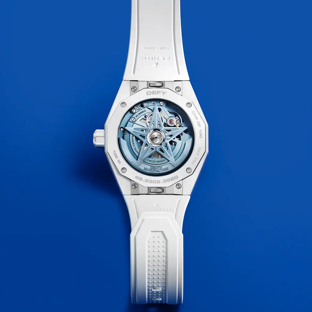 La caja de cerámica blanca y el brazalete integrado del mismo material se complementan a la perfección con la esfera abierta con degradado azul y el movimiento esqueletizado. Continuando con el concepto de las dos primeras colaboraciones de ZENITH x Time+Tide, la esfera abierta pasa de un azul más oscuro en la parte superior a un alegre azul claro en la parte inferior. Los puentes de la esfera adoptan la forma de la estrella de cinco puntas de ZENITH, que está compuesta de Super-LumiNova para aumentar el impacto visual por la noche. Se trata de una vuelta a una característica de diseño del DEFY Classic Skeleton Night Surfer original, la única otra vez en su historia que ZENITH ha incorporado un logotipo de estrella luminiscente.