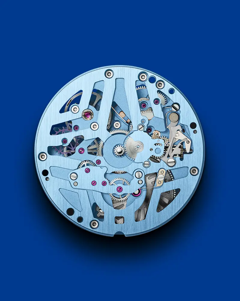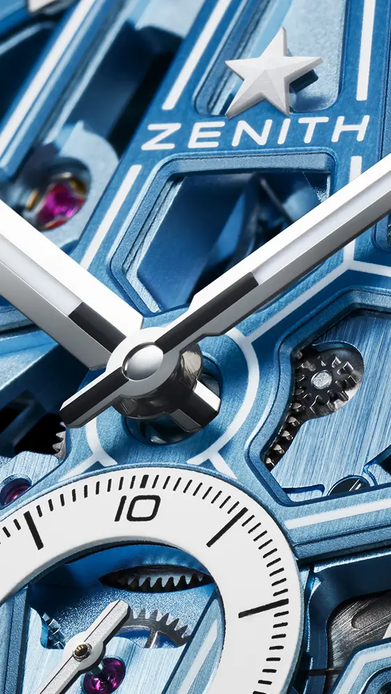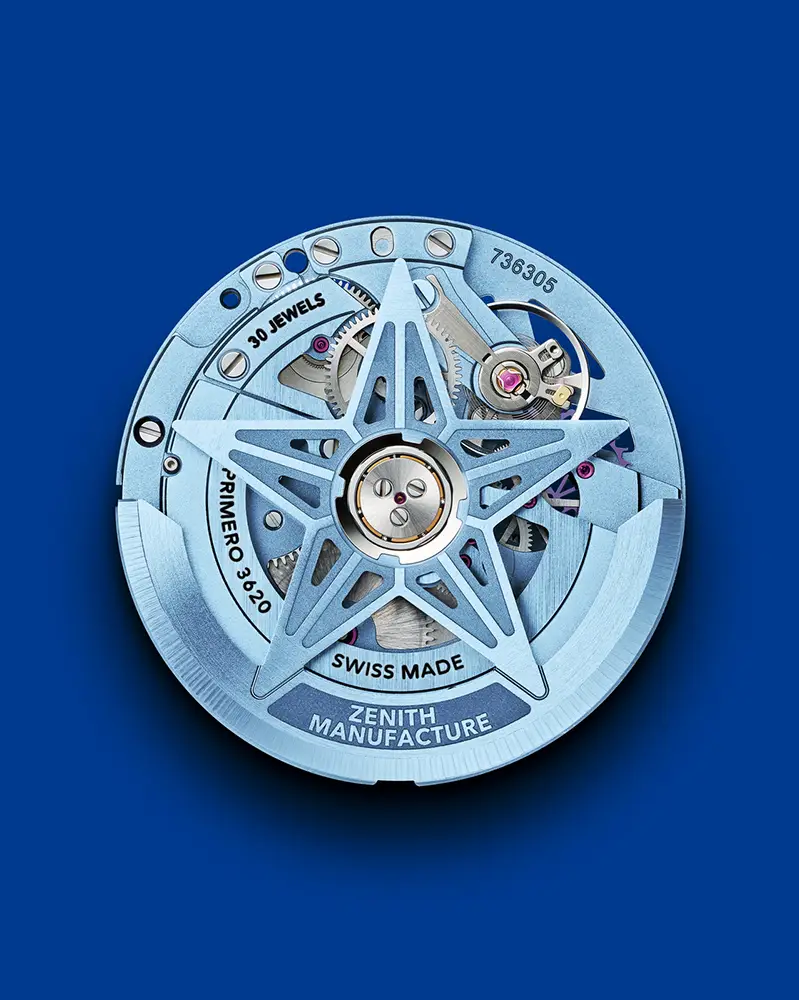 El calibre automático esqueletizado de alta frecuencia El Primero, el movimiento 3620 SK, es visible a través de la esfera abierta y del fondo de caja abierto de zafiro. Otra novedad importante es que el calibre se ha diseñado a juego con los puentes en forma de estrella, lo que ofrece al usuario un tono azul claro impecable en la esfera. Procedente del emblemático movimiento cronógrafo de alta frecuencia El Primero de ZENITH, indica las horas y los minutos, mientras que su aguja de las décimas de segundo de acciona directamente desde el escape, que late a 5 Hz (36 000 alt/h). Su mecanismo de parada del segundero permite un ajuste preciso de la hora. El mecanismo de carga automática bidireccional ofrece una reserva de marcha de 55 horas aproximadamente.